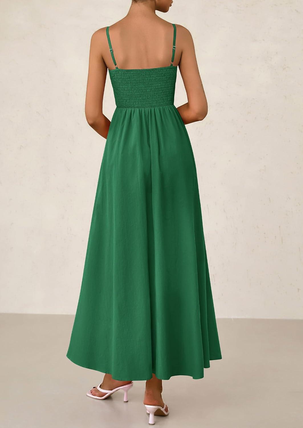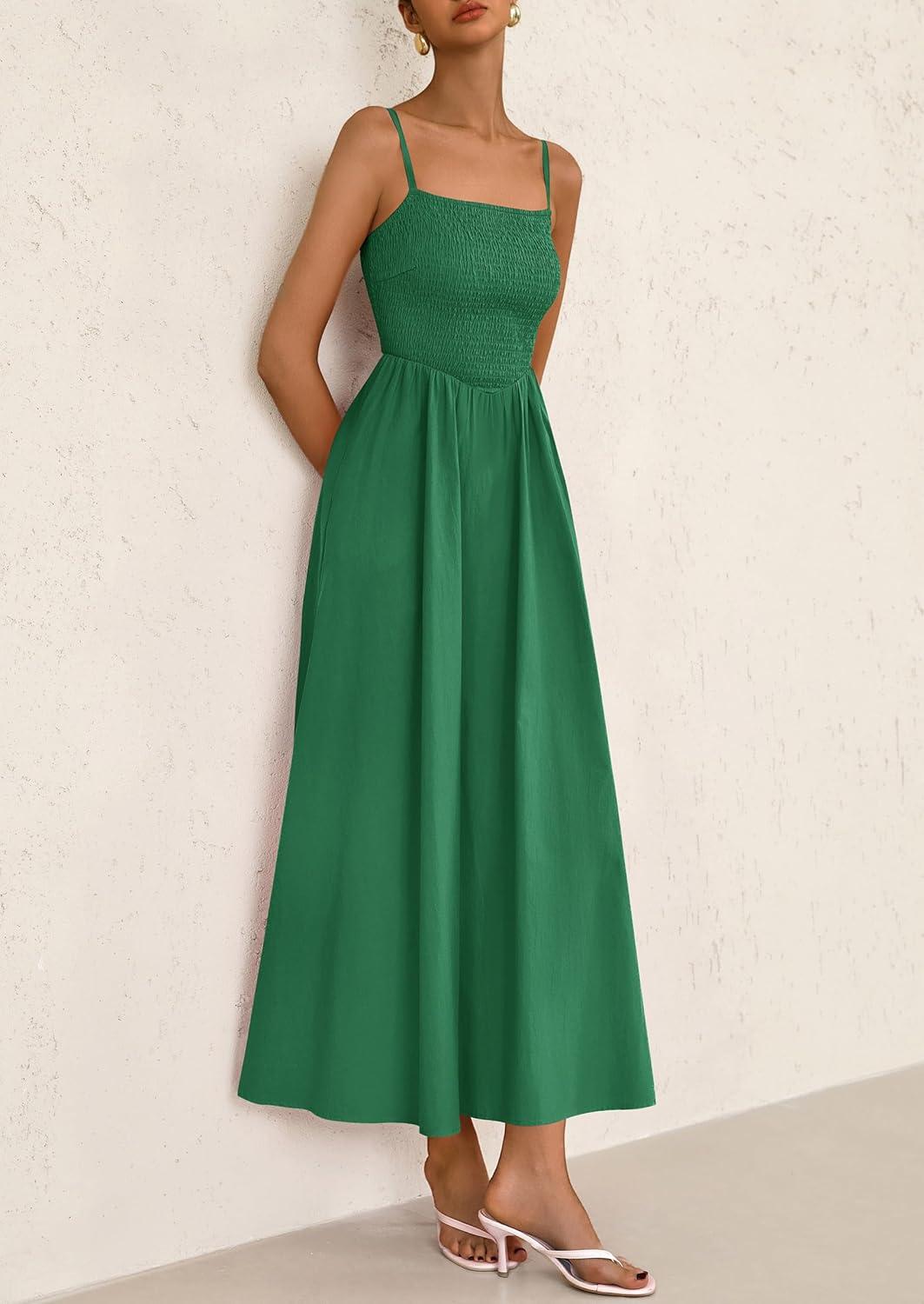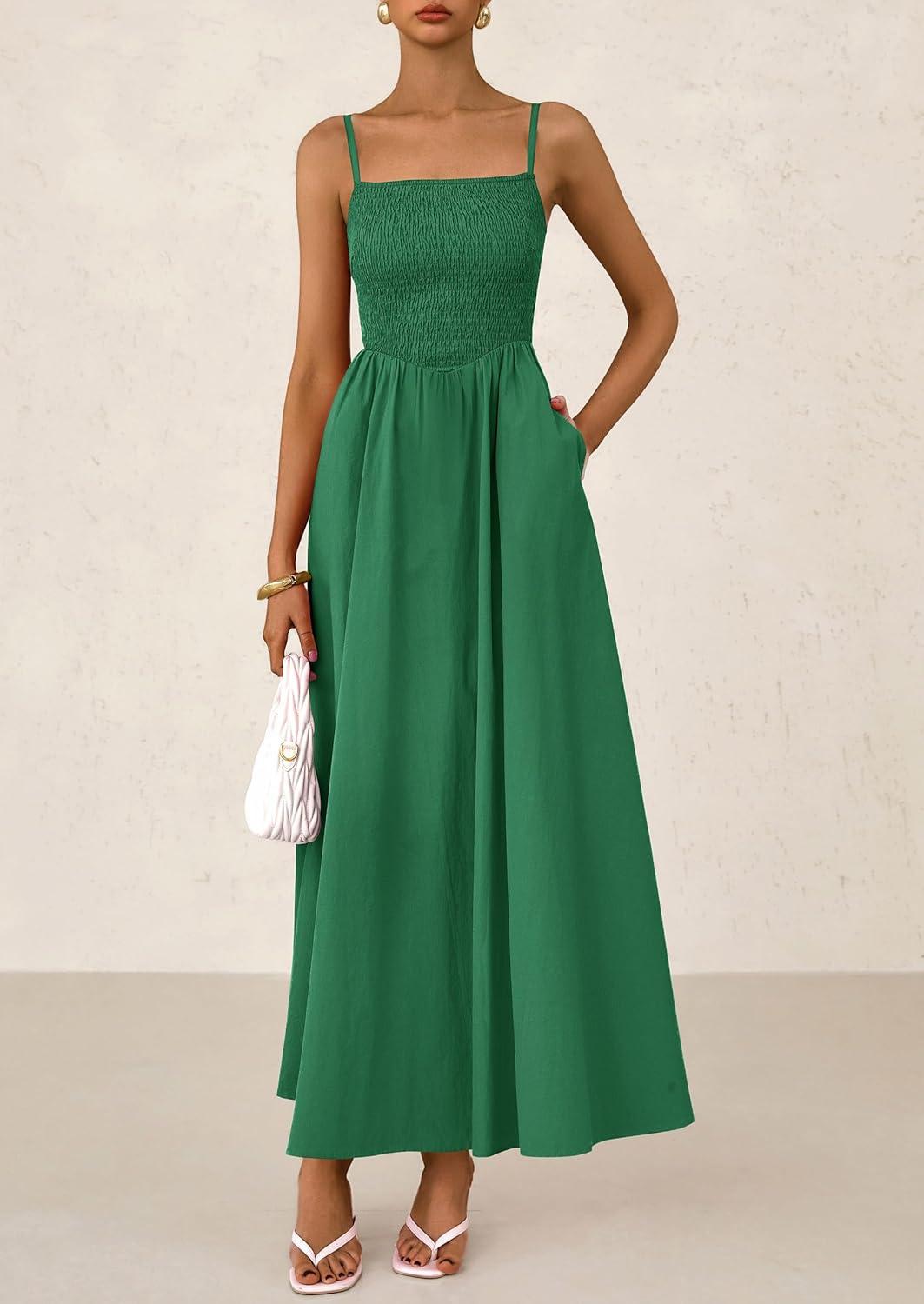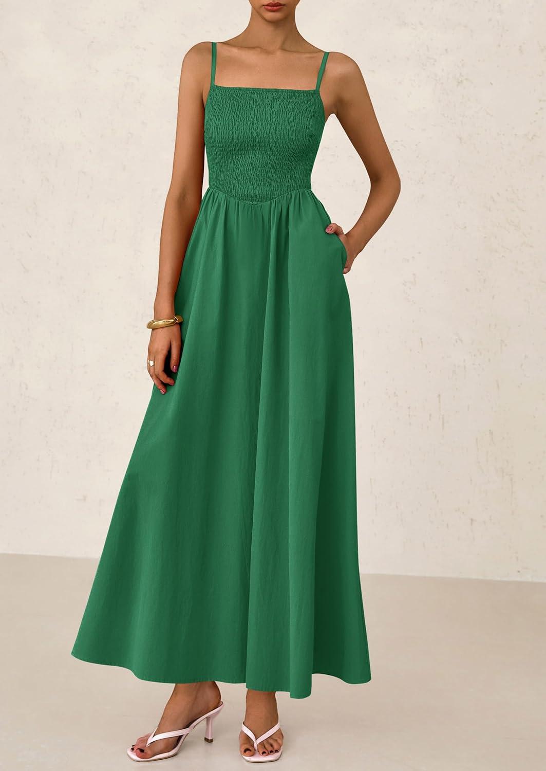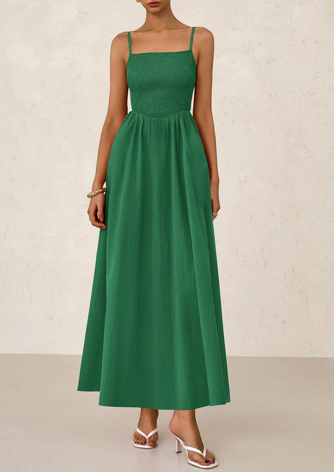 PRETTYGARDEN Women's Smocked Maxi Dresses 2025 Summer Beach Sundress Casual Spaghetti Strap Swing A Line Long Flowy Dress(Dark Green)