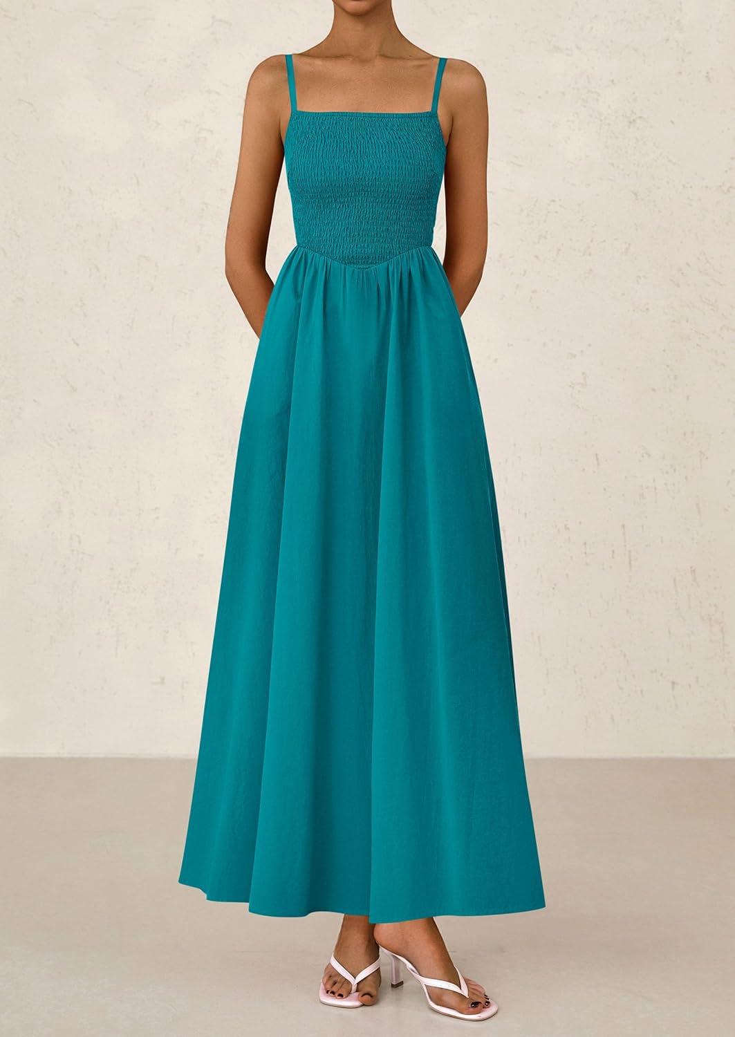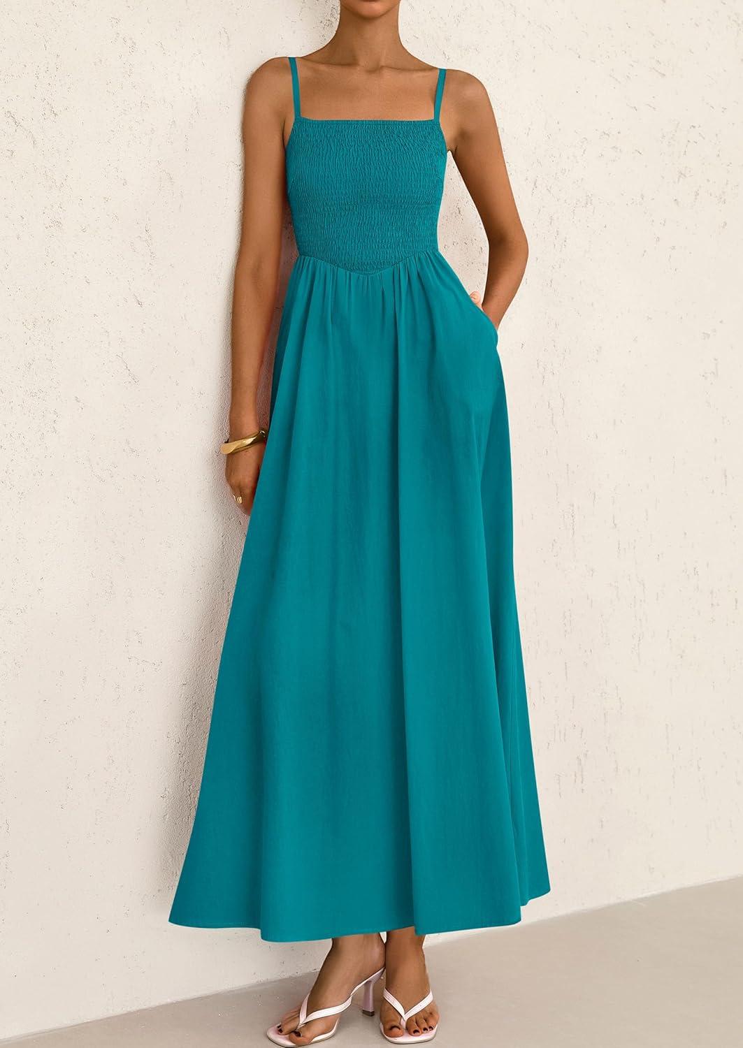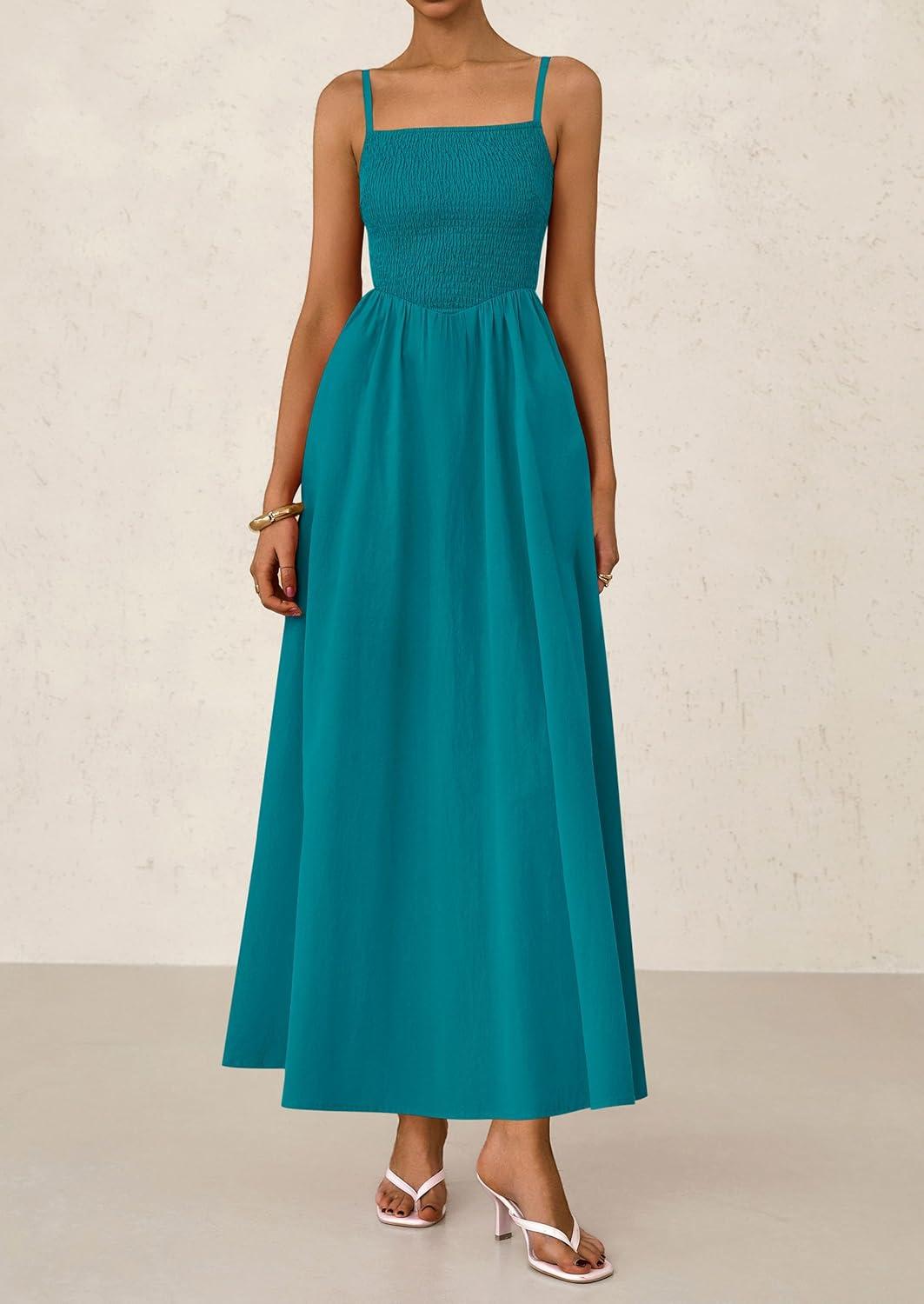PRETTYGARDEN Women's Smocked Maxi Dresses 2025 Summer Beach Sundress Casual Spaghetti Strap Swing A Line Long Flowy Dress(Lake Blue)