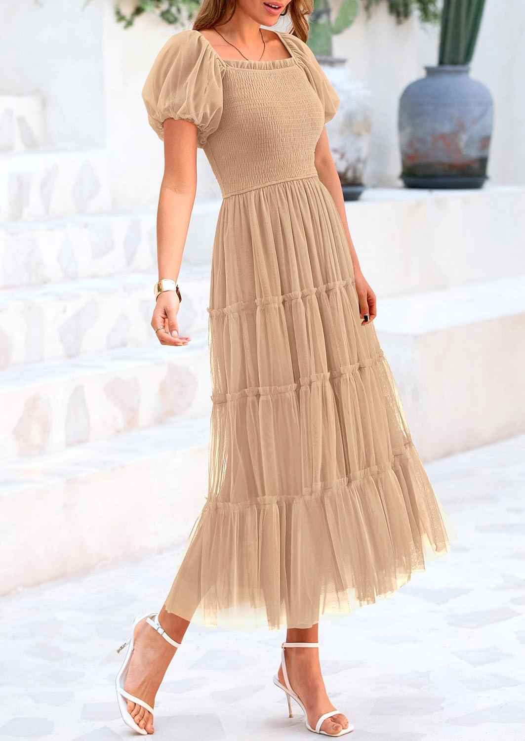 PRETTYGARDEN Women's Smocked Midi Tulle Dress 2025 Summer Puffy Short Sleeve Square Neck Ruffle Wedding Guest Party Dresses(Apricot)