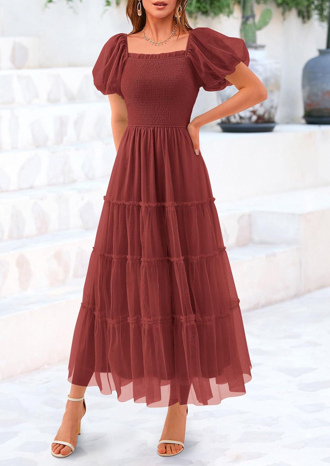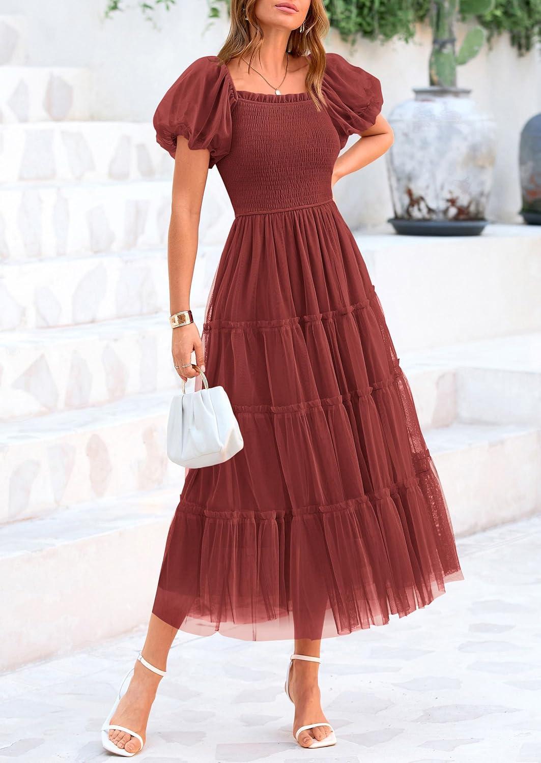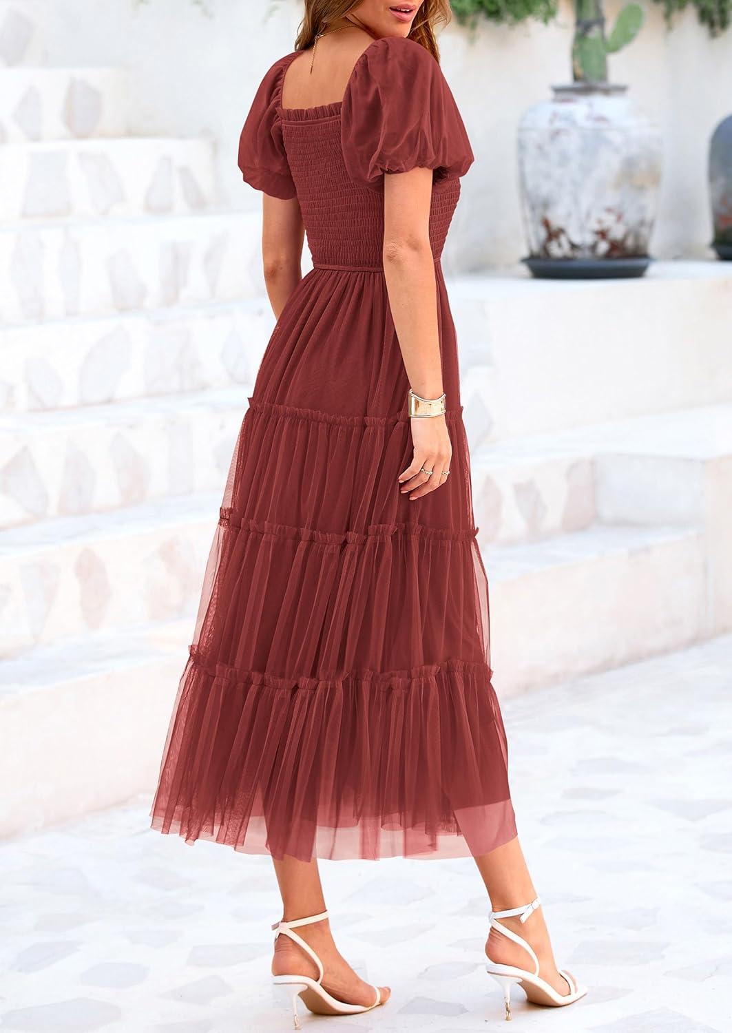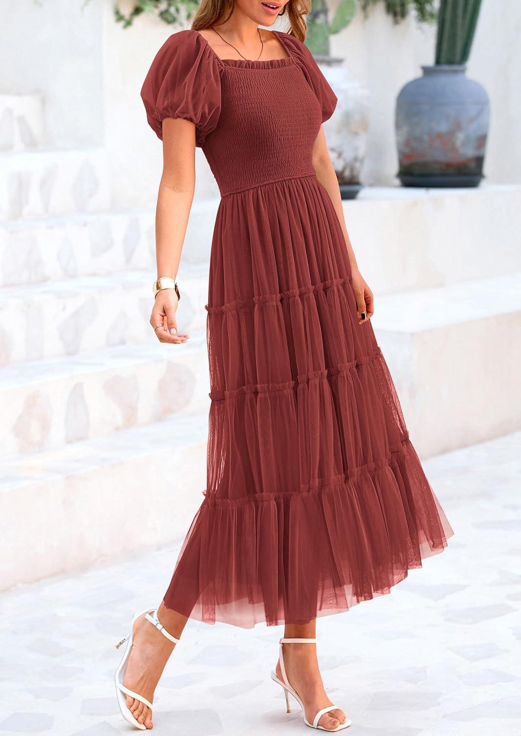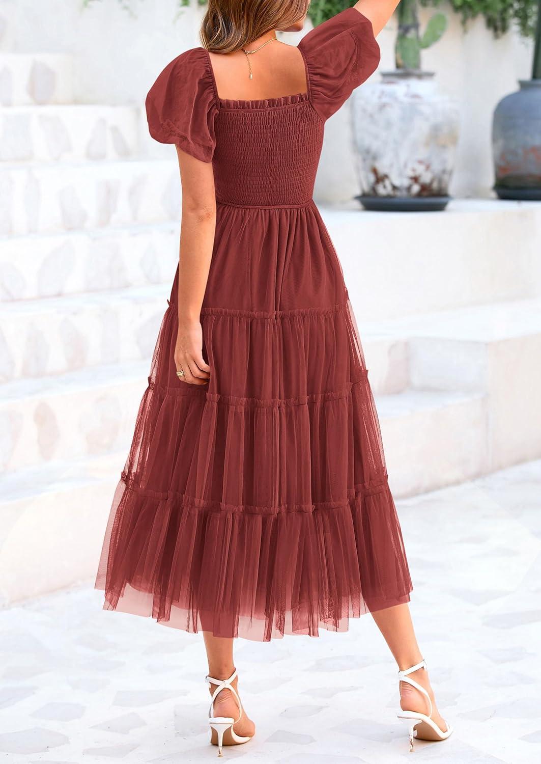 PRETTYGARDEN Women's Smocked Midi Tulle Dress 2025 Summer Puffy Short Sleeve Square Neck Ruffle Wedding Guest Party Dresses(Brick Red)