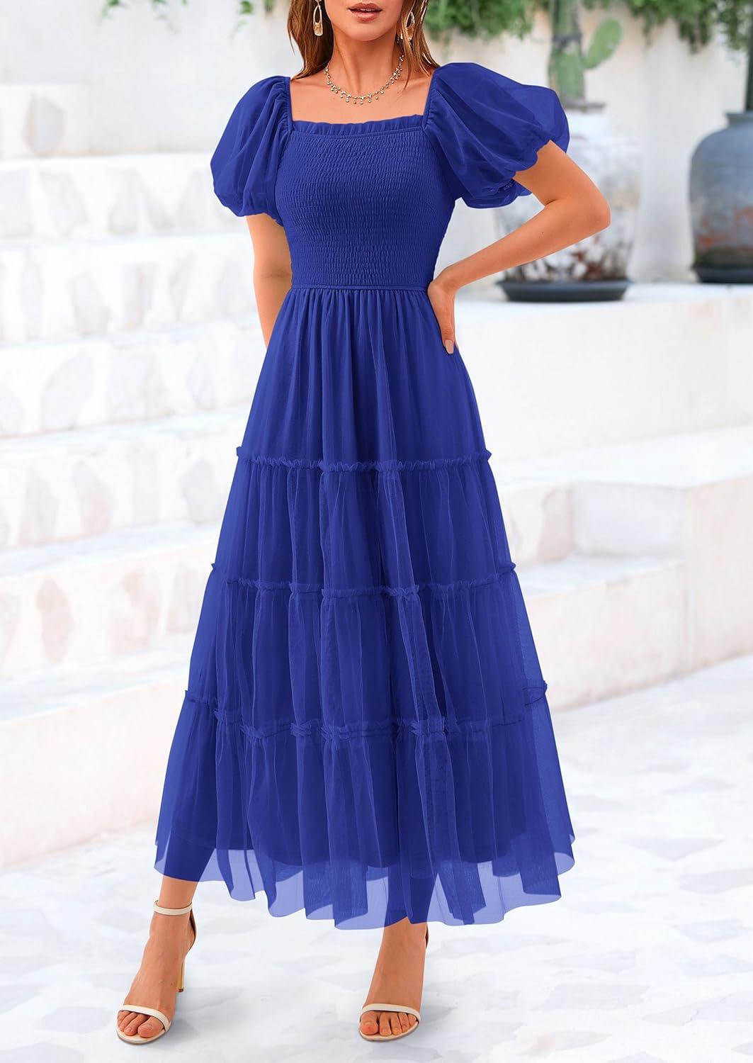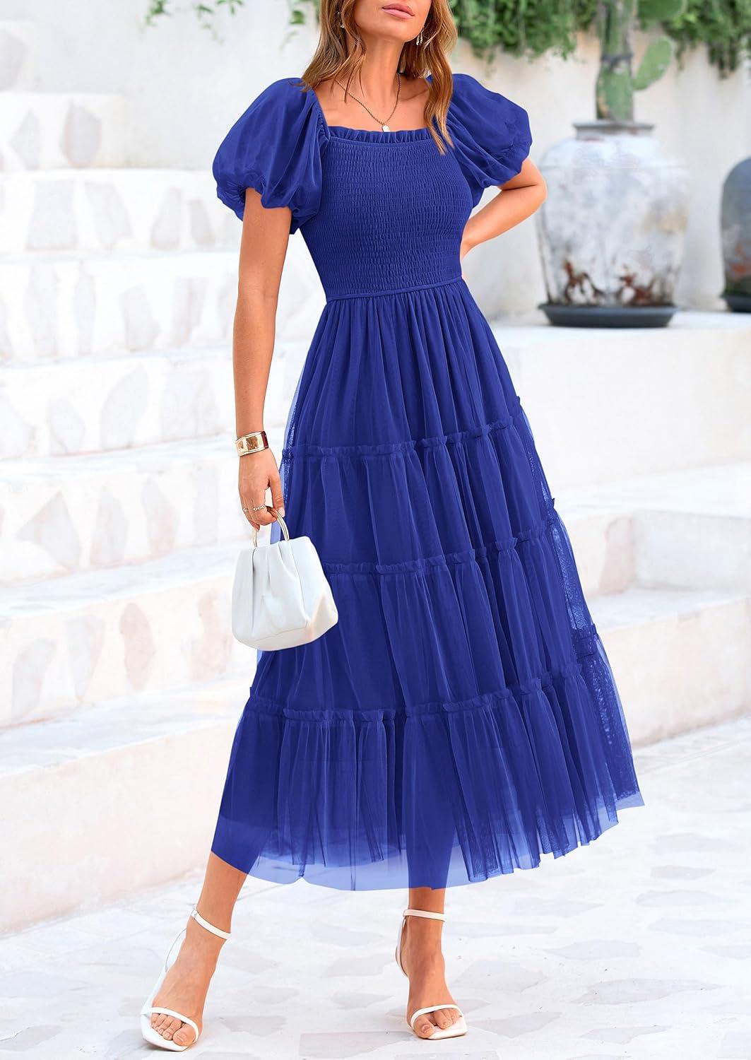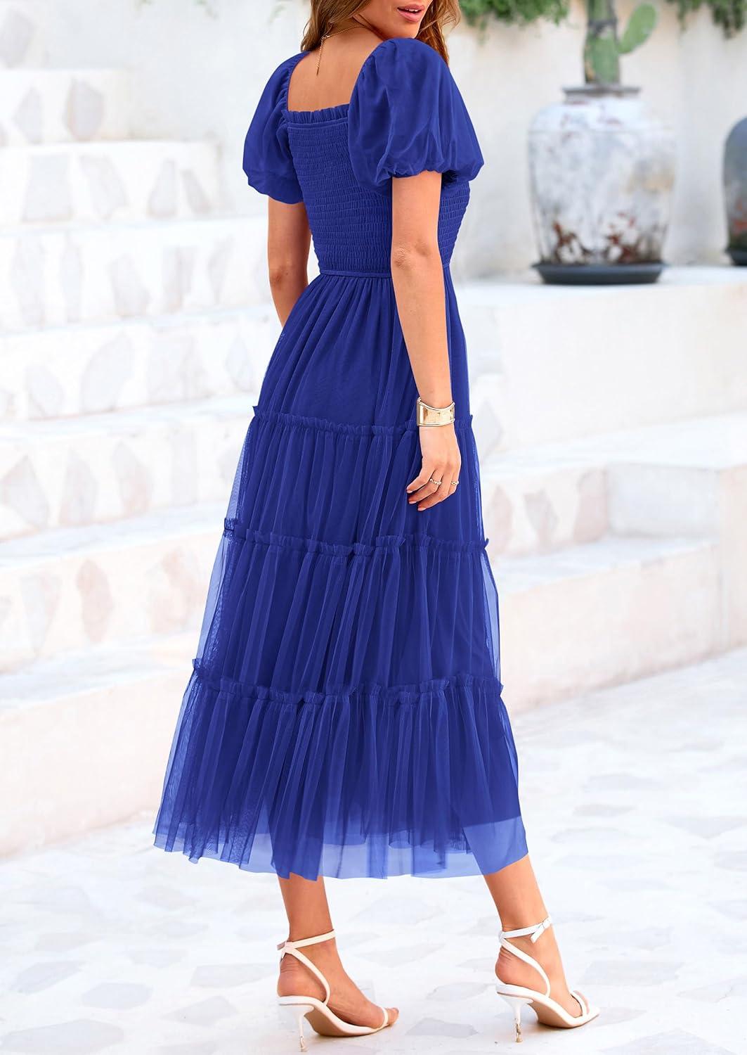 PRETTYGARDEN Women's Smocked Midi Tulle Dress 2025 Summer Puffy Short Sleeve Square Neck Ruffle Wedding Guest Party Dresses(Royal Blue)