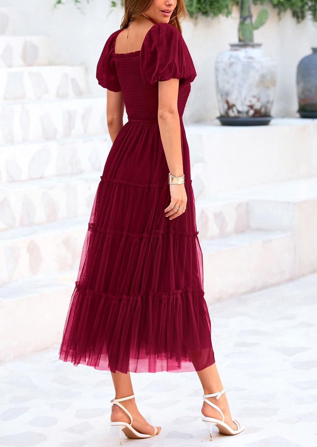 PRETTYGARDEN Women's Smocked Midi Tulle Dress 2025 Summer Puffy Short Sleeve Square Neck Ruffle Wedding Guest Party Dresses(Wine Red)