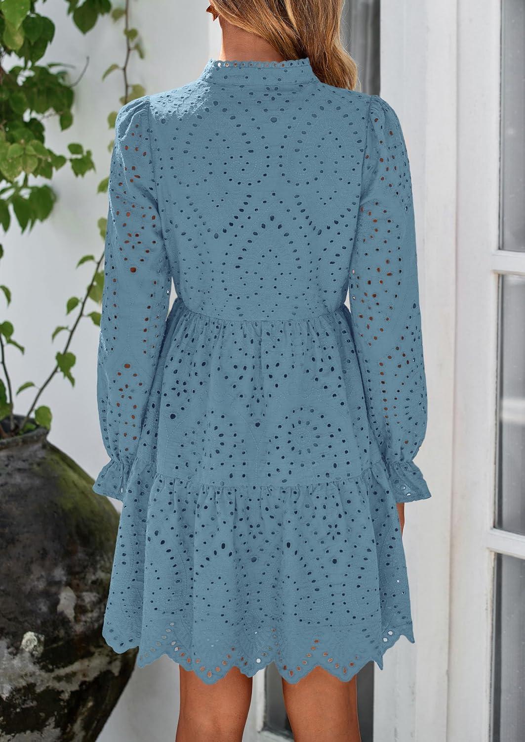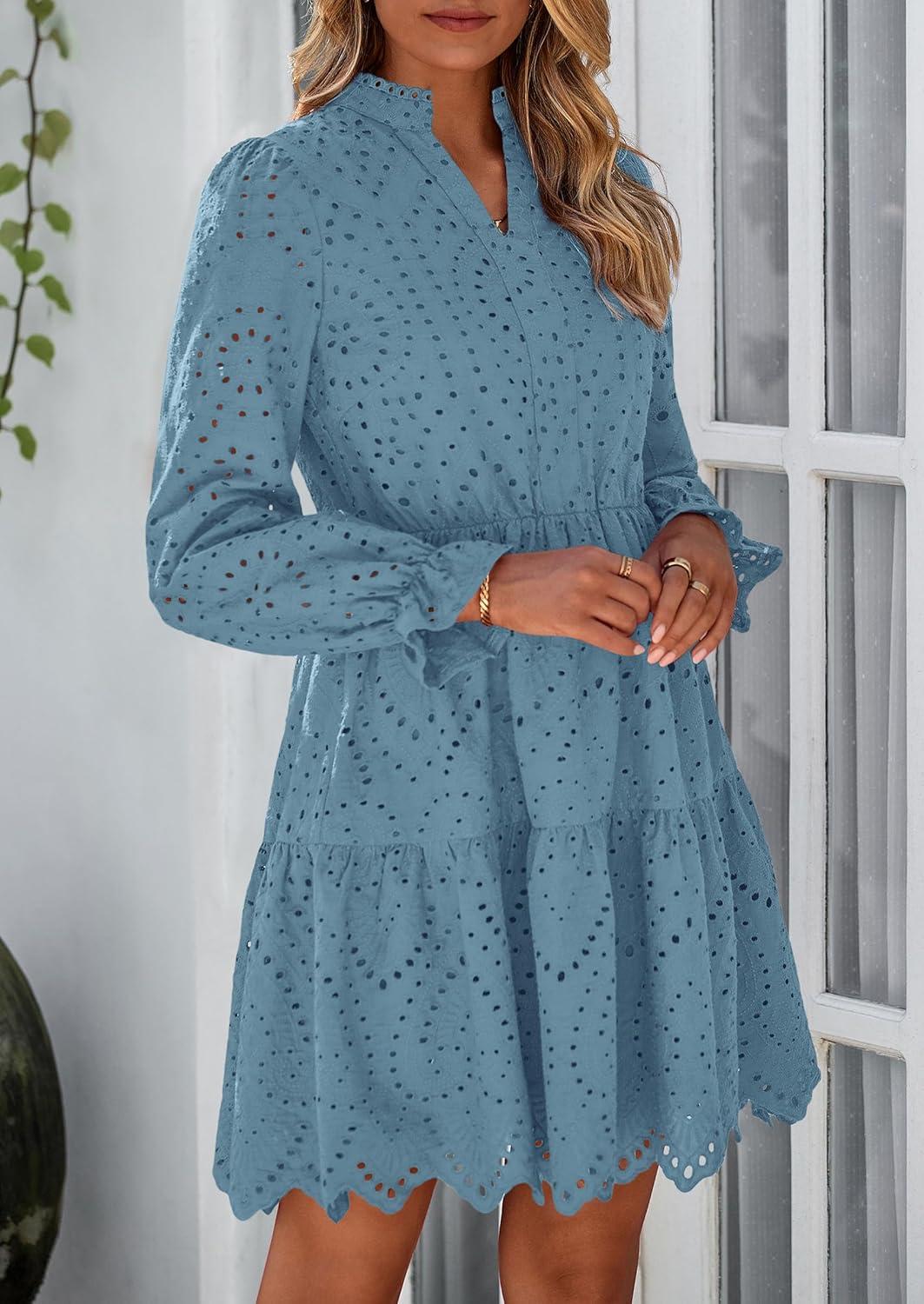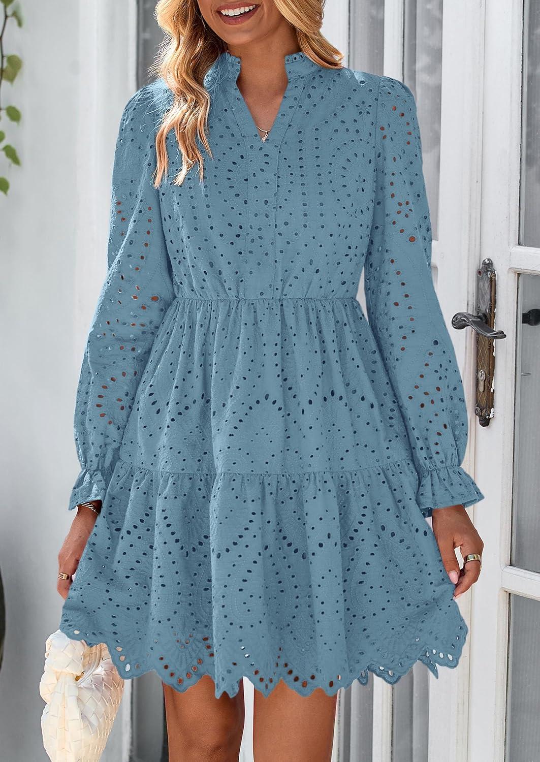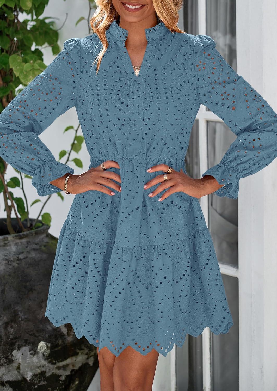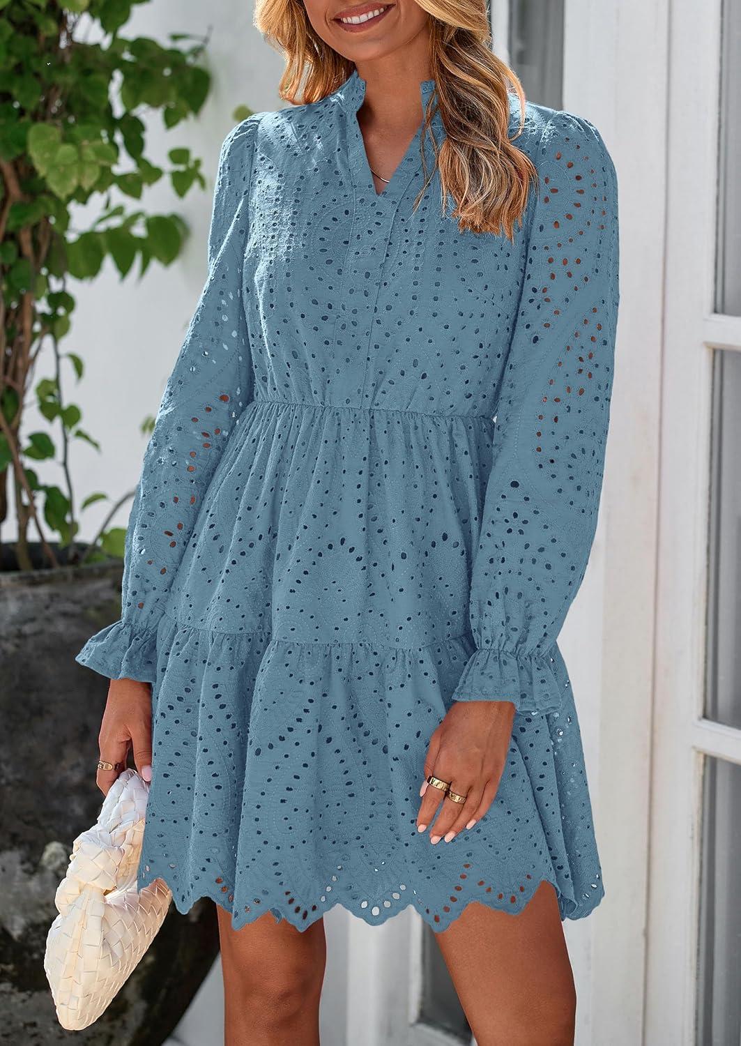 PRETTYGARDEN Women's Spring 2025 Long Puff Sleeve Mini Dress Hollow Out Lace V Neck A Line Ruffle Casual Party Dresses(Grey Blue)
