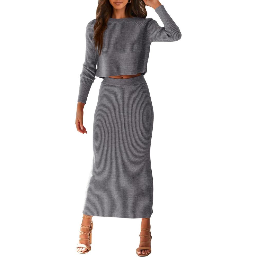 PRETTYGARDEN Women's Spring Fall 2 Piece Sweater Set Rib Knit Long Sleeve Crop Top Maxi Bodycon Skirt Casual Winter Outfits(Grey)
