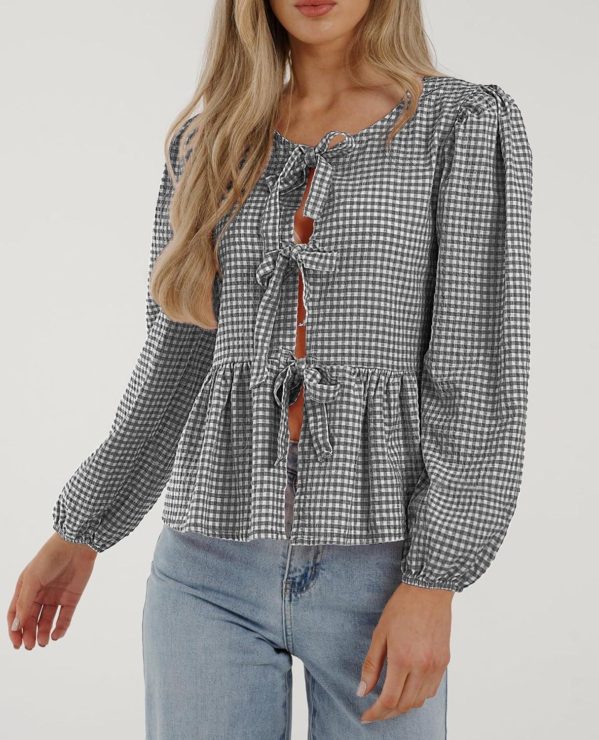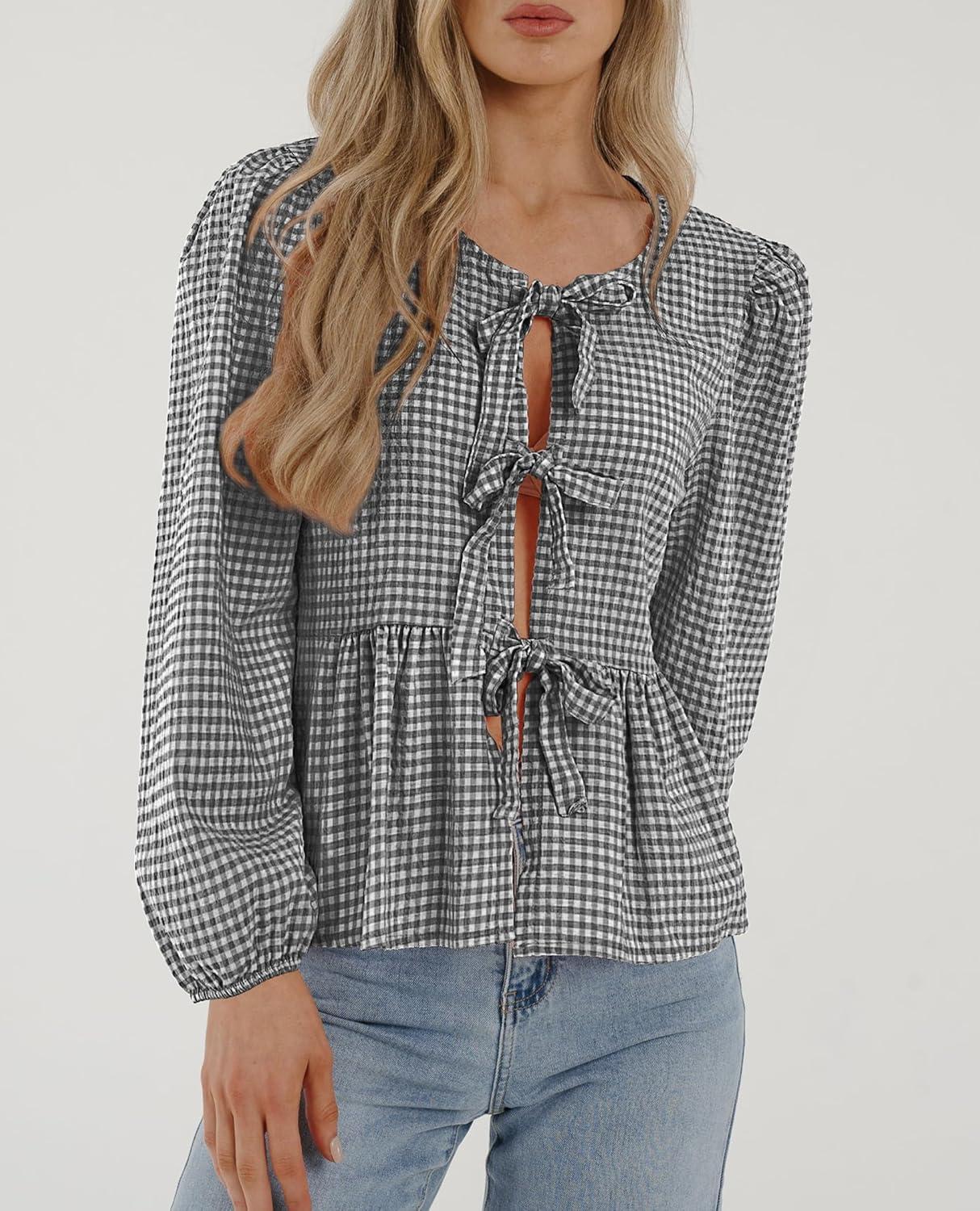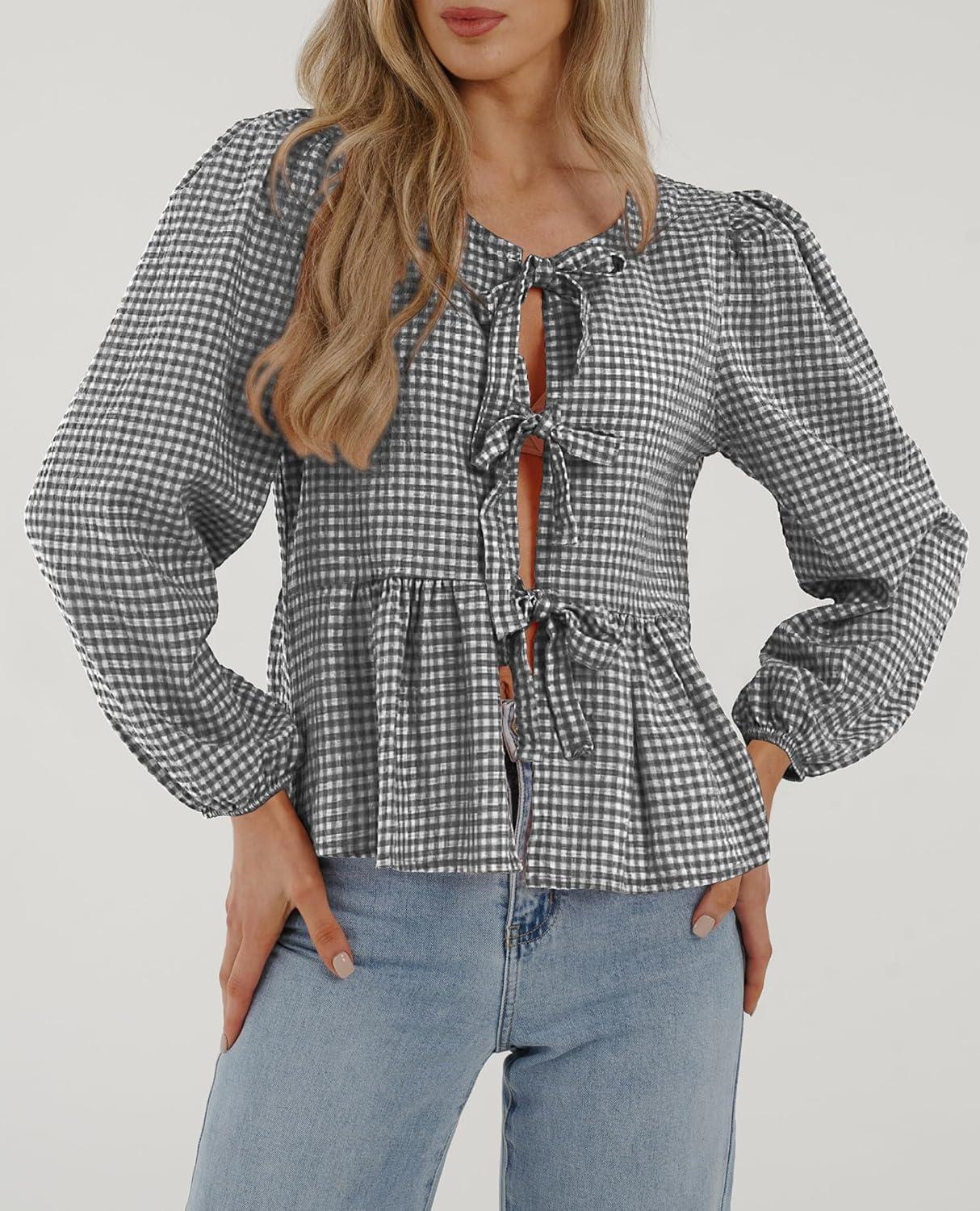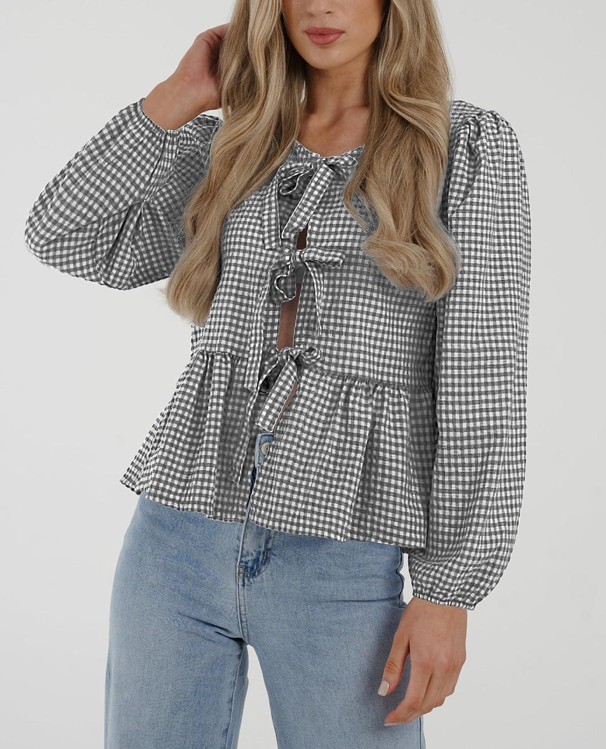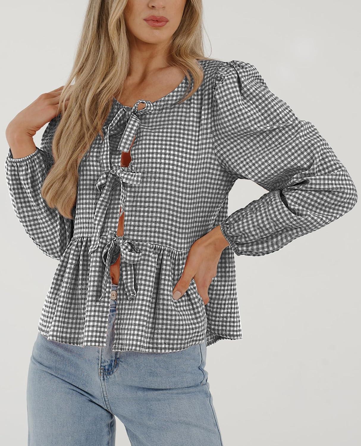 PRETTYGARDEN Women's Spring Fall Babydoll Peplum Blouse Shirt Puff Long Sleeve Bow Tie Front Trendy Cute Y2K Going Out Tops(Plaid Black)