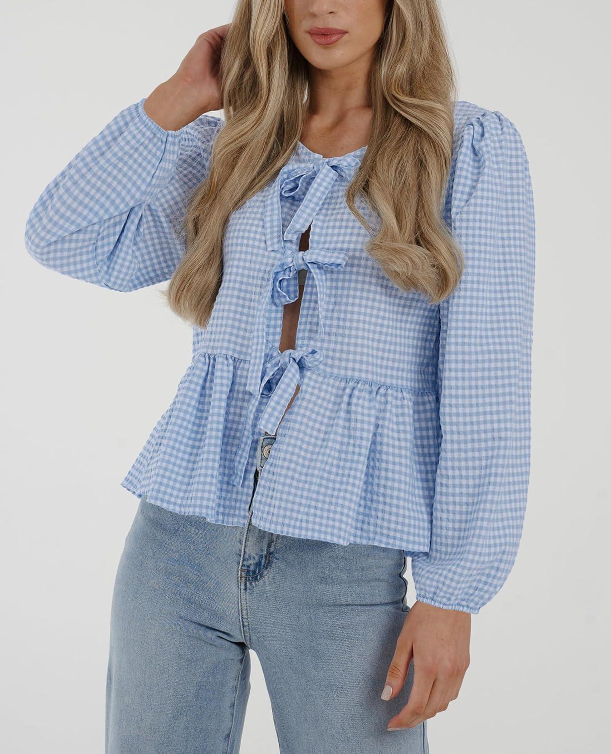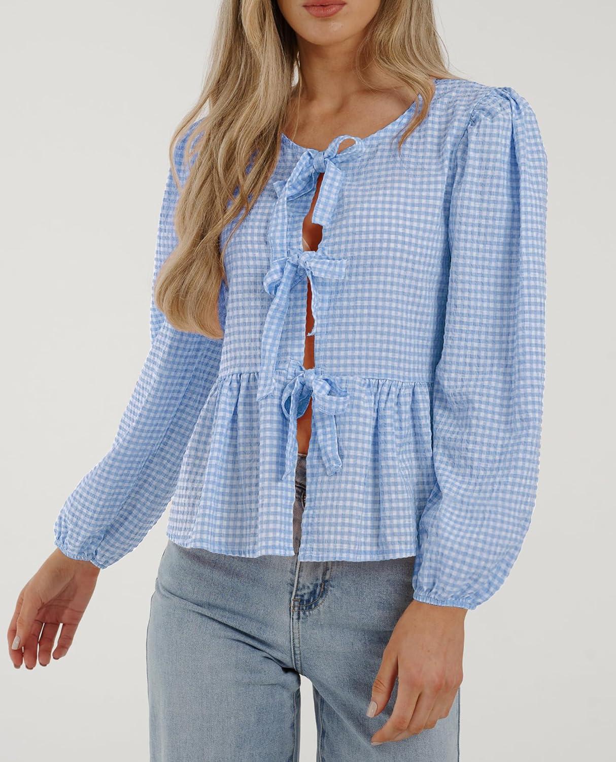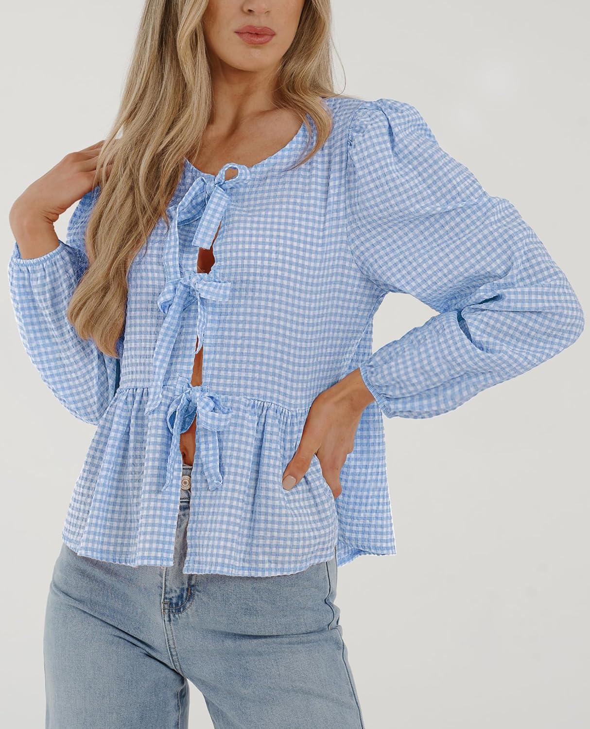 PRETTYGARDEN Women's Spring Fall Babydoll Peplum Blouse Shirt Puff Long Sleeve Bow Tie Front Trendy Cute Y2K Going Out Tops(Plaid Light Blue)