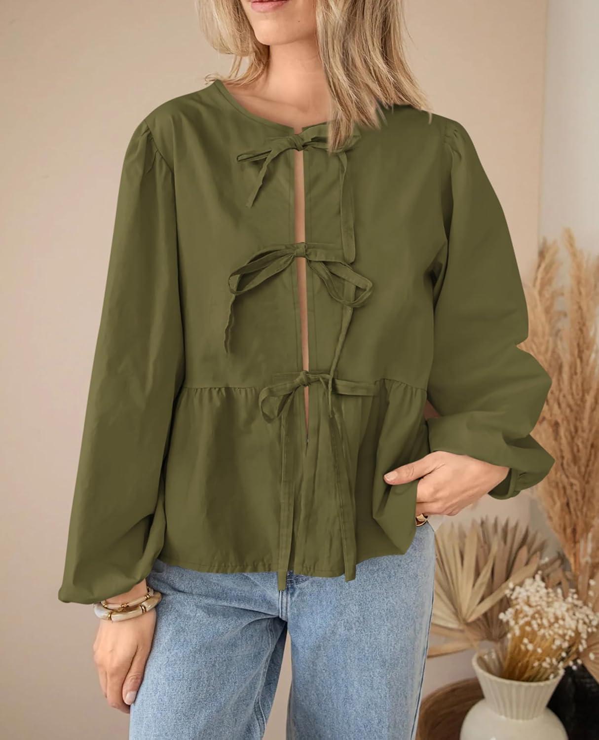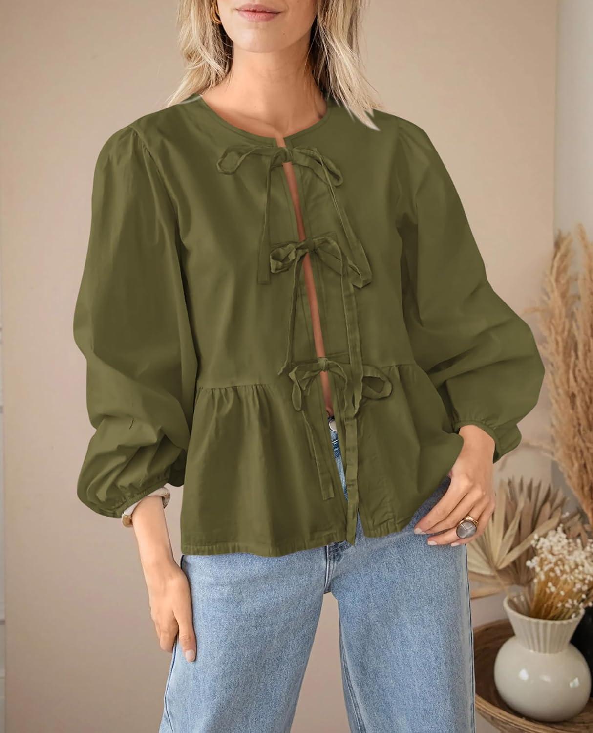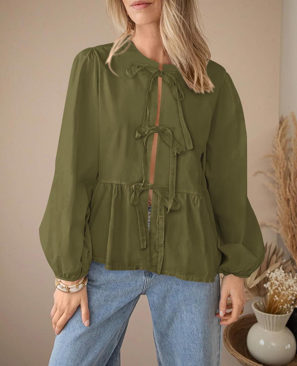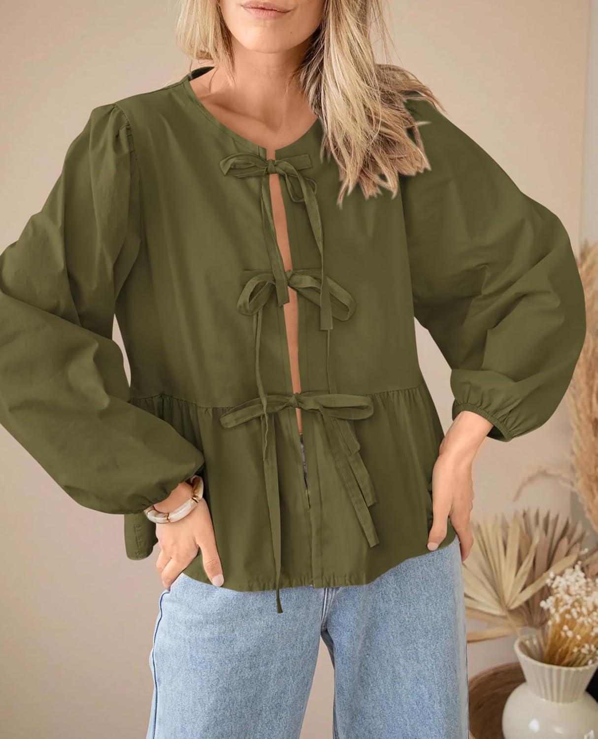 PRETTYGARDEN Women's Spring Fall Babydoll Peplum Blouse Shirt Puff Long Sleeve Bow Tie Front Trendy Cute Y2K Going Out Tops(Solid Army Green)