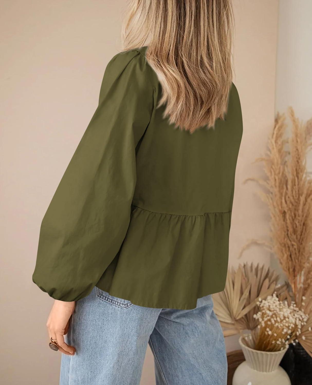 PRETTYGARDEN Women’s Spring Fall Babydoll Peplum Blouse Shirt Puff Long Sleeve Bow Tie Front Trendy Cute Y2K Going Out Tops(Solid Army Green)