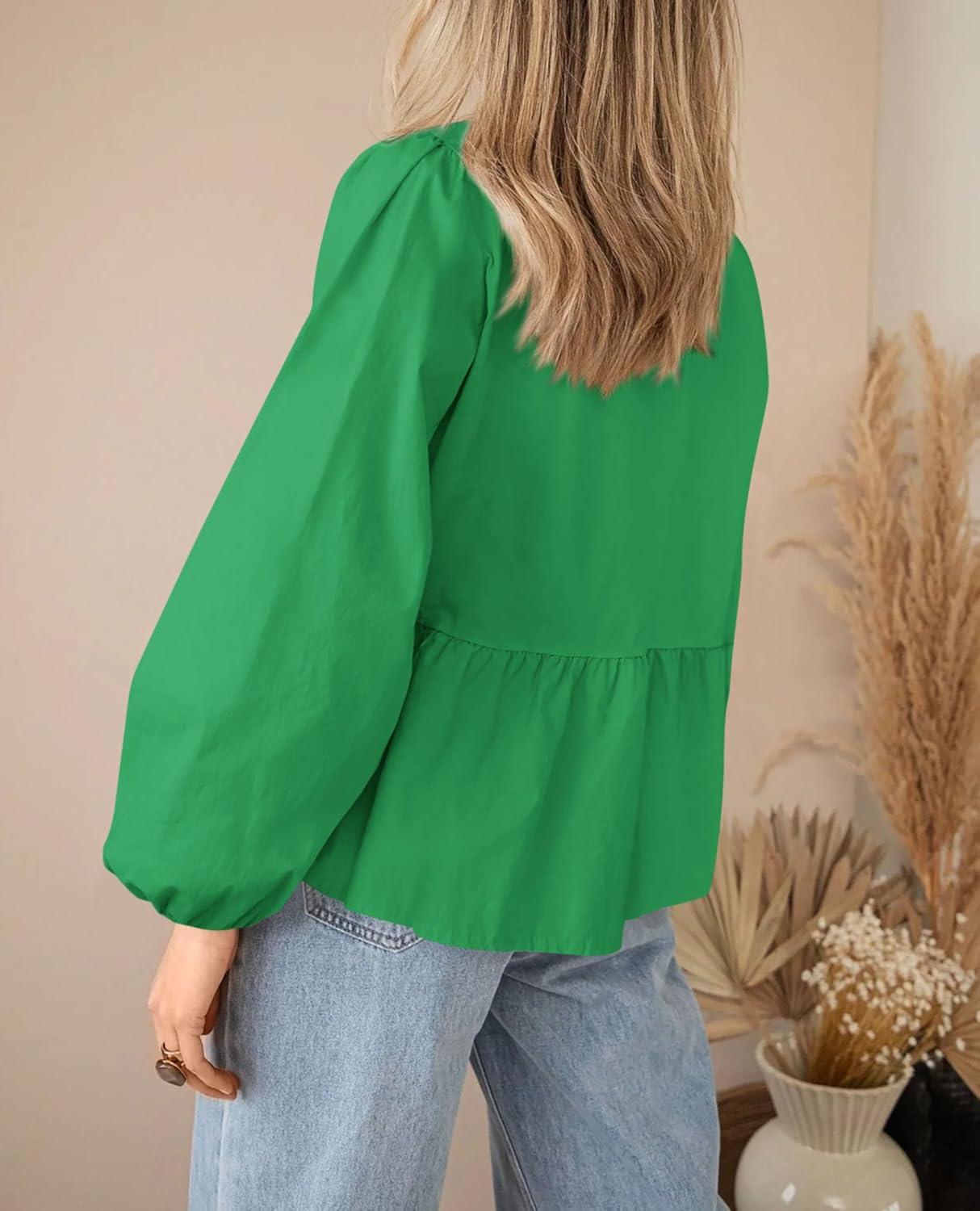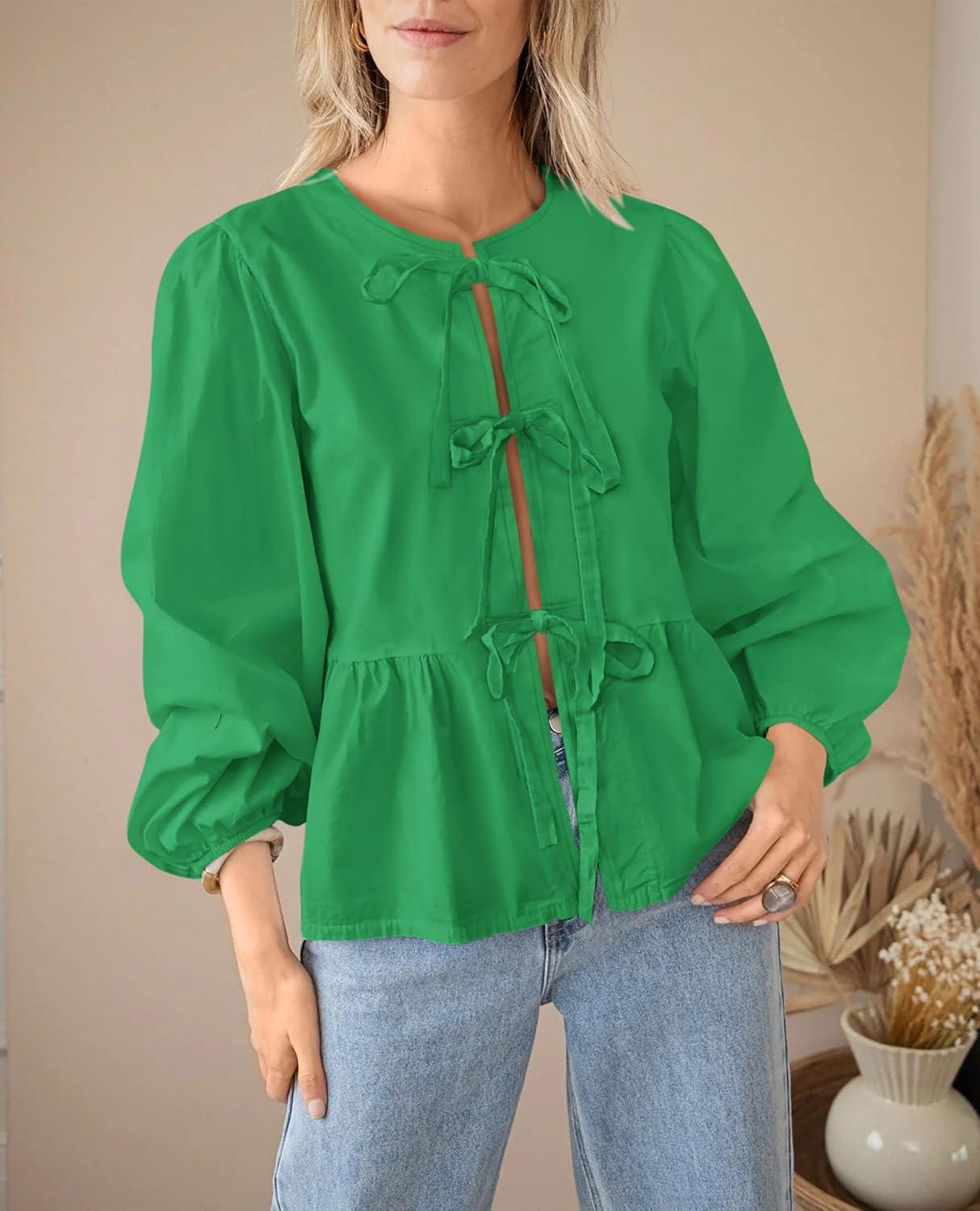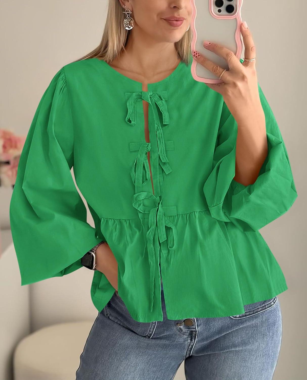 PRETTYGARDEN Women's Spring Fall Babydoll Peplum Blouse Shirt Puff Long Sleeve Bow Tie Front Trendy Cute Y2K Going Out Tops(Solid Green)