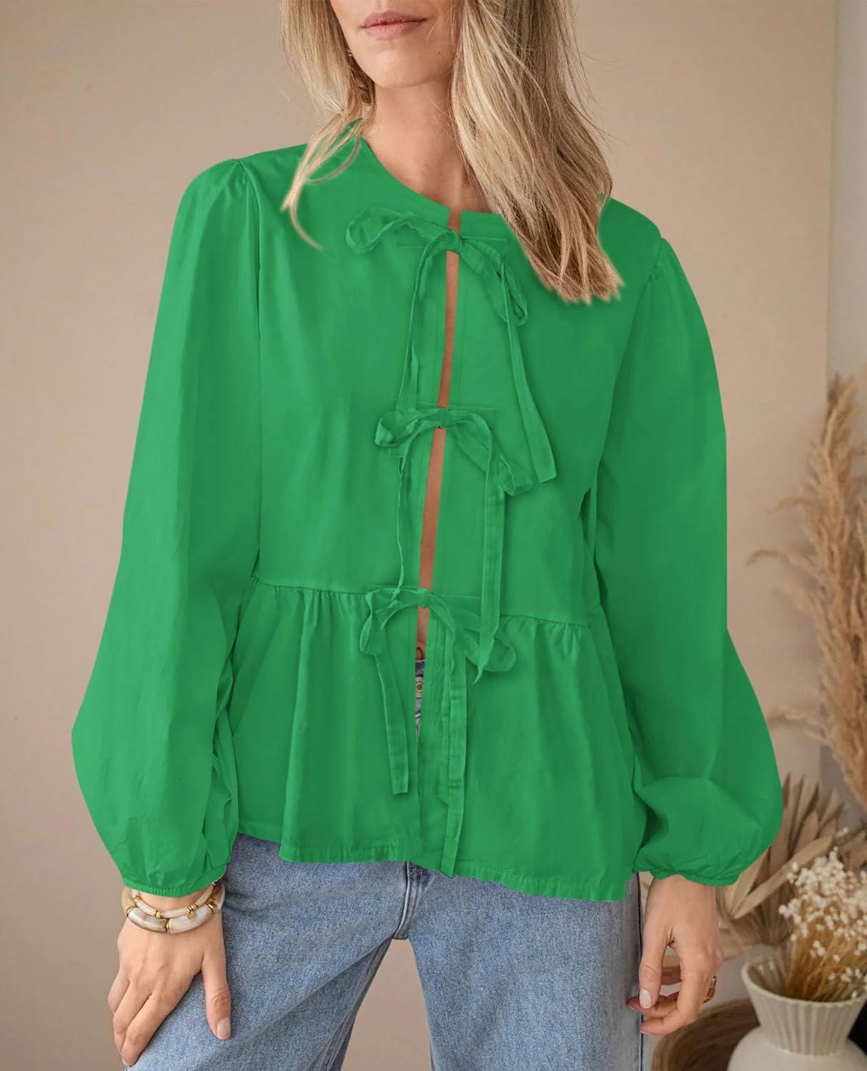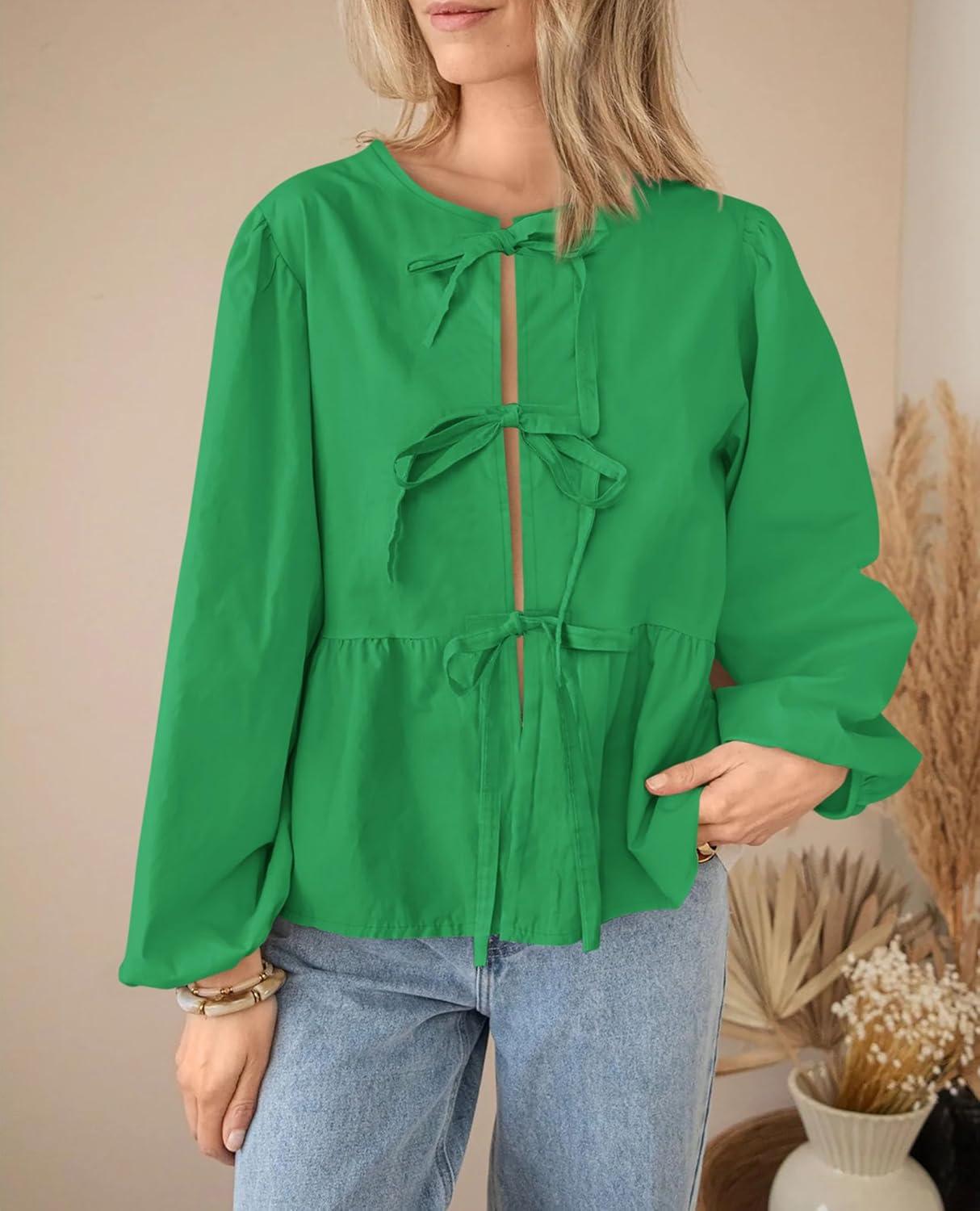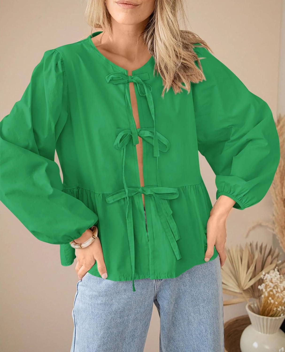 PRETTYGARDEN Women's Spring Fall Babydoll Peplum Blouse Shirt Puff Long Sleeve Bow Tie Front Trendy Cute Y2K Going Out Tops(Solid Green)