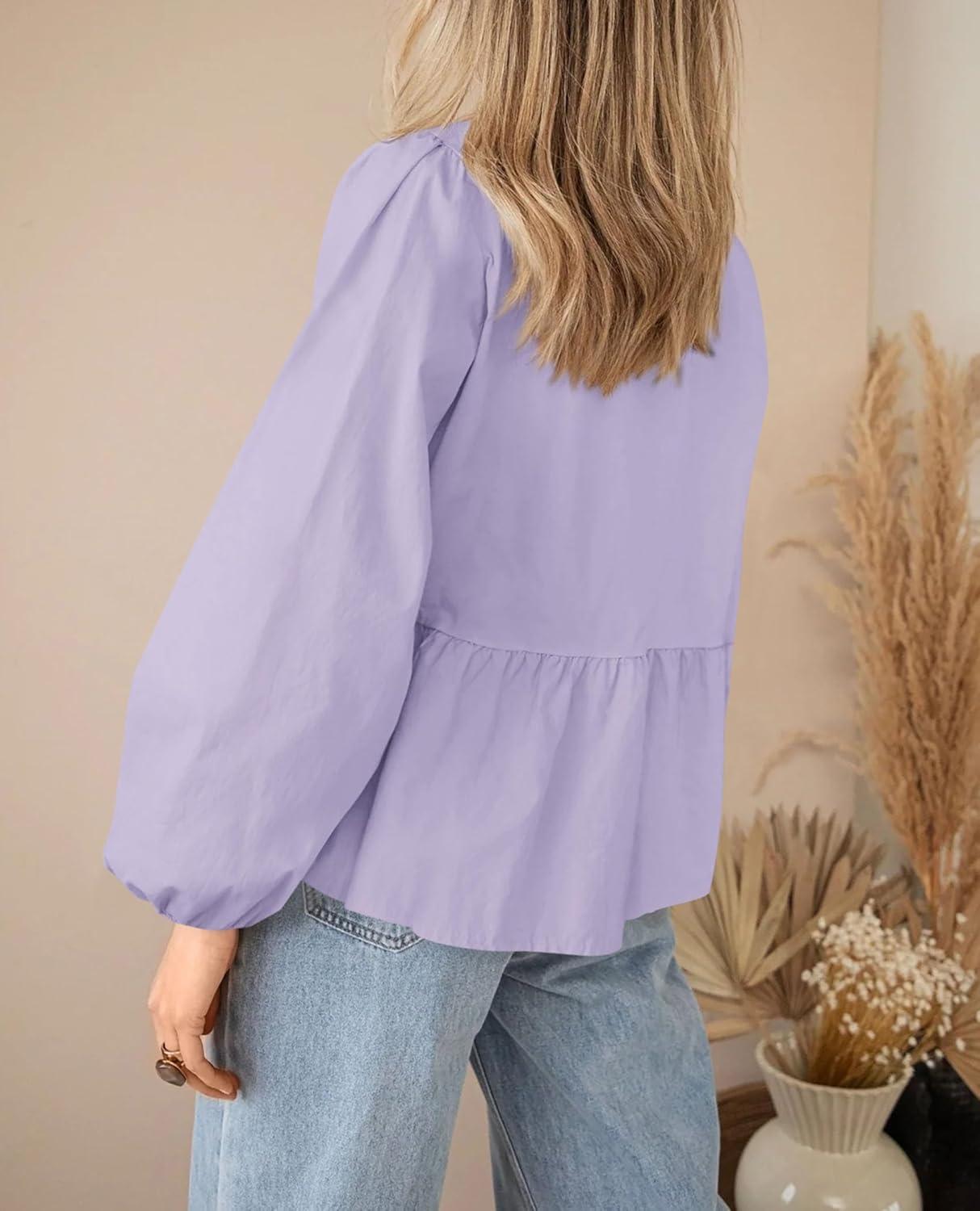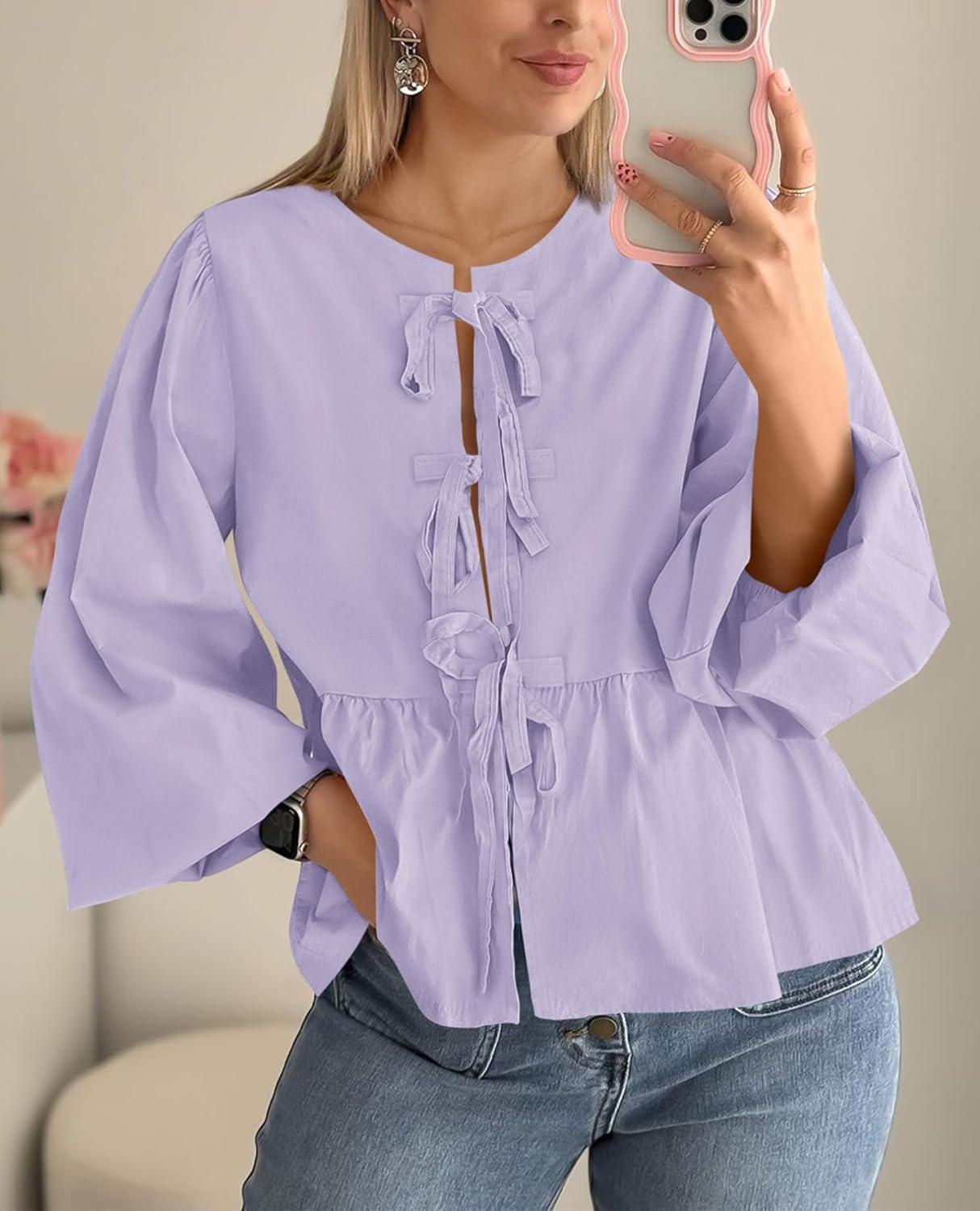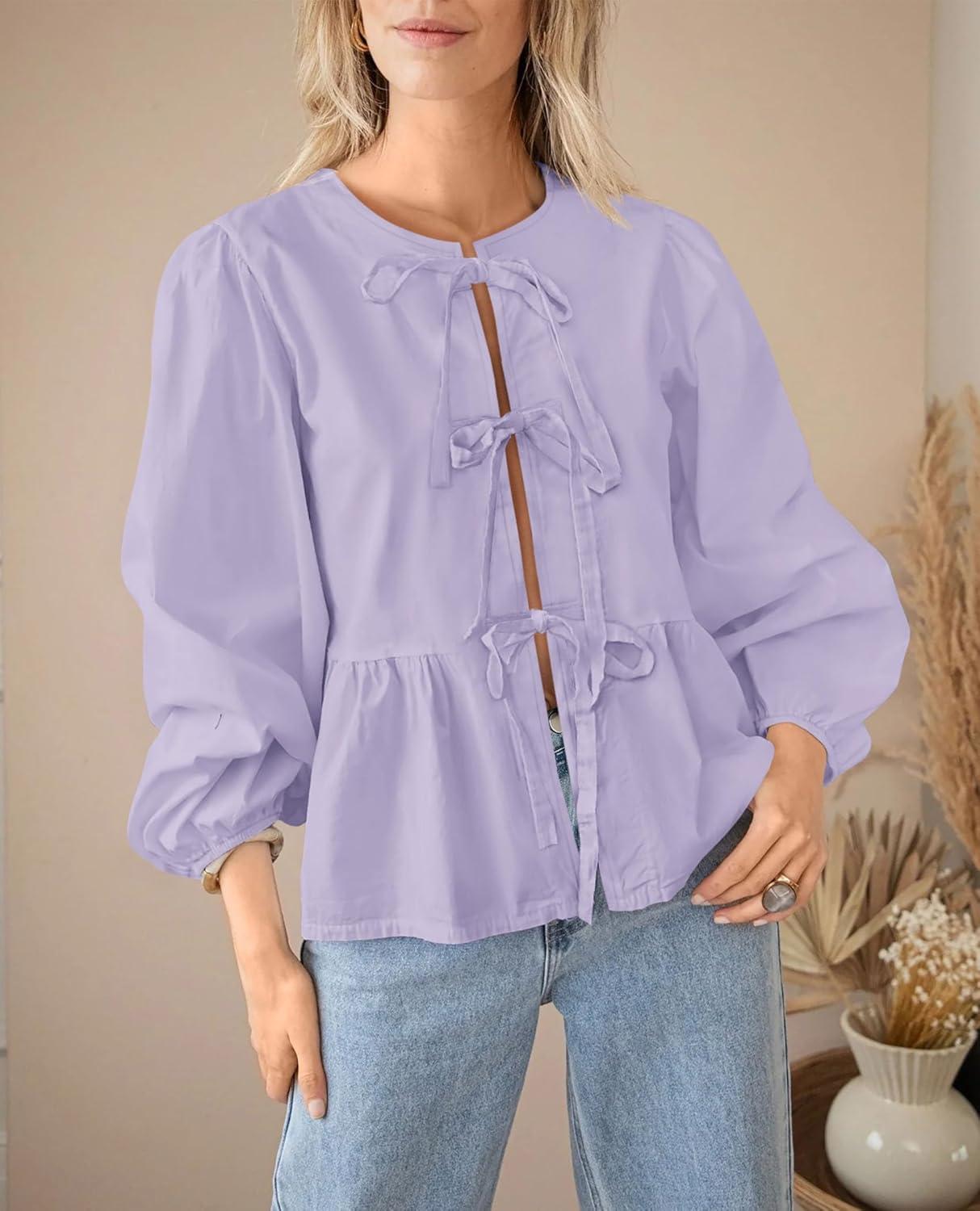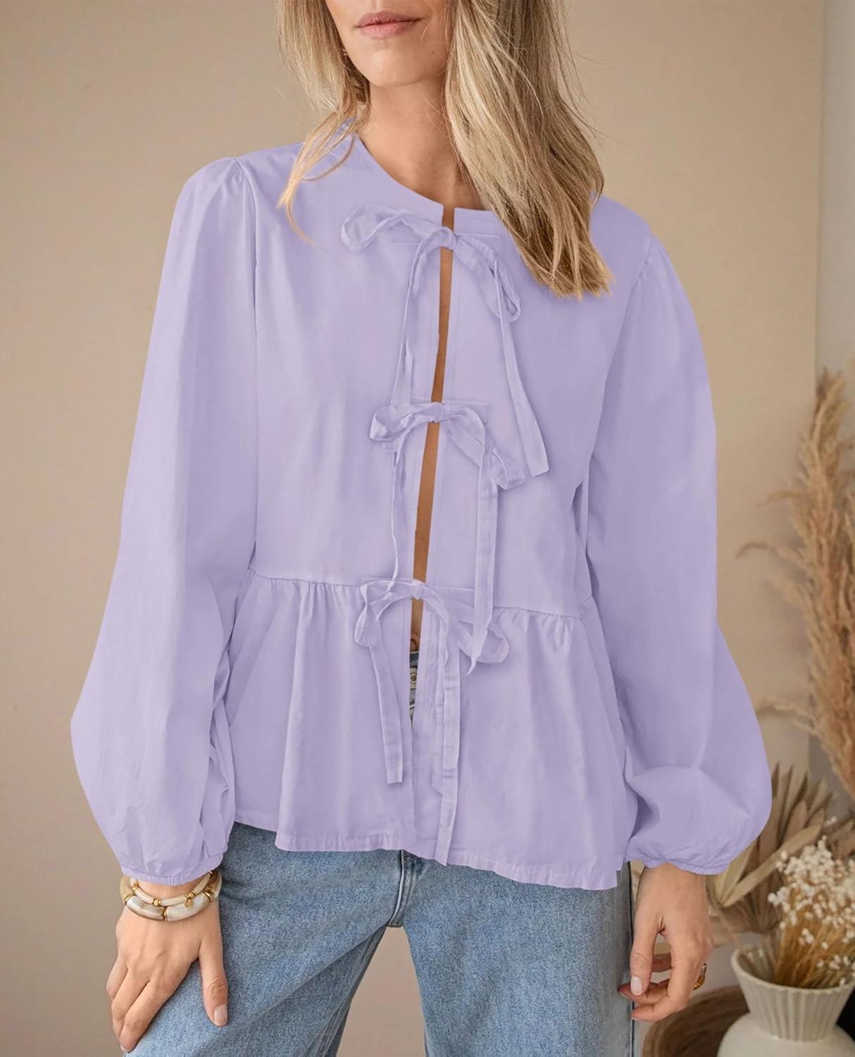 PRETTYGARDEN Women's Spring Fall Babydoll Peplum Blouse Shirt Puff Long Sleeve Bow Tie Front Trendy Cute Y2K Going Out Tops(Solid Light Purple)