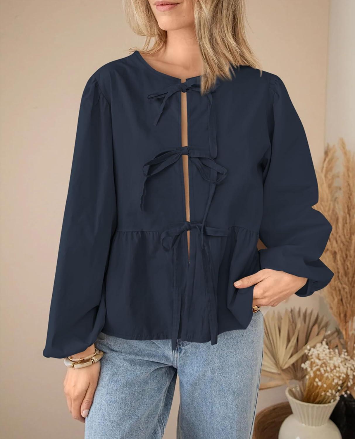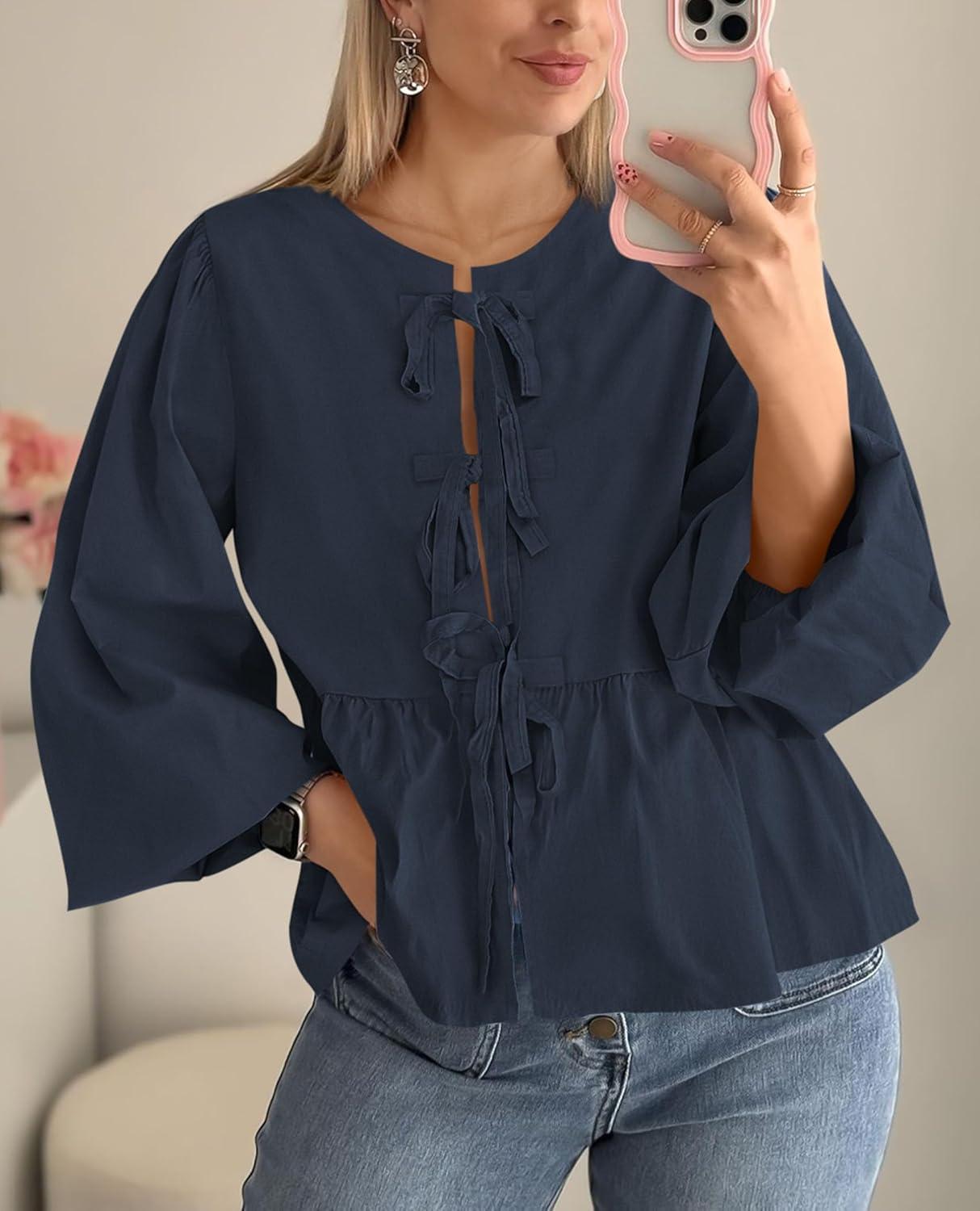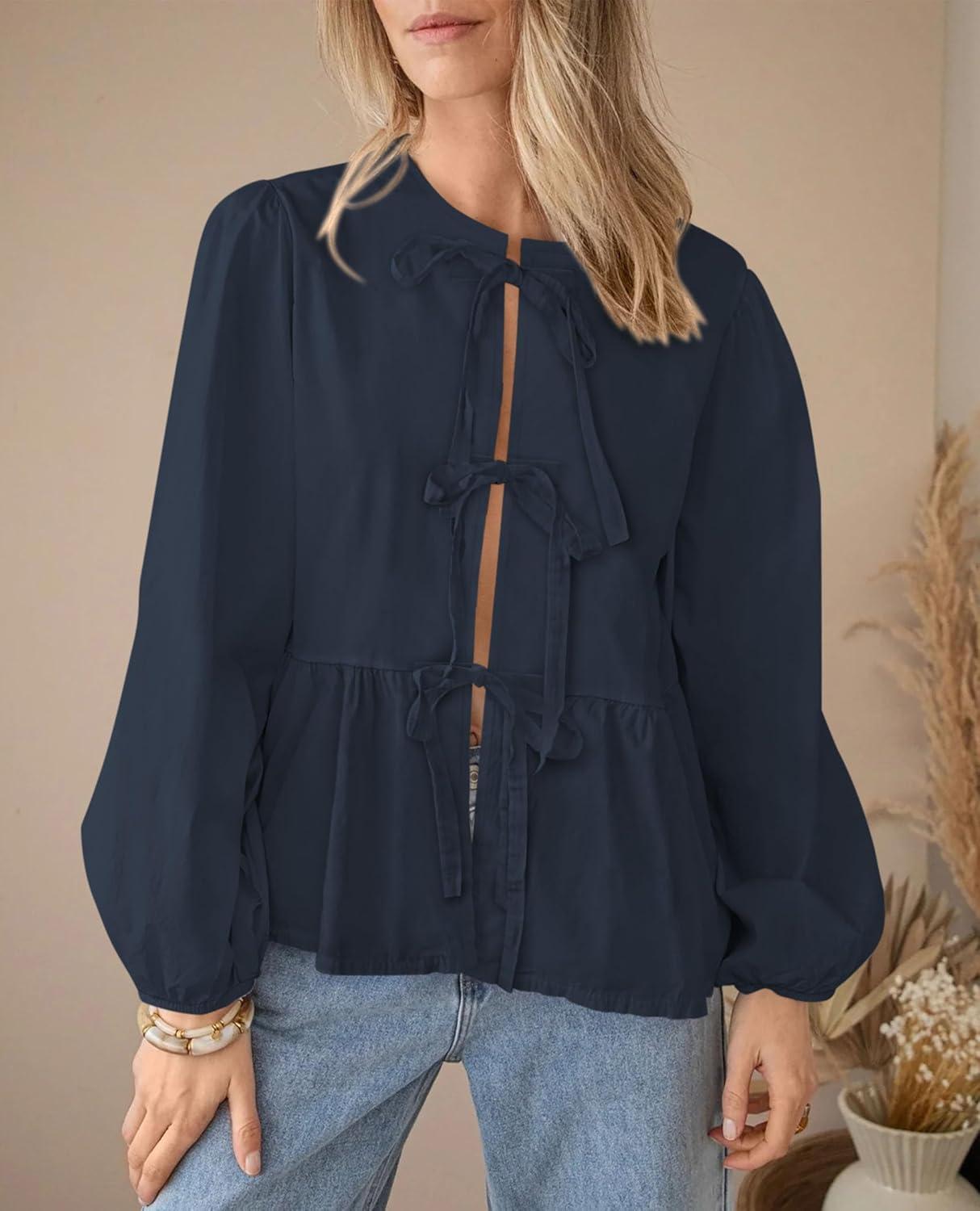 PRETTYGARDEN Women’s Spring Fall Babydoll Peplum Blouse Shirt Puff Long Sleeve Bow Tie Front Trendy Cute Y2K Going Out Tops(Solid Navy)