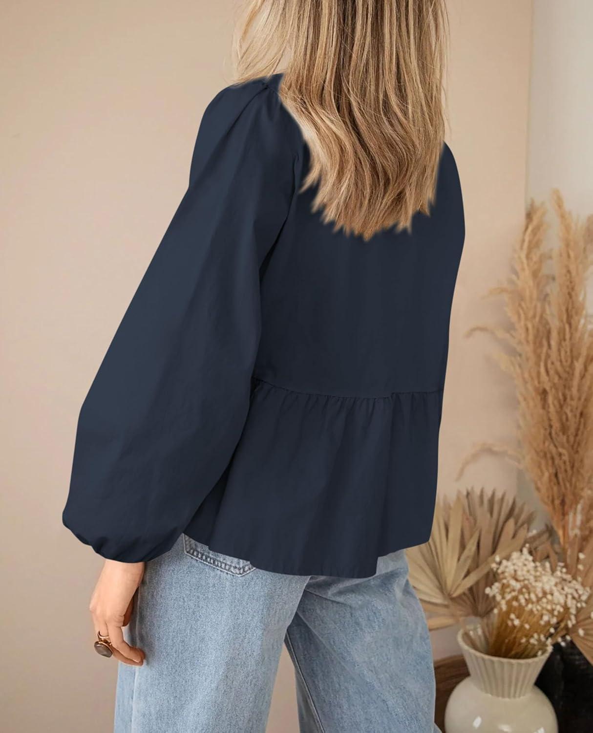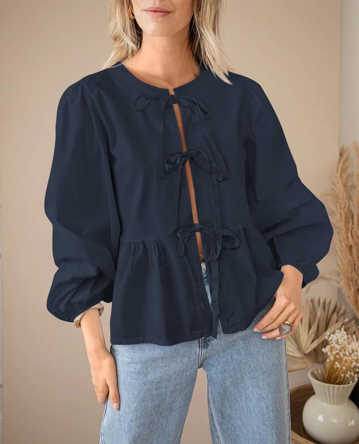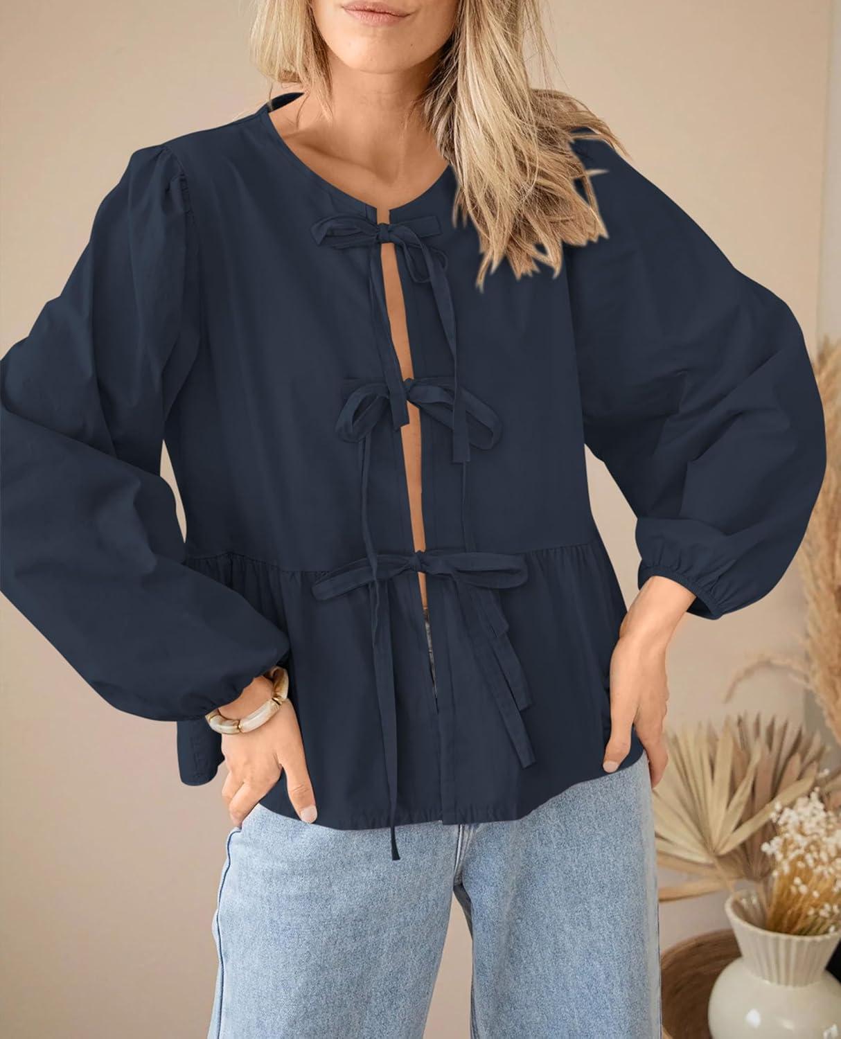 PRETTYGARDEN Women’s Spring Fall Babydoll Peplum Blouse Shirt Puff Long Sleeve Bow Tie Front Trendy Cute Y2K Going Out Tops(Solid Navy)