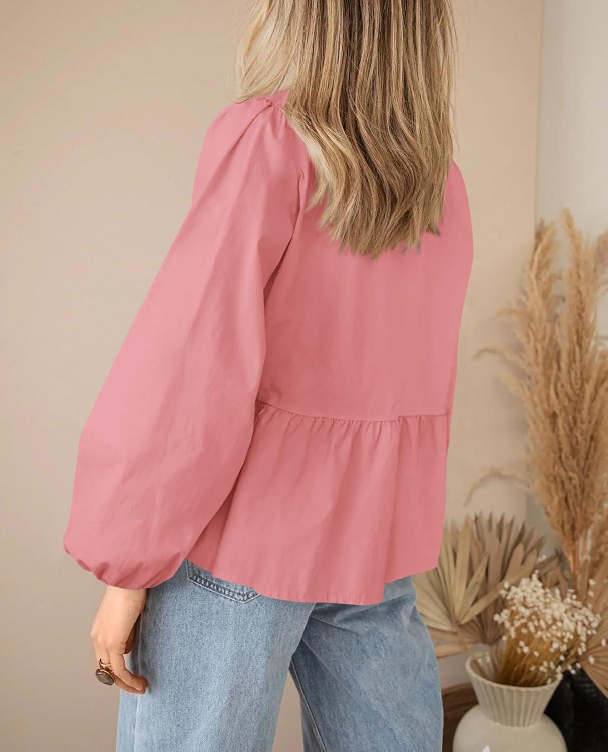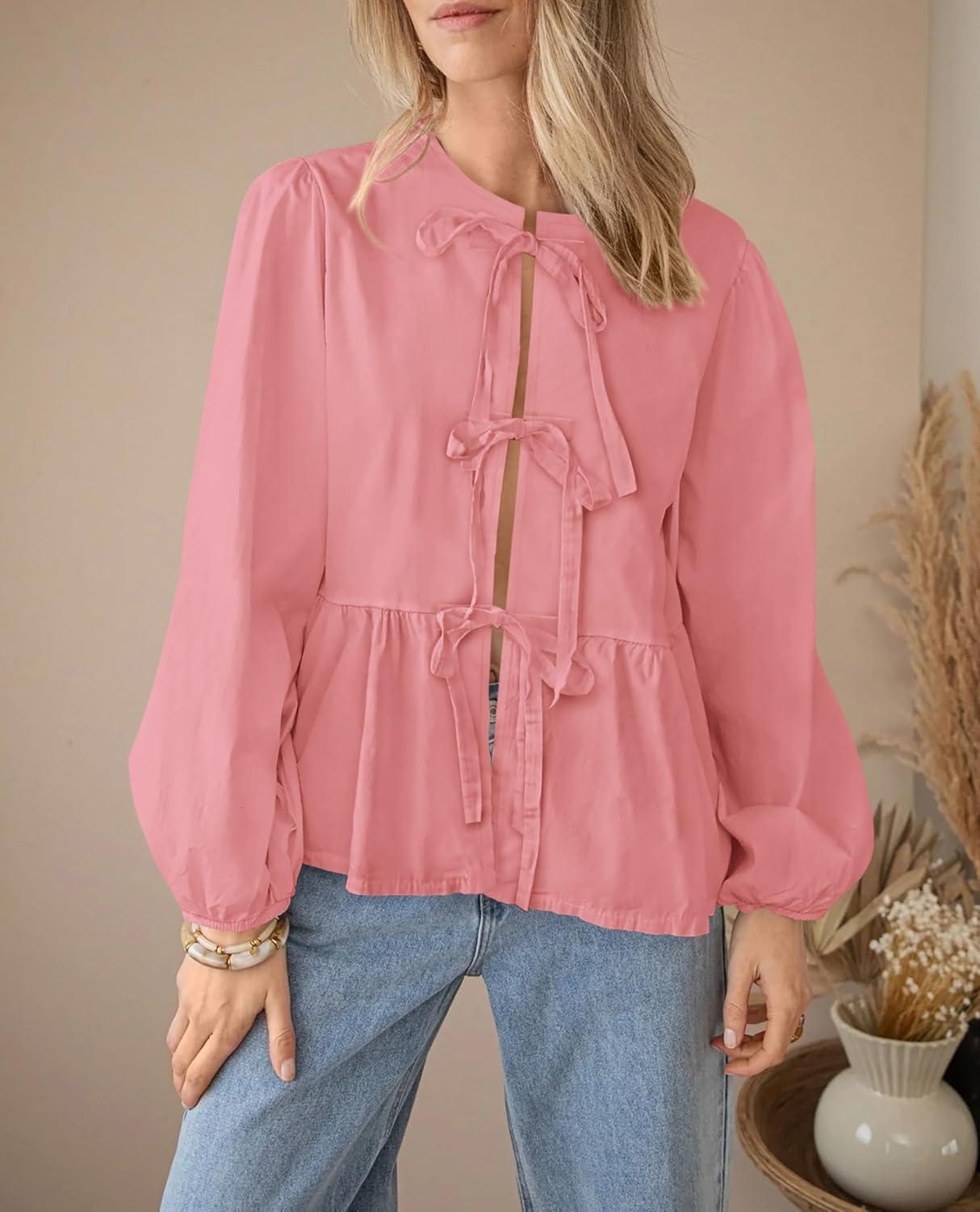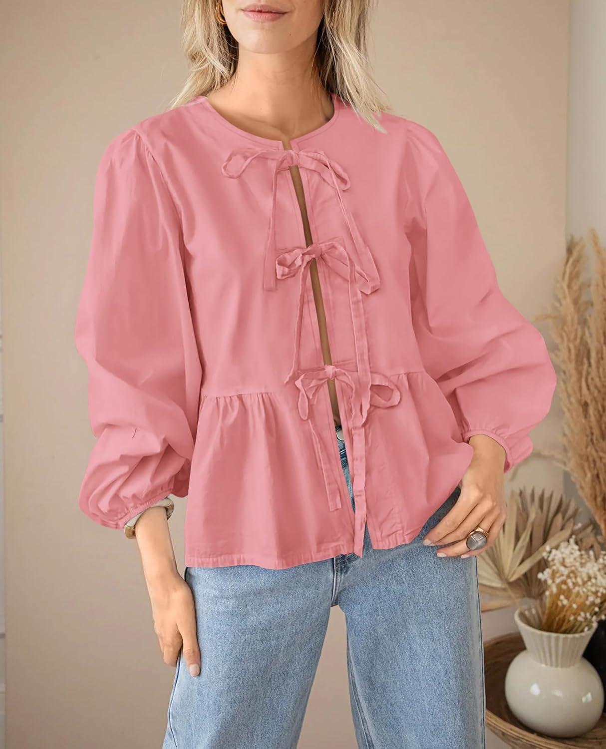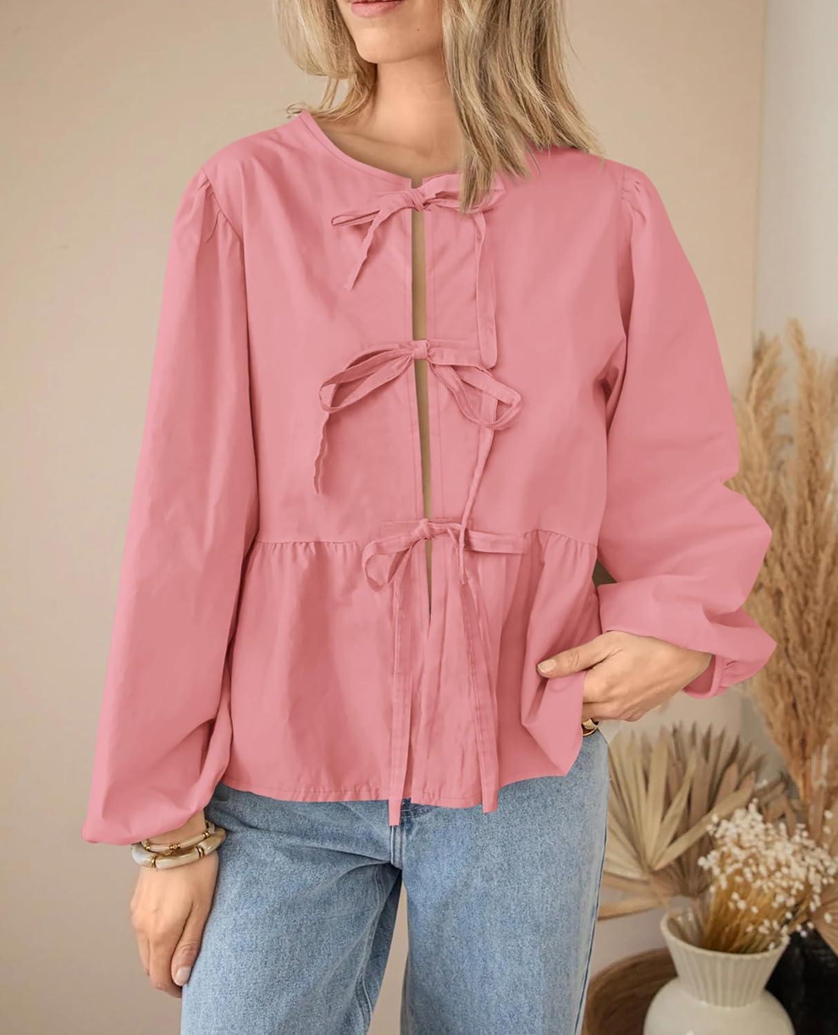 PRETTYGARDEN Women’s Spring Fall Babydoll Peplum Blouse Shirt Puff Long Sleeve Bow Tie Front Trendy Cute Y2K Going Out Tops(Solid Pink)