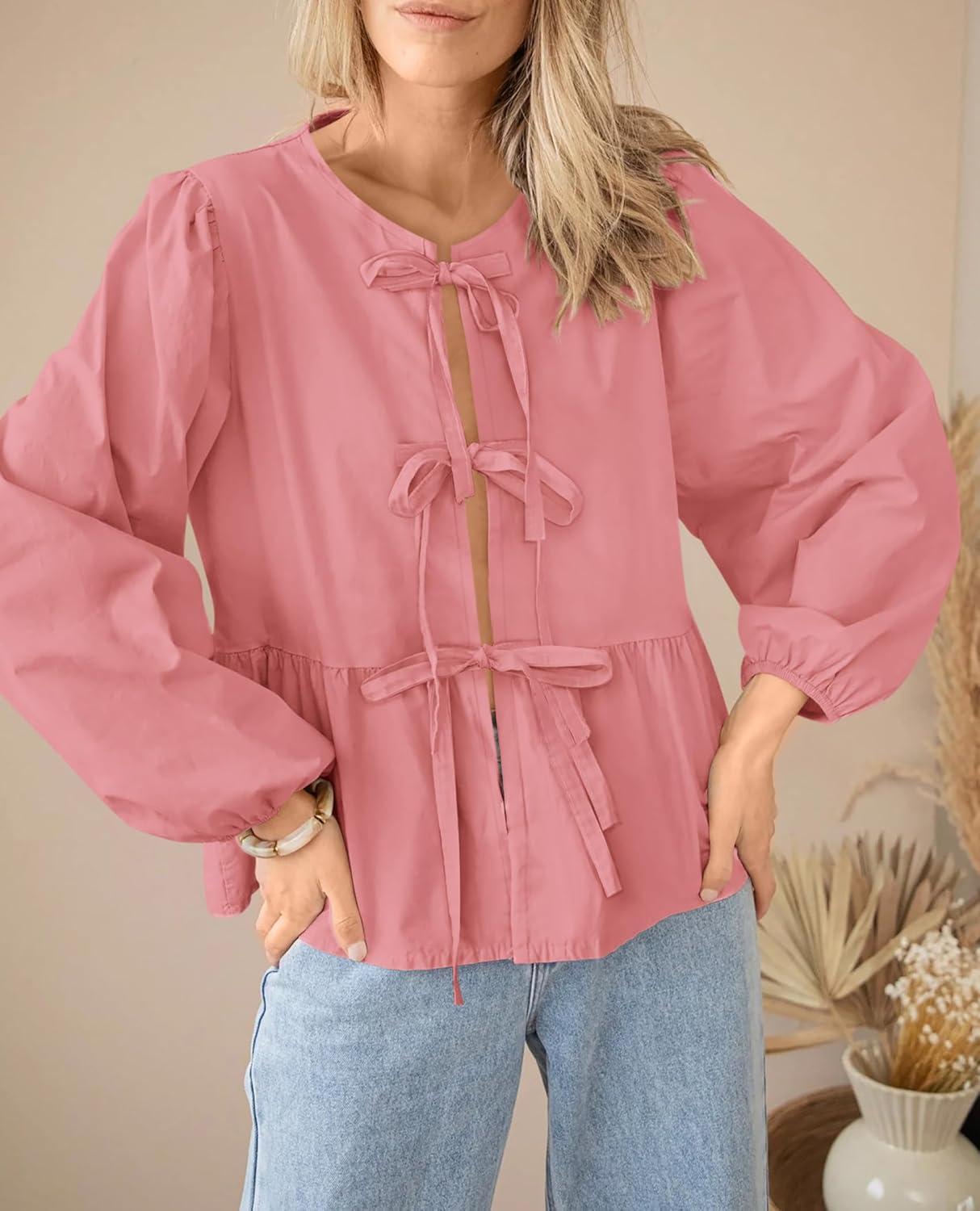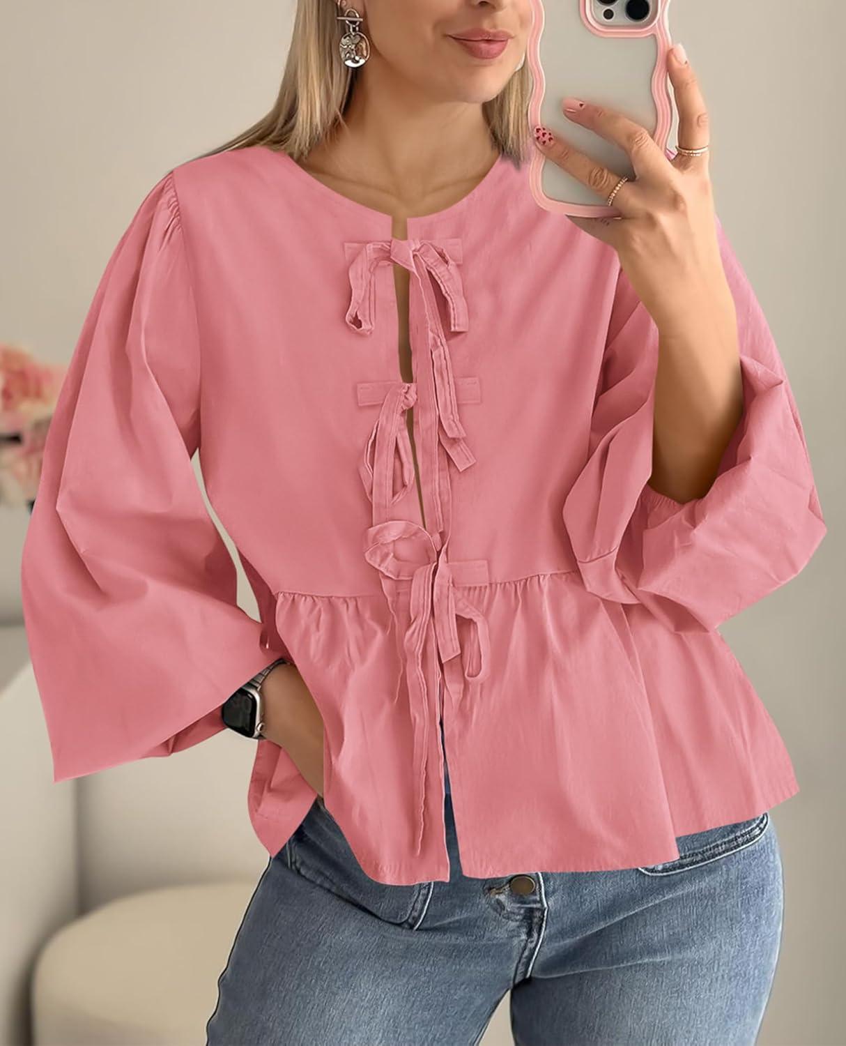 PRETTYGARDEN Women's Spring Fall Babydoll Peplum Blouse Shirt Puff Long Sleeve Bow Tie Front Trendy Cute Y2K Going Out Tops(Solid Pink)
