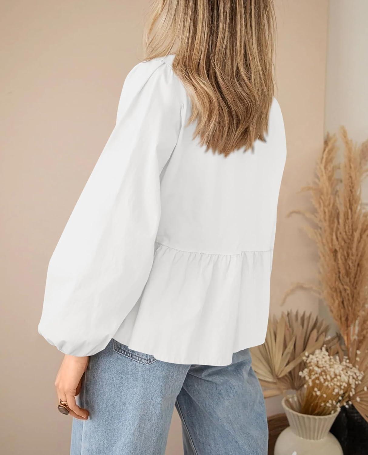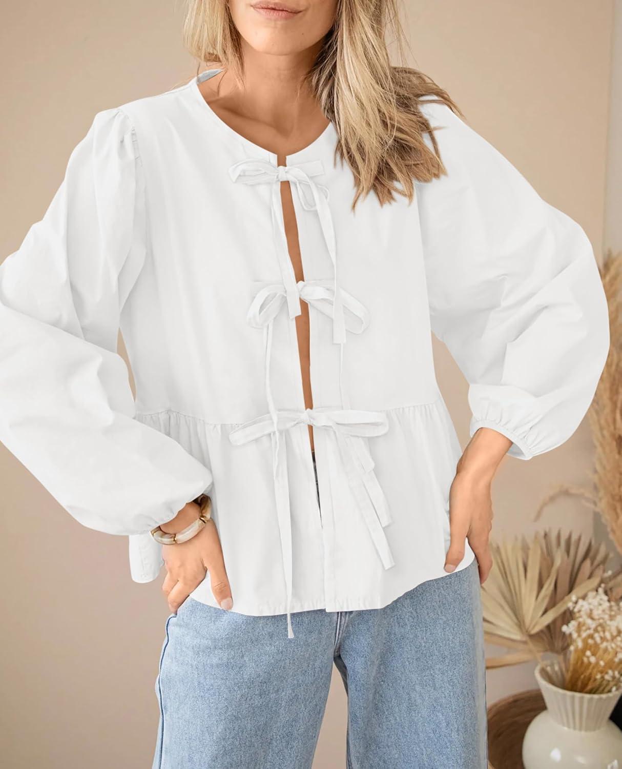 PRETTYGARDEN Women's Spring Fall Babydoll Peplum Blouse Shirt Puff Long Sleeve Bow Tie Front Trendy Cute Y2K Going Out Tops(White)