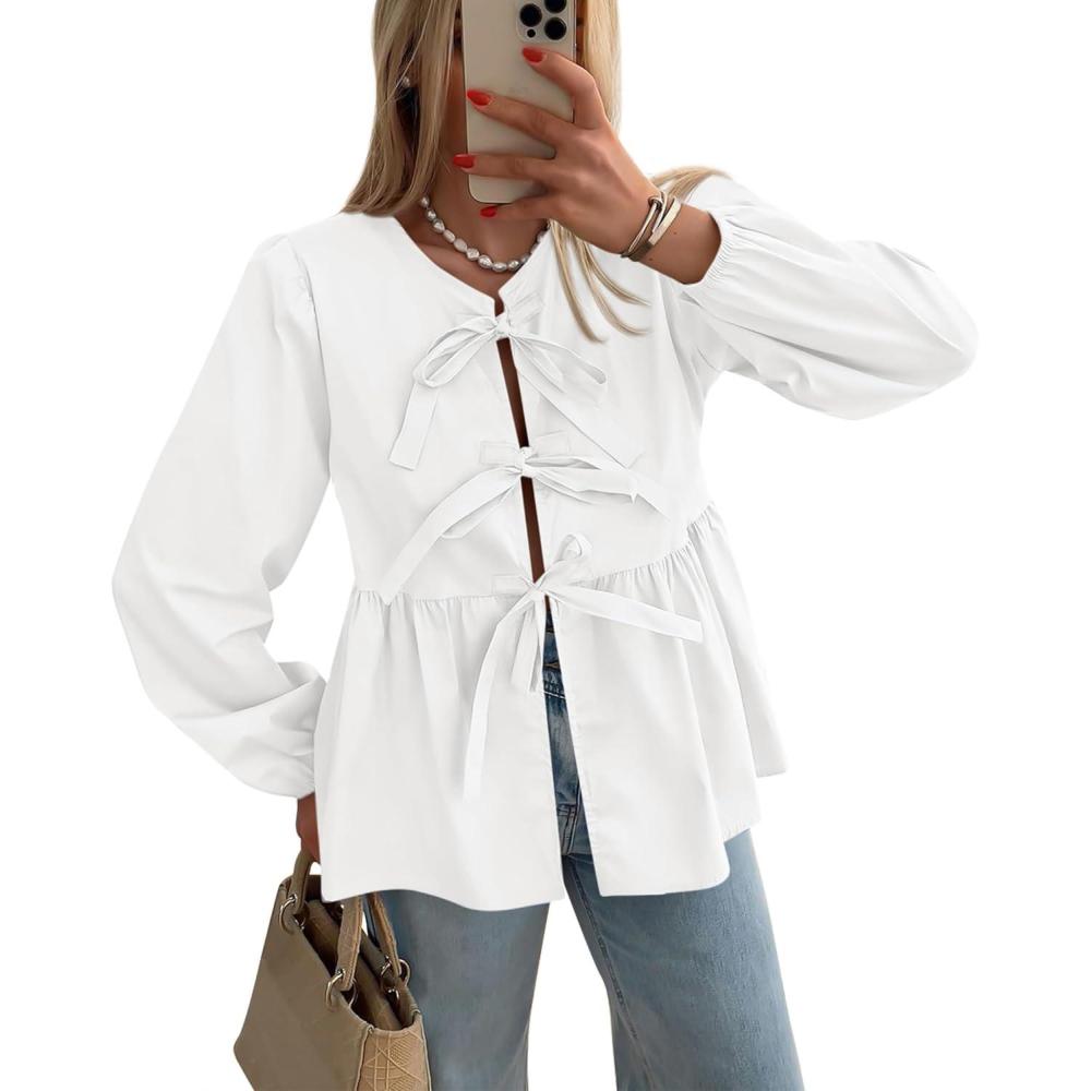 PRETTYGARDEN Women’s Spring Fall Babydoll Peplum Blouse Shirt Puff Long Sleeve Bow Tie Front Trendy Cute Y2K Going Out Tops(White)