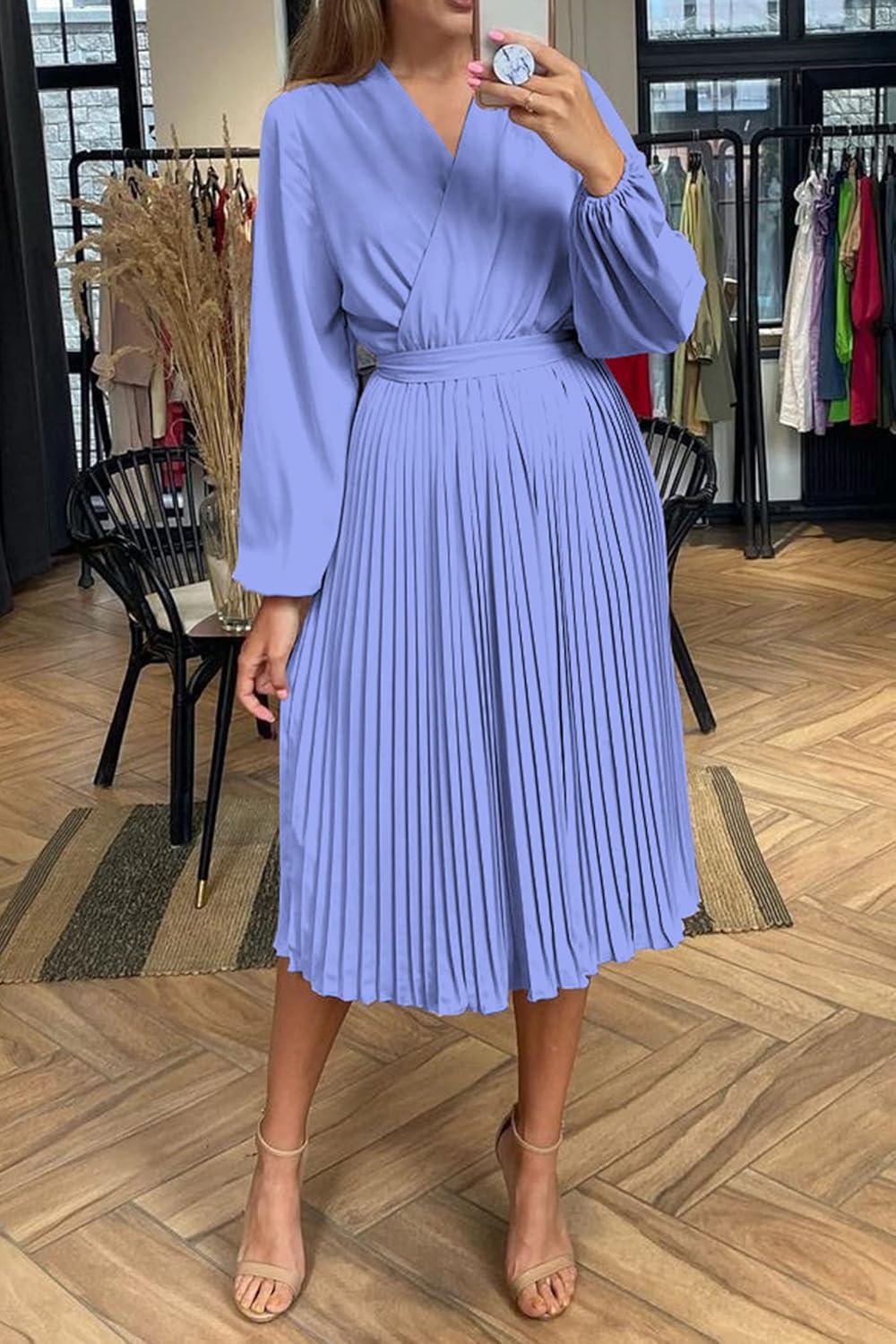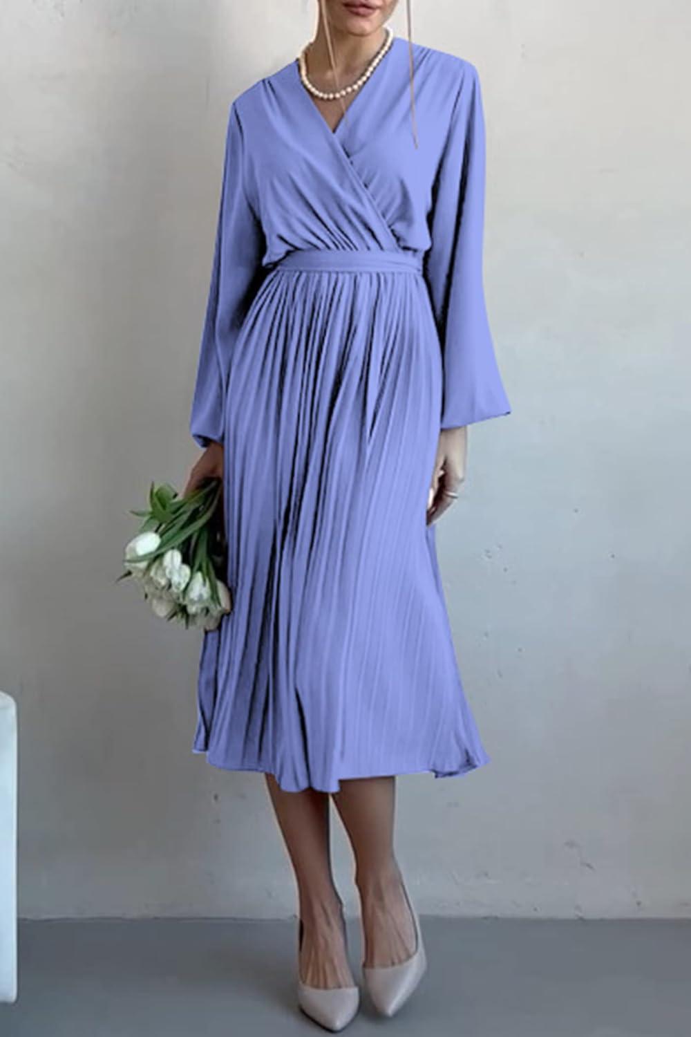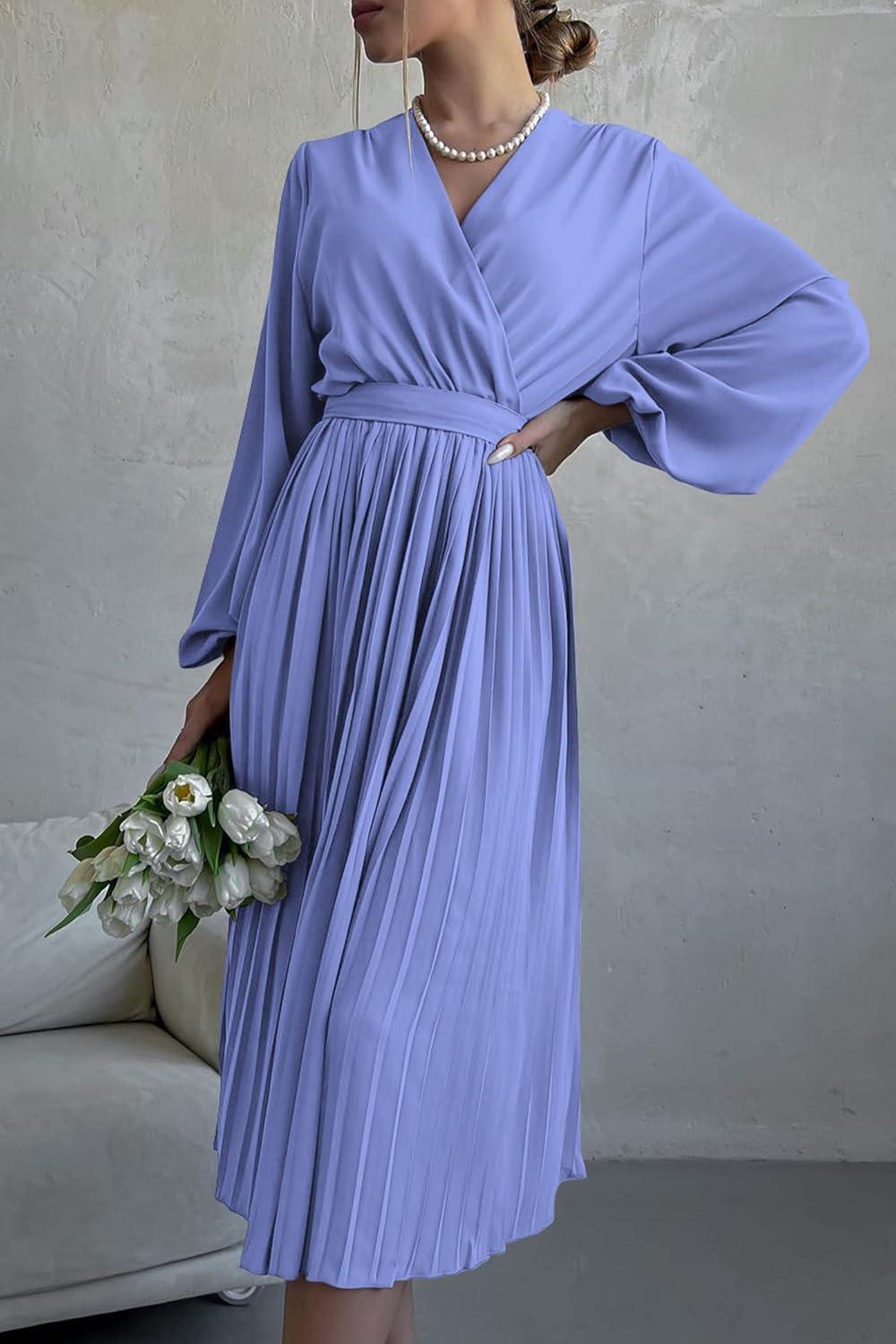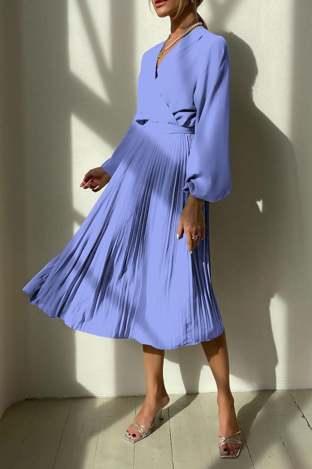 PRETTYGARDEN Women's Spring Midi Dress Long Puff Sleeve Wrap V Neck Flowy Ruffle Pleated Casual Fall Dresses(Blue)