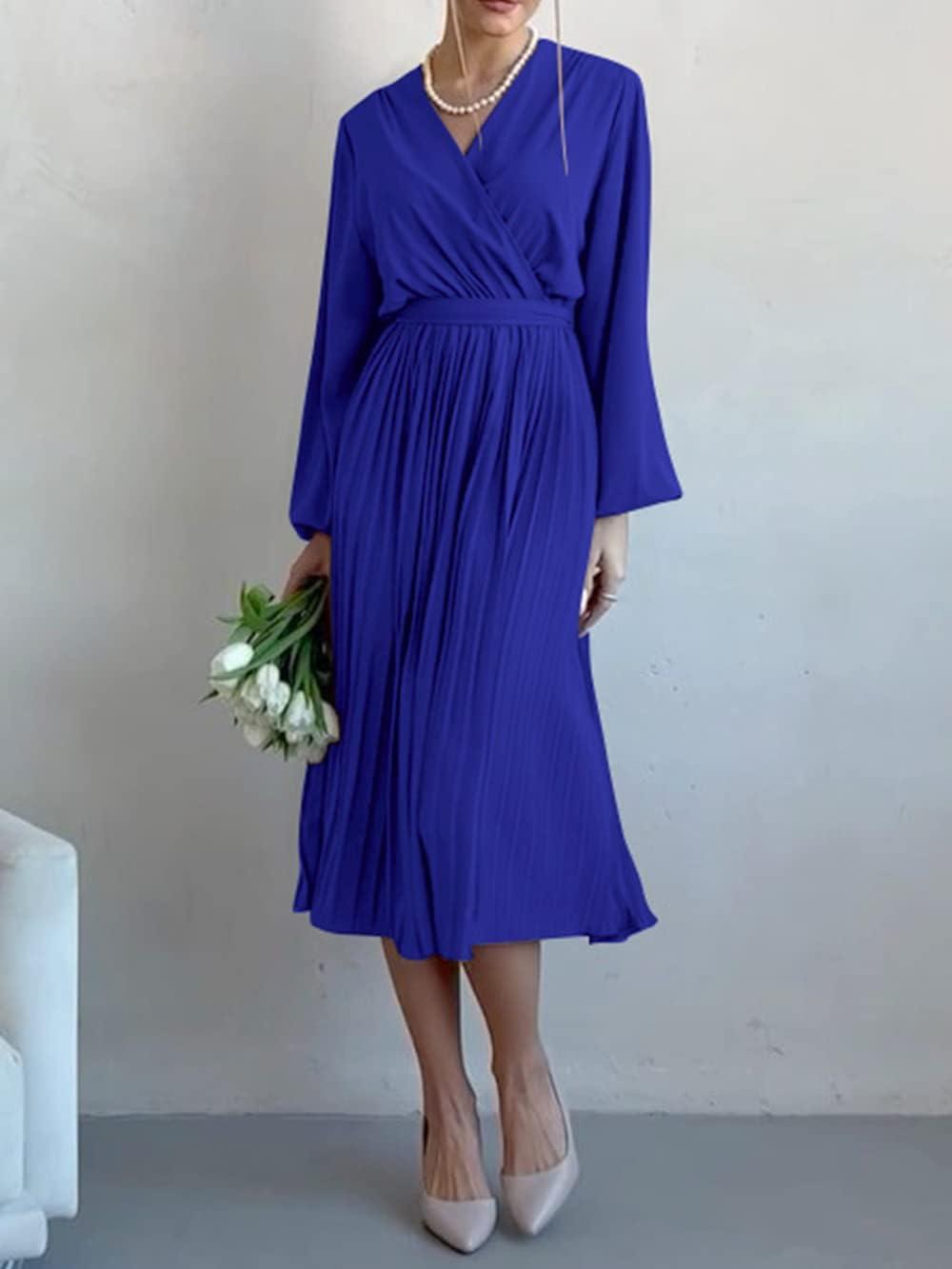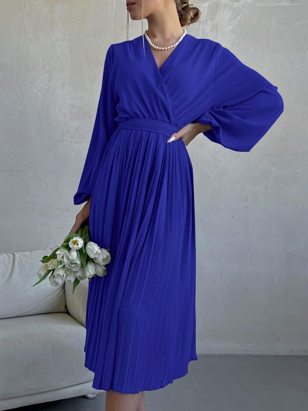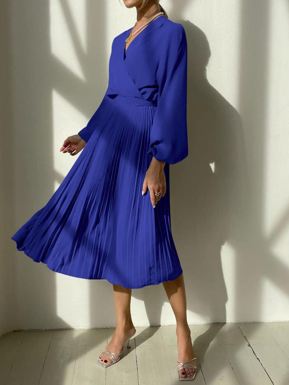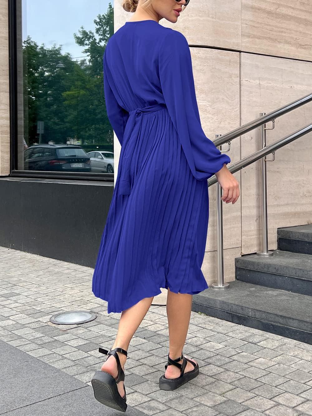 PRETTYGARDEN Women's Spring Midi Dress Long Puff Sleeve Wrap V Neck Flowy Ruffle Pleated Casual Fall Dresses(Bright Blue)