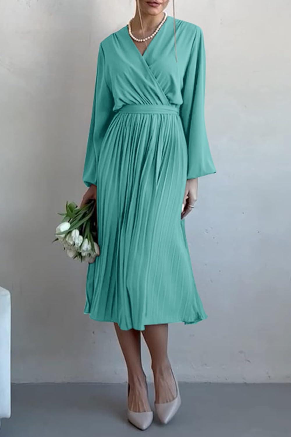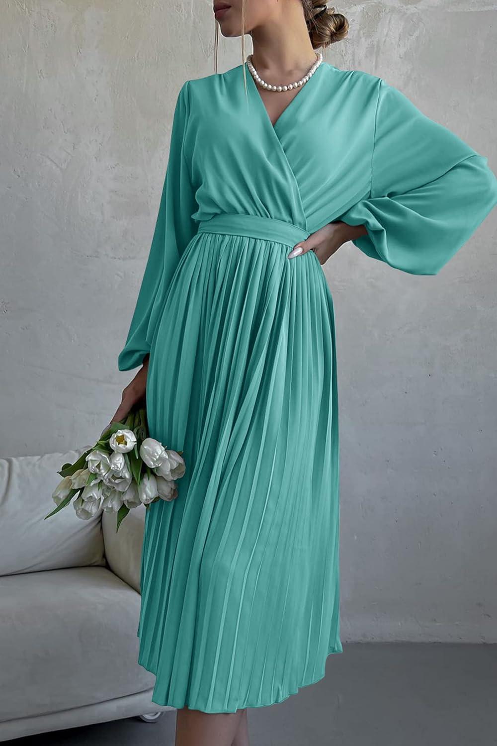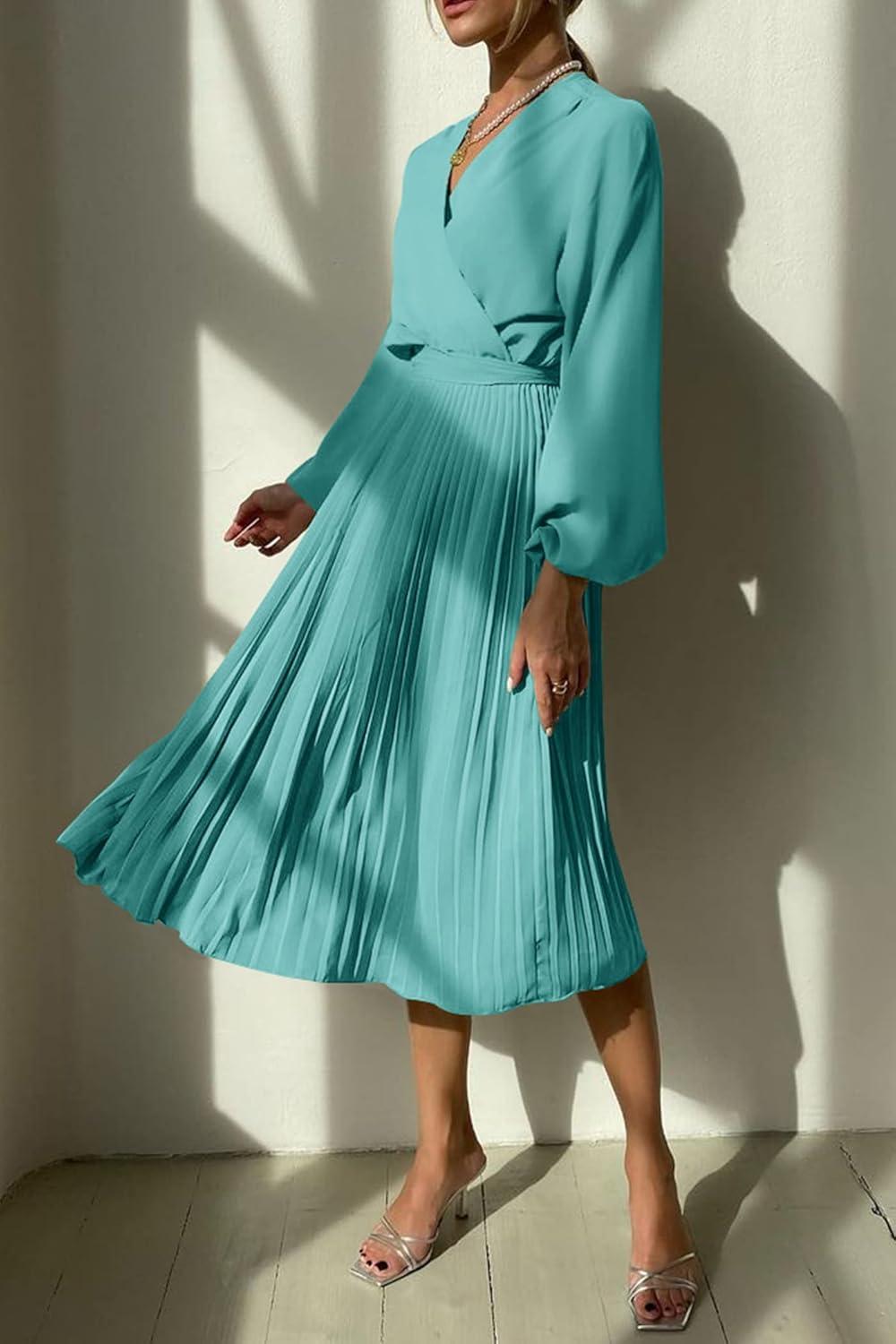 PRETTYGARDEN Women's Spring Midi Dress Long Puff Sleeve Wrap V Neck Flowy Ruffle Pleated Casual Fall Dresses(Cyan)