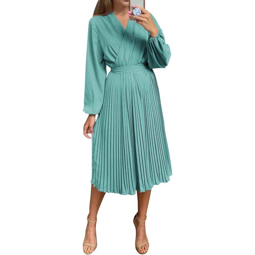 imagePRETTYGARDEN Womens Spring Midi Dress Long Puff Sleeve Wrap V Neck Flowy Ruffle Pleated Casual Fall DressesCyan