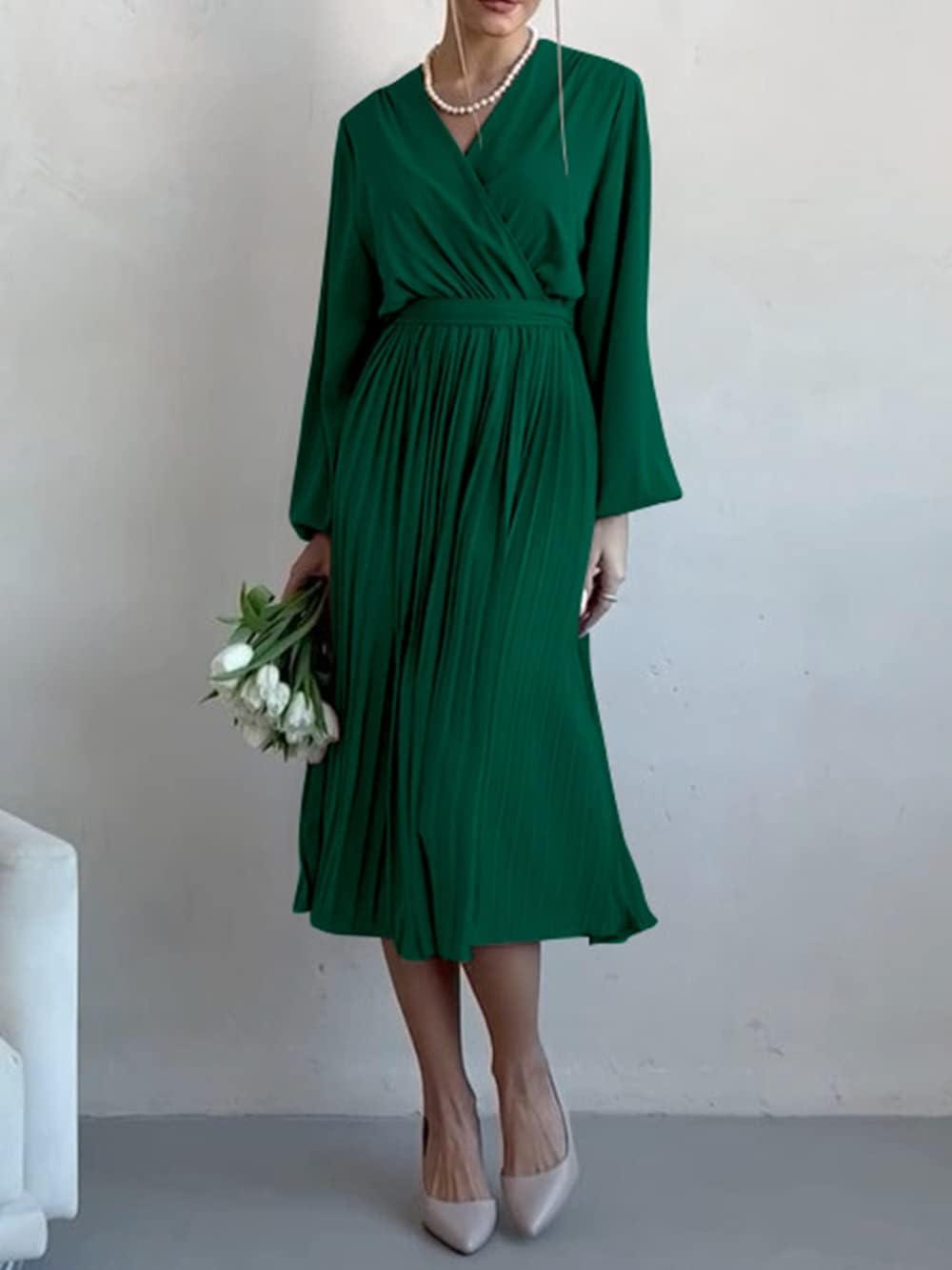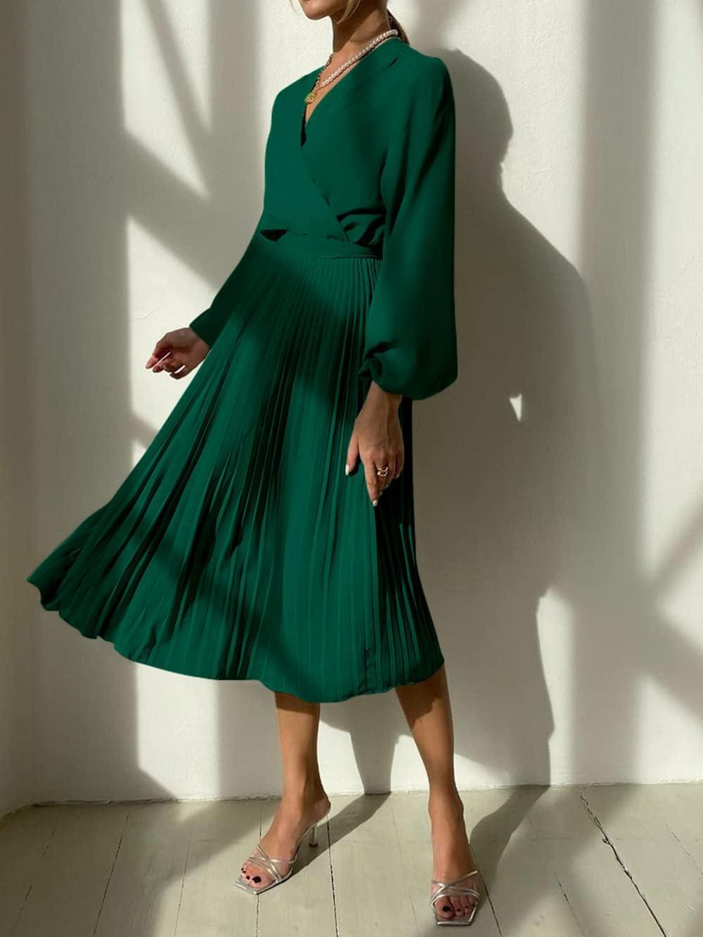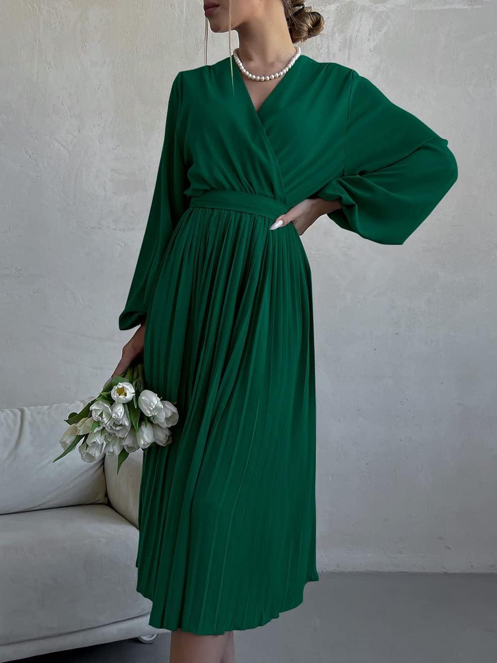 PRETTYGARDEN Women's Spring Midi Dress Long Puff Sleeve Wrap V Neck Flowy Ruffle Pleated Casual Fall Dresses(Dark Green)