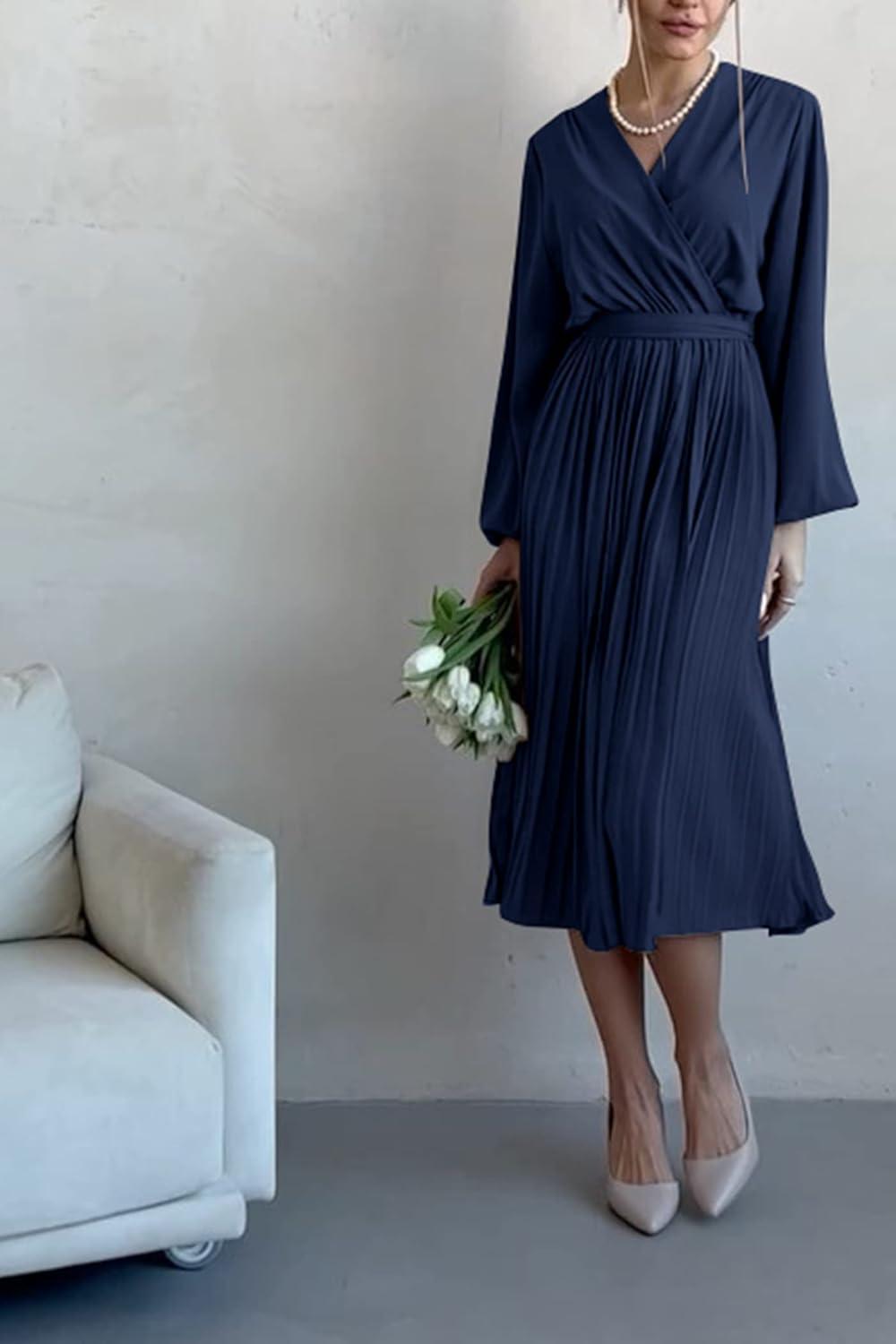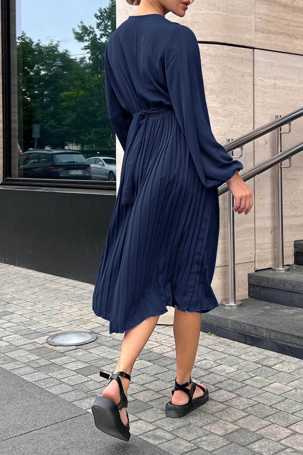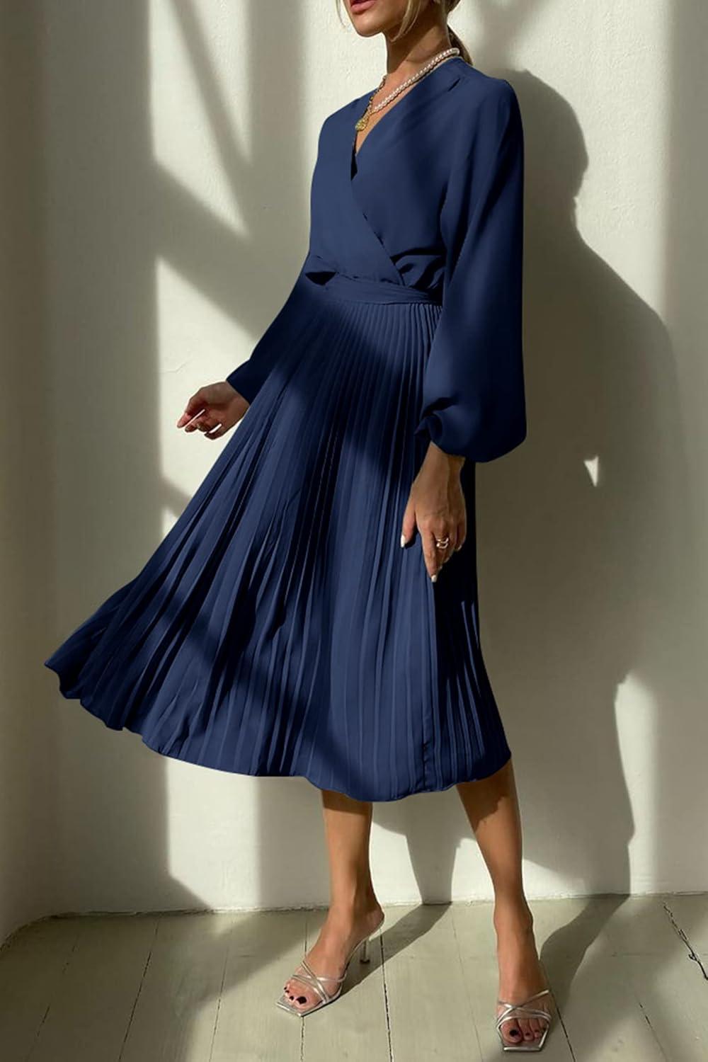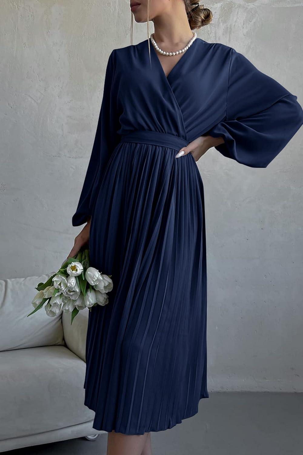 PRETTYGARDEN Women's Spring Midi Dress Long Puff Sleeve Wrap V Neck Flowy Ruffle Pleated Casual Fall Dresses(Navy)