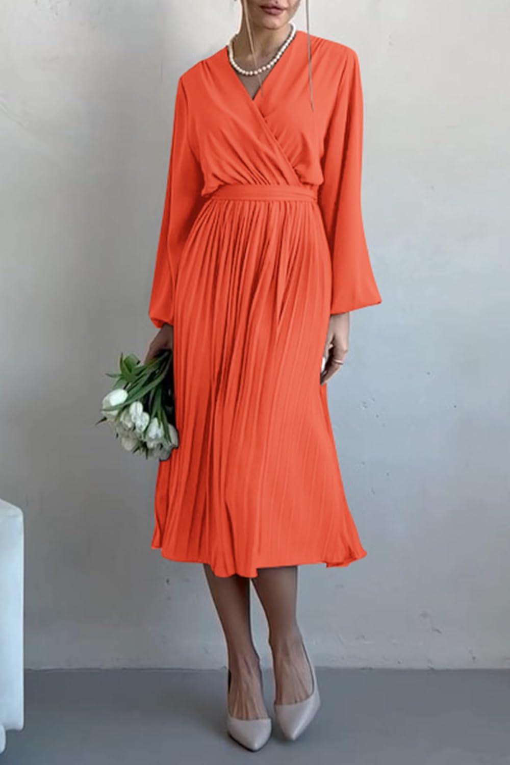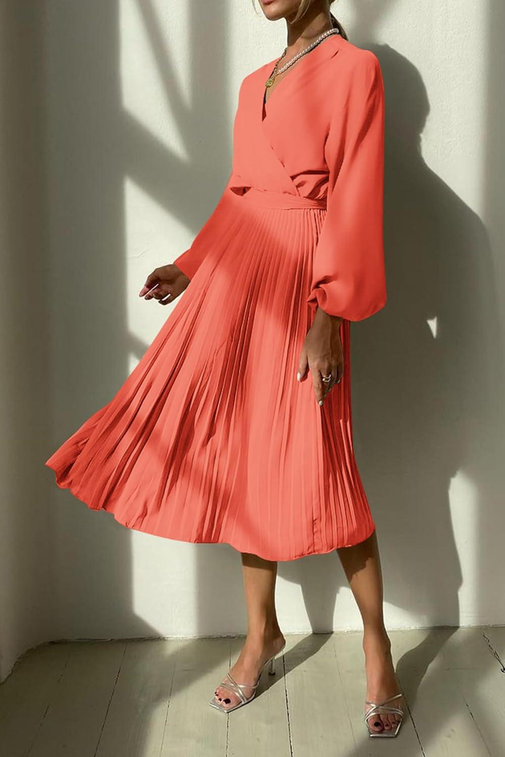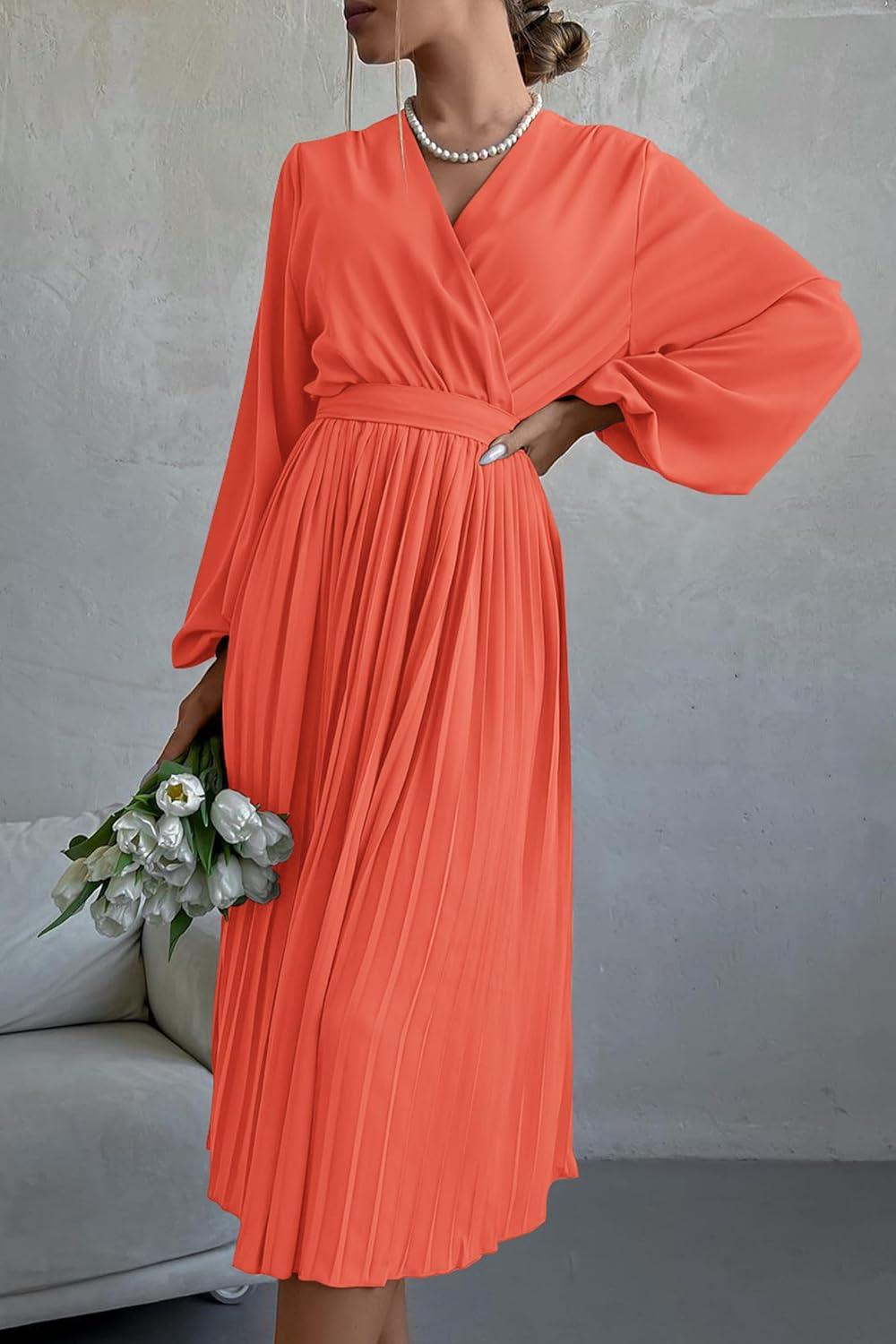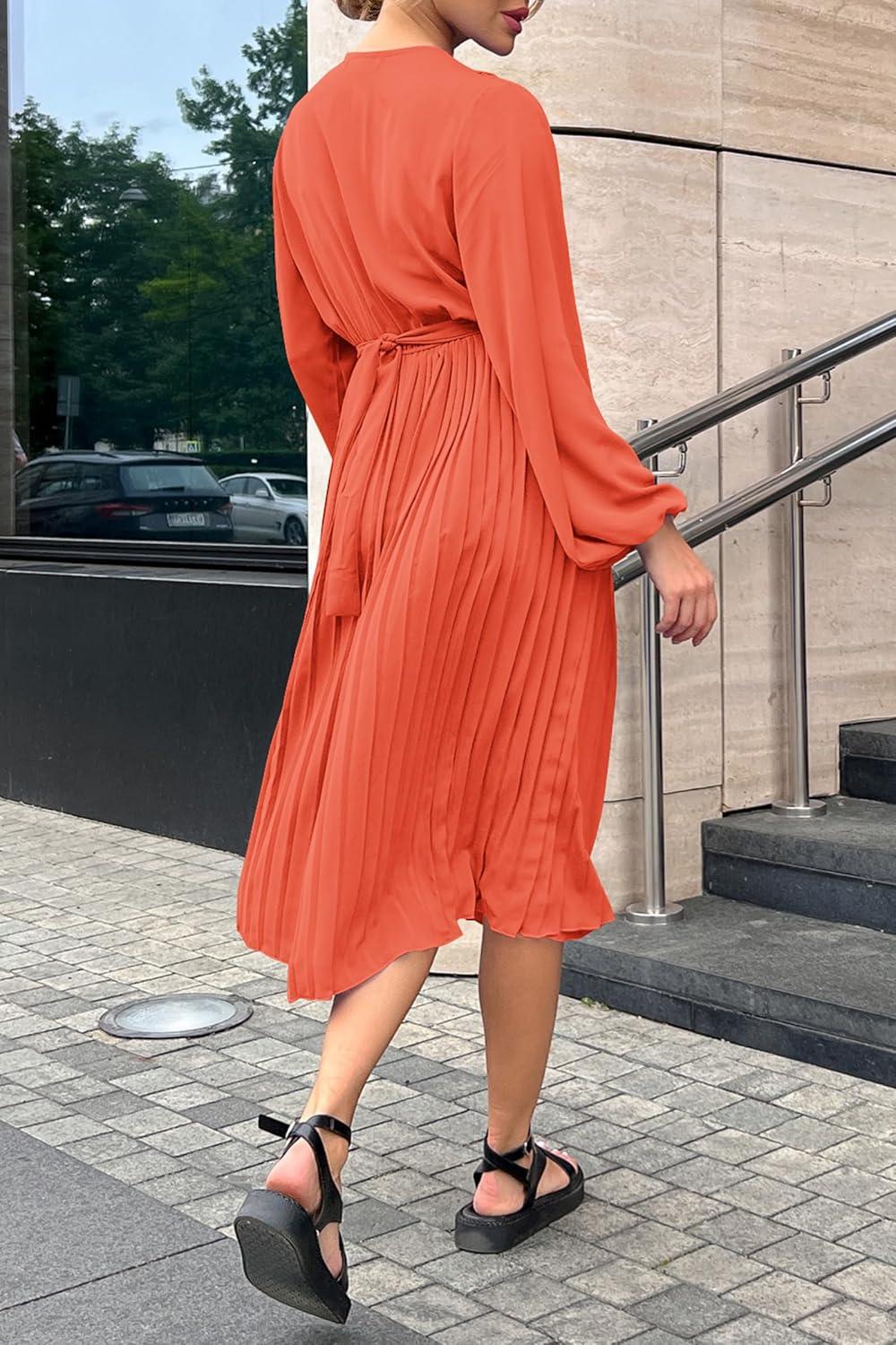 PRETTYGARDEN Women's Spring Midi Dress Long Puff Sleeve Wrap V Neck Flowy Ruffle Pleated Casual Fall Dresses(Orange)