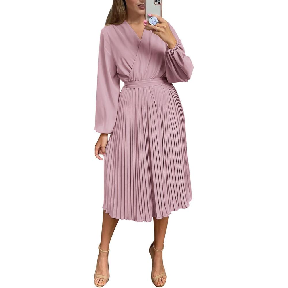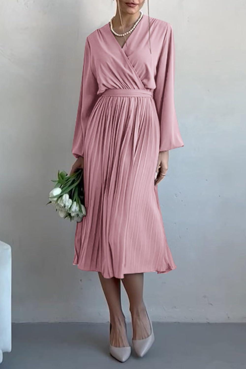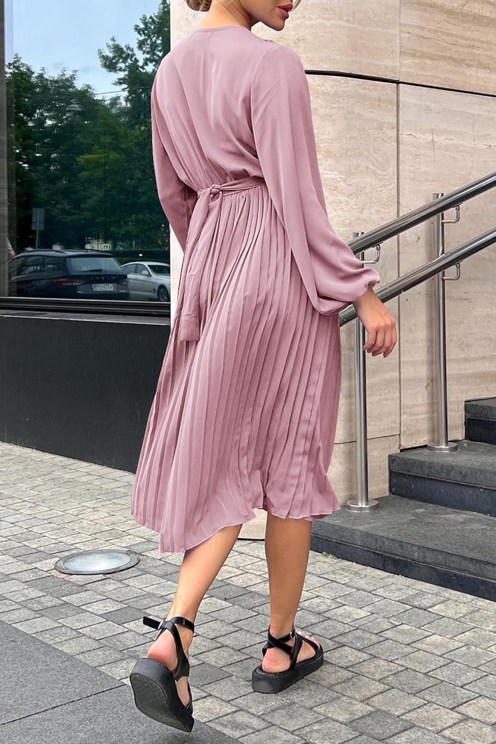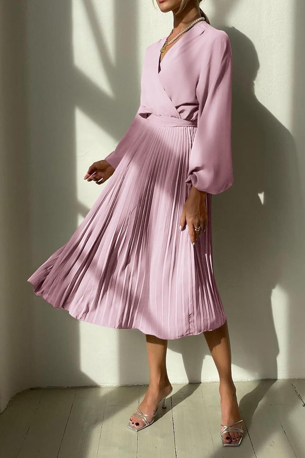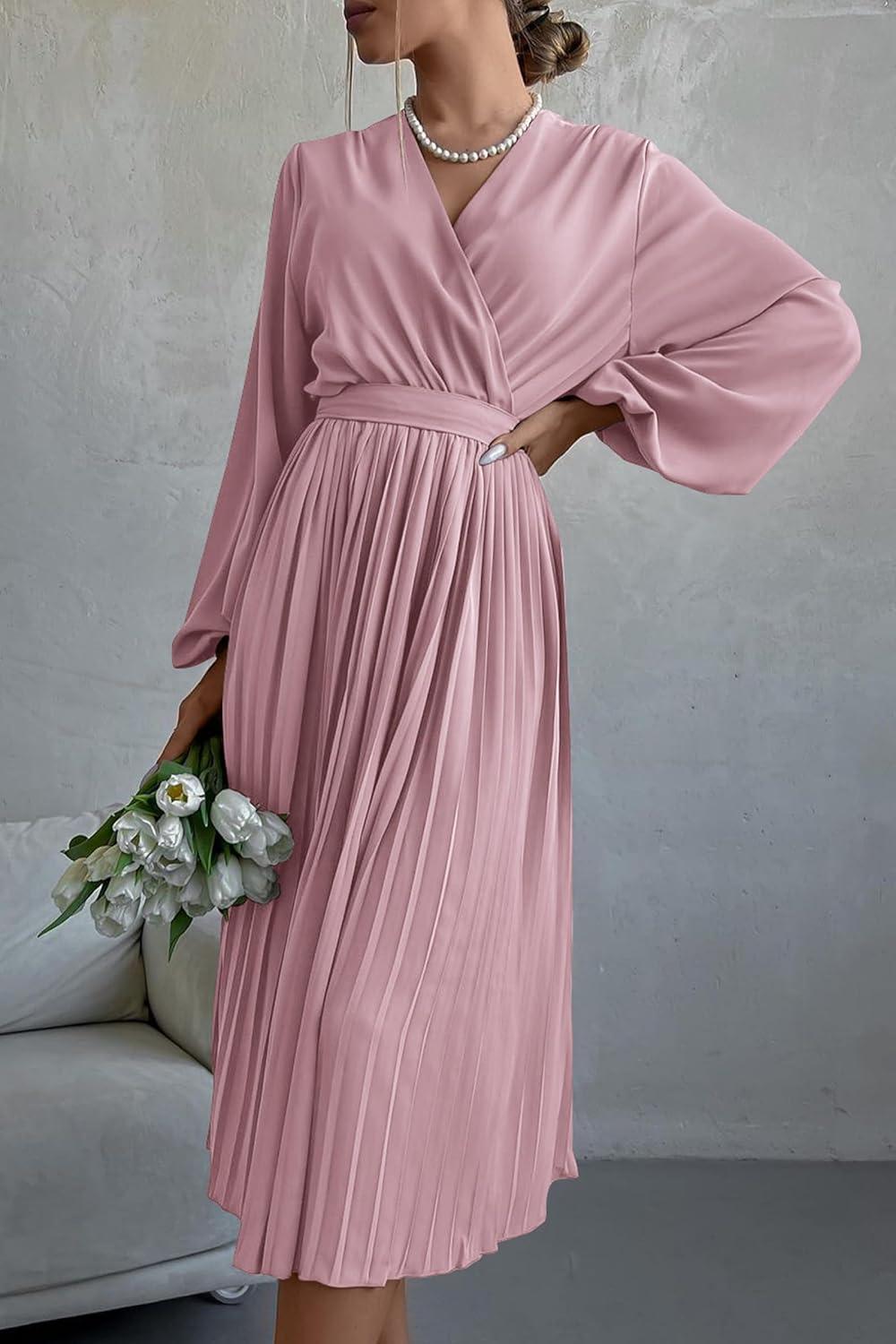 PRETTYGARDEN Women's Spring Midi Dress Long Puff Sleeve Wrap V Neck Flowy Ruffle Pleated Casual Fall Dresses(Pink)