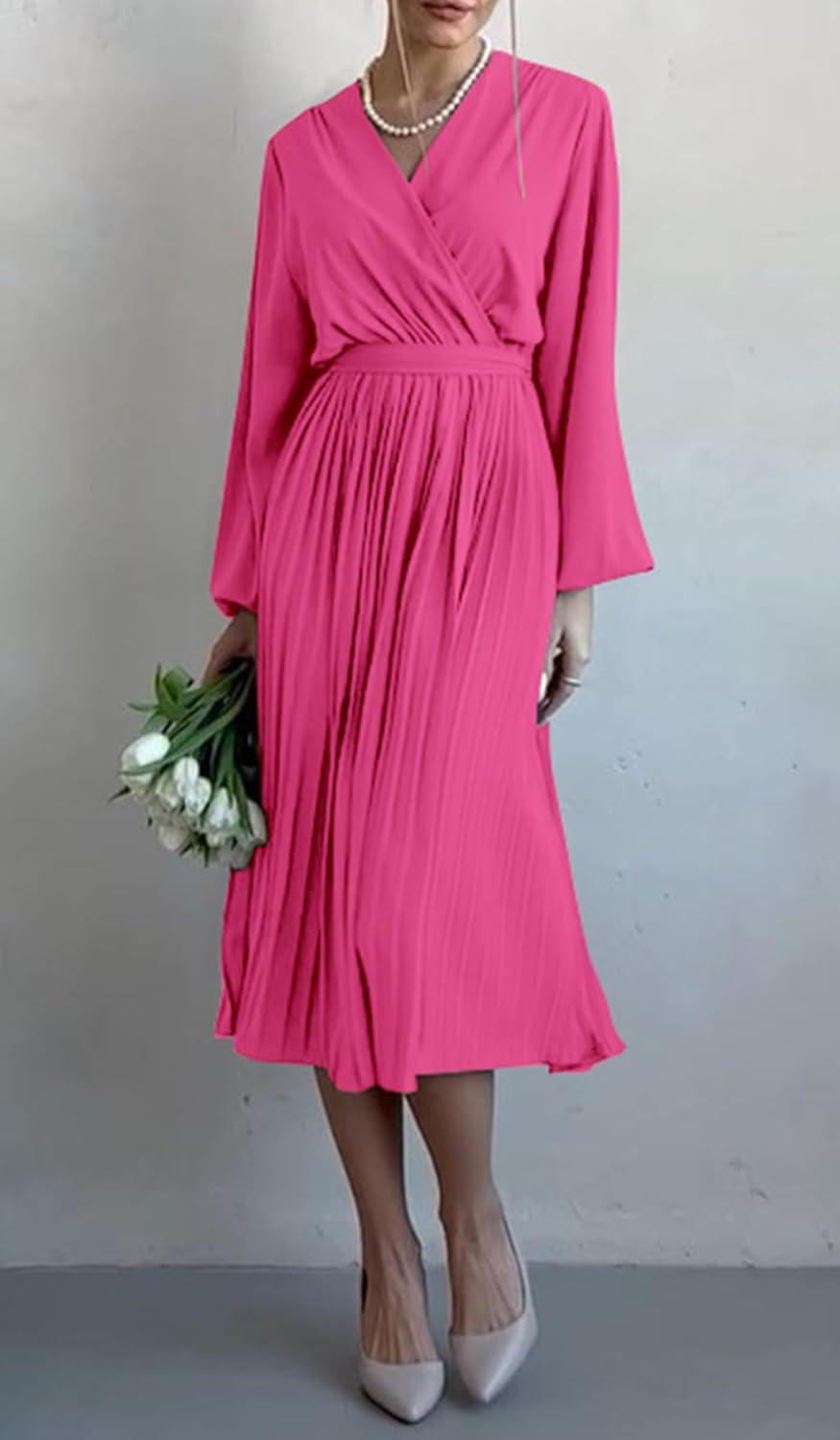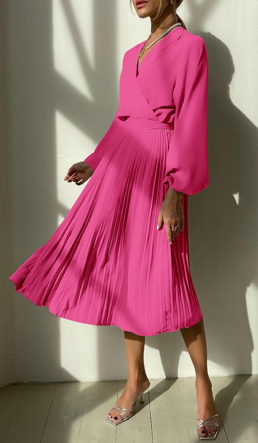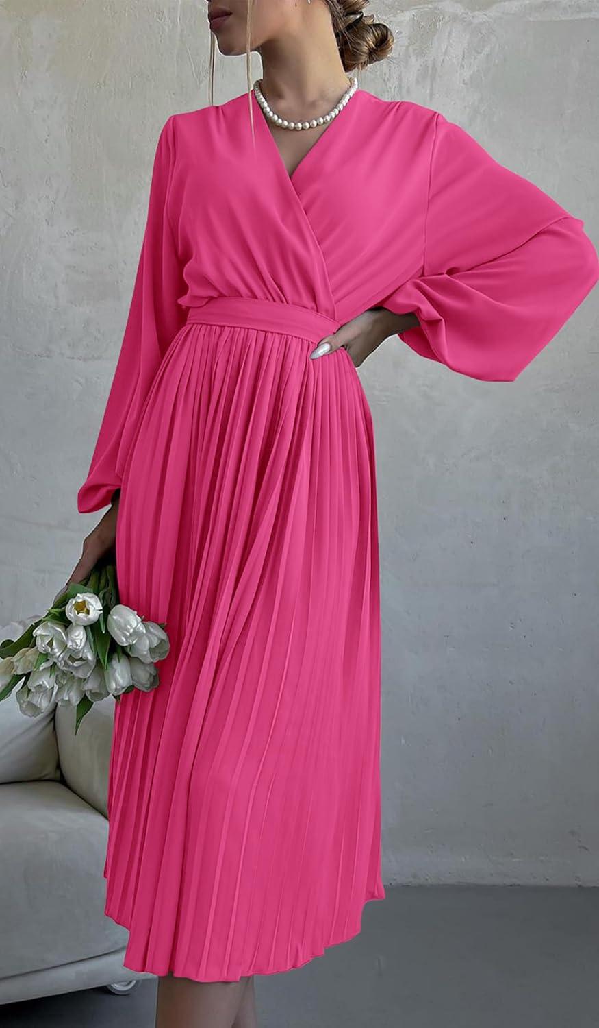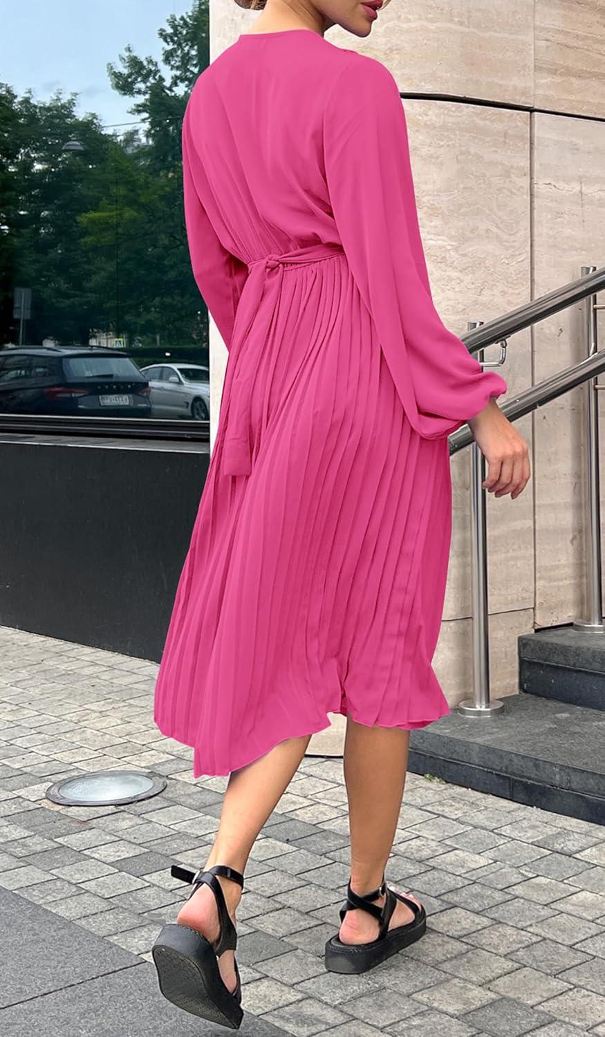 PRETTYGARDEN Women's Spring Midi Dress Long Puff Sleeve Wrap V Neck Flowy Ruffle Pleated Casual Fall Dresses(Rose Red)