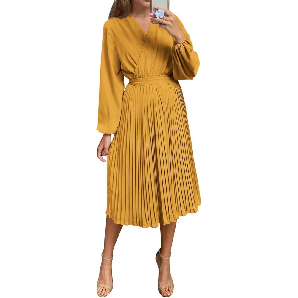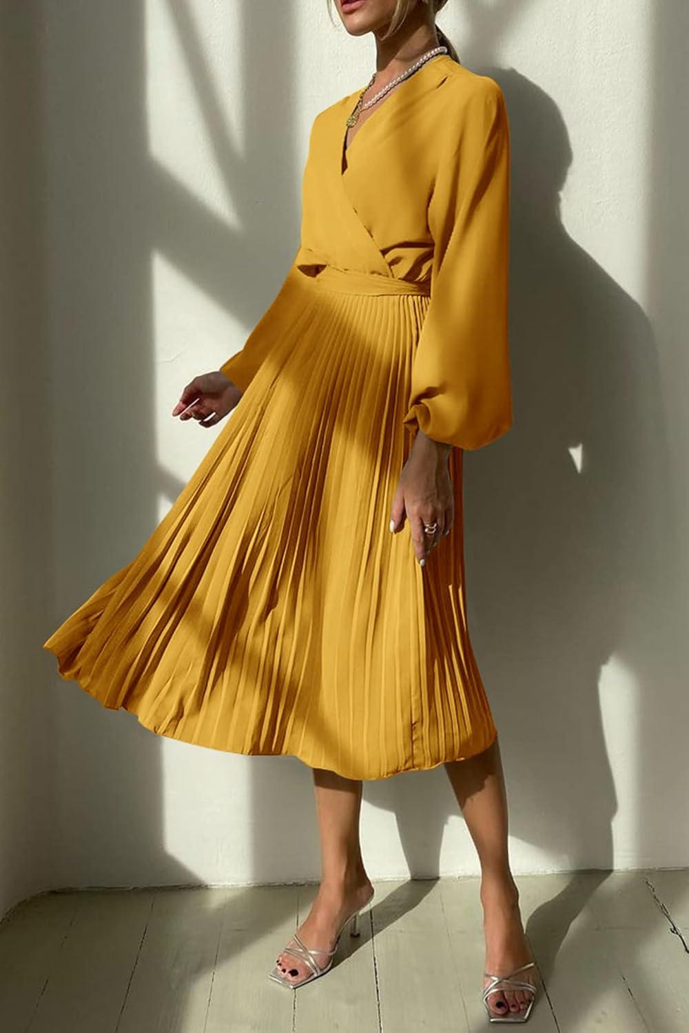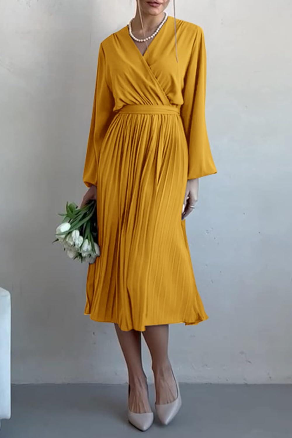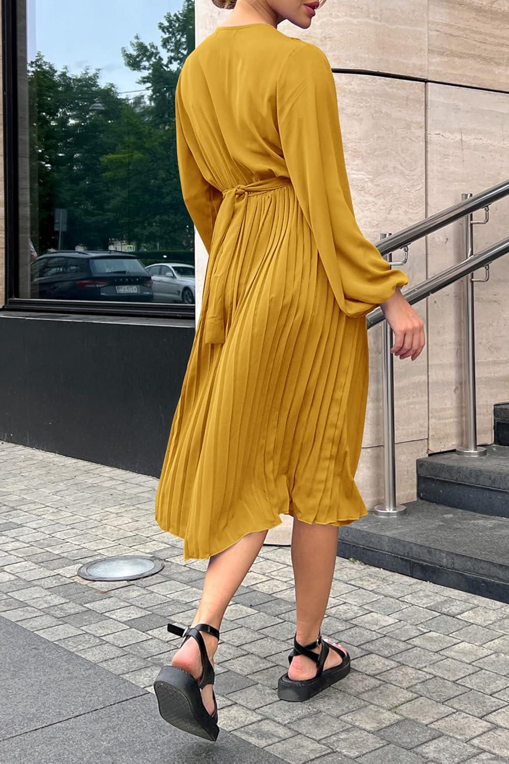 PRETTYGARDEN Women's Spring Midi Dress Long Puff Sleeve Wrap V Neck Flowy Ruffle Pleated Casual Fall Dresses(Yellow)