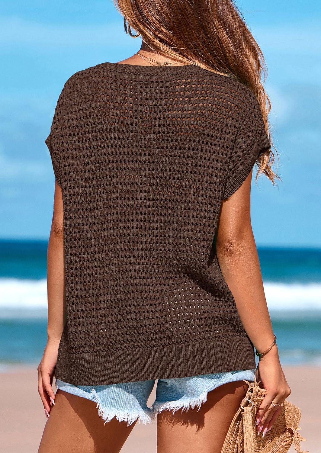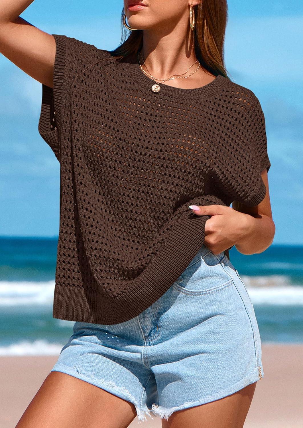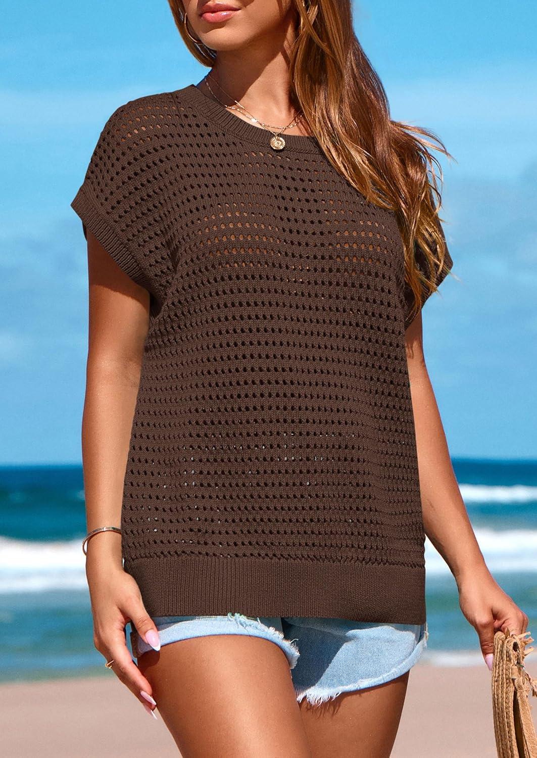 PRETTYGARDEN Womens Spring Tops 2025 Summer Shirts Crochet Cap Sleeve Sweater Pullover Cute Beach Vacation Clothes(Coffee)