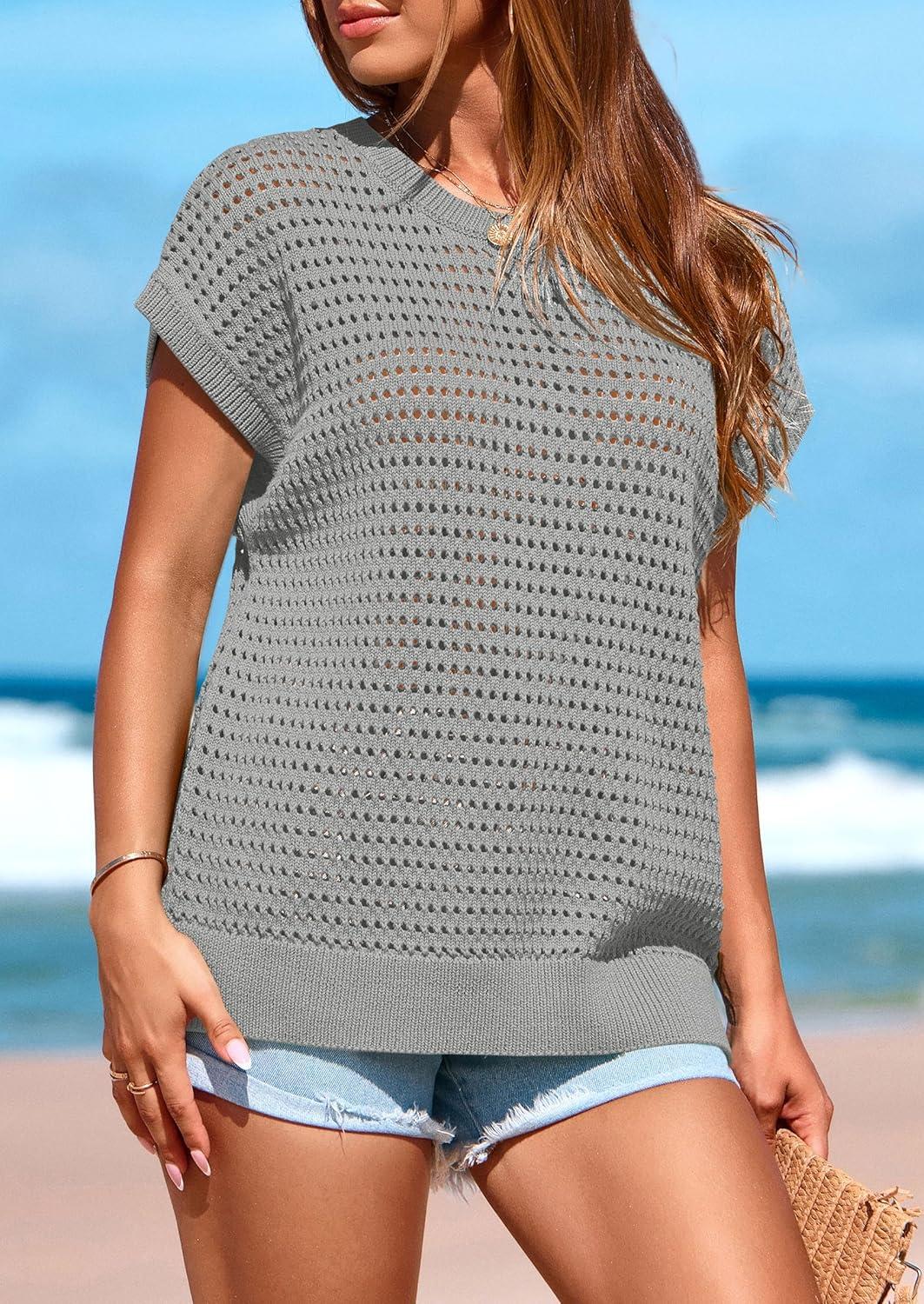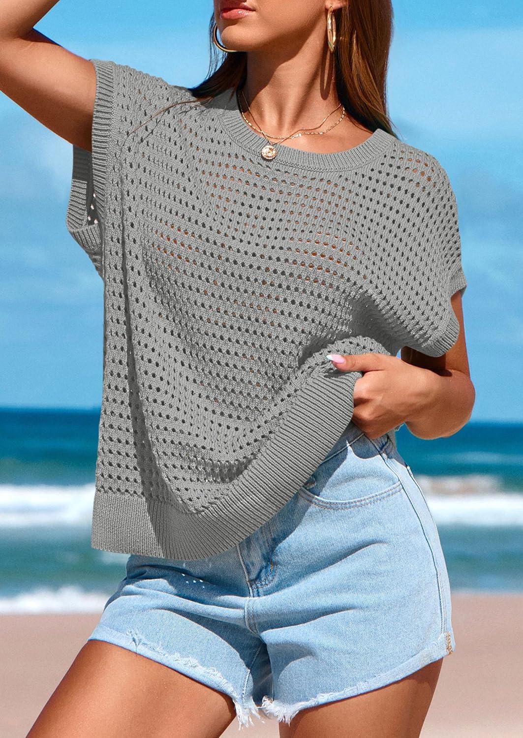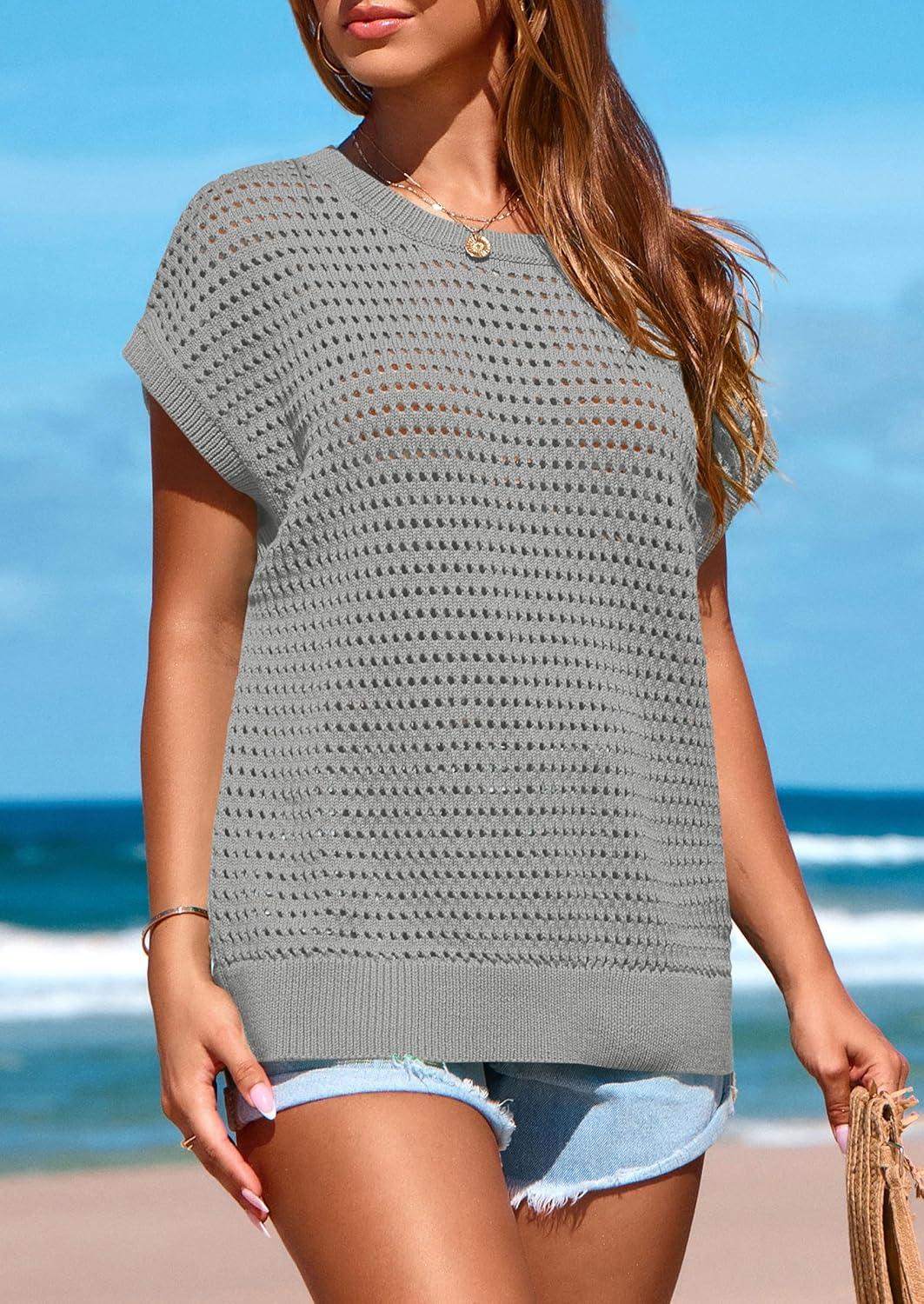 PRETTYGARDEN Womens Spring Tops 2025 Summer Shirts Crochet Cap Sleeve Sweater Pullover Cute Beach Vacation Clothes(Grey)