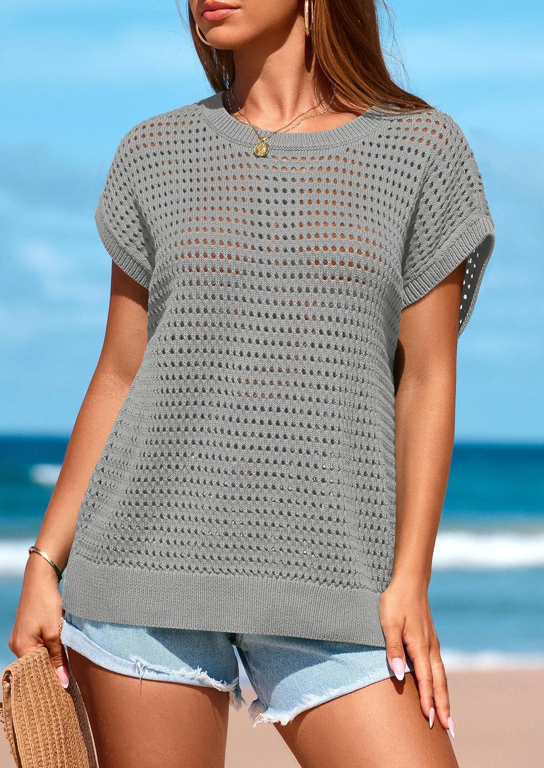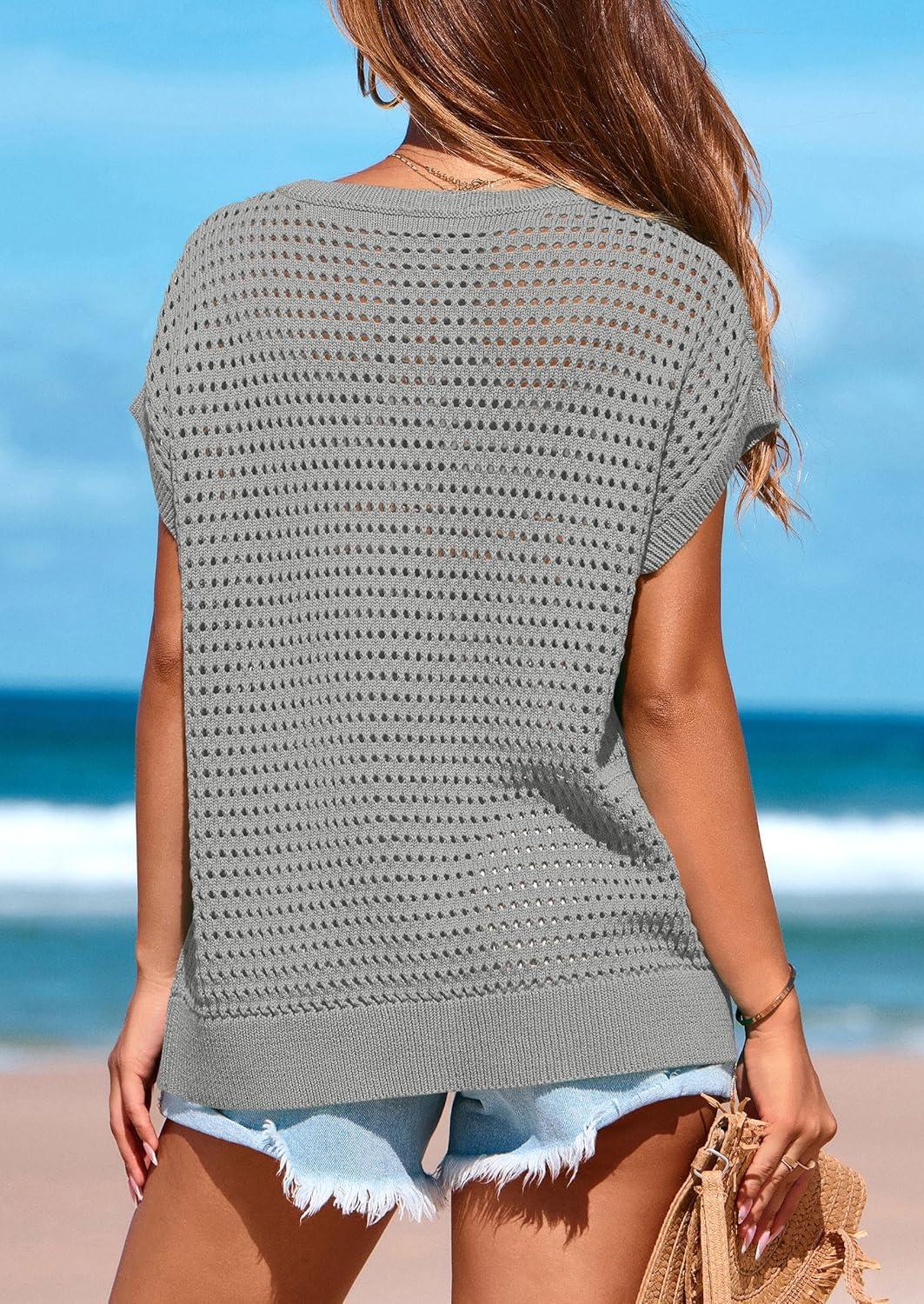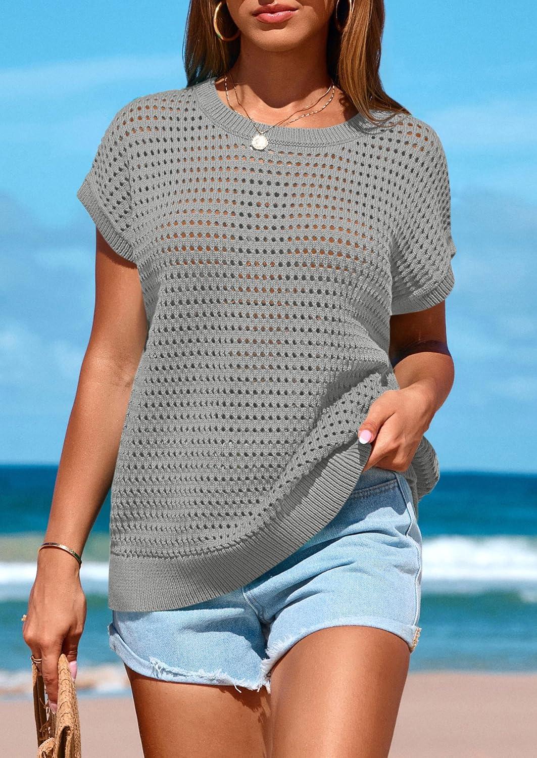 PRETTYGARDEN Womens Spring Tops 2025 Summer Shirts Crochet Cap Sleeve Sweater Pullover Cute Beach Vacation Clothes(Grey)