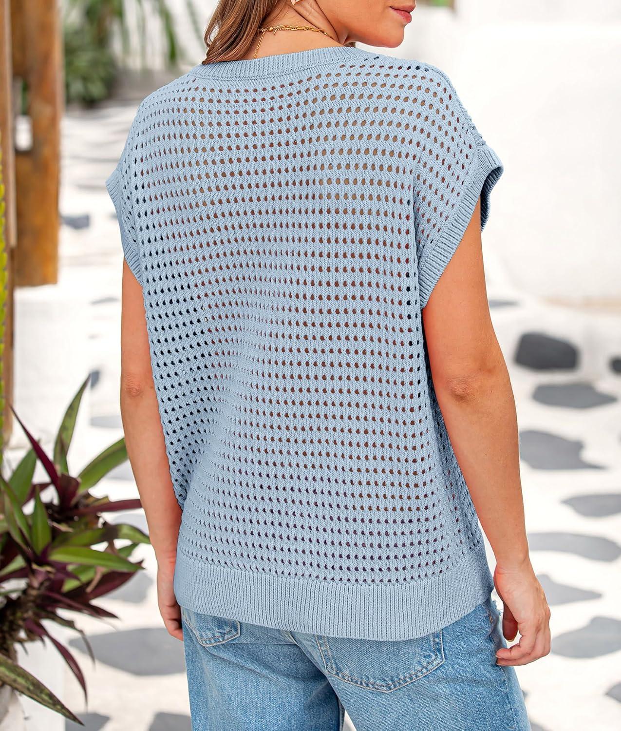 PRETTYGARDEN Womens Spring Tops 2025 Summer Shirts Crochet Cap Sleeve Sweater Pullover Cute Beach Vacation Clothes(Light Blue)