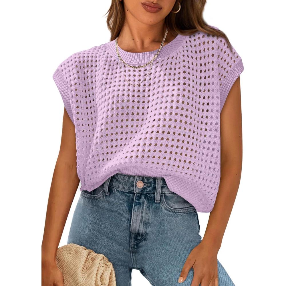 PRETTYGARDEN Womens Spring Tops 2025 Summer Shirts Crochet Cap Sleeve Sweater Pullover Cute Beach Vacation Clothes(Light Purple)