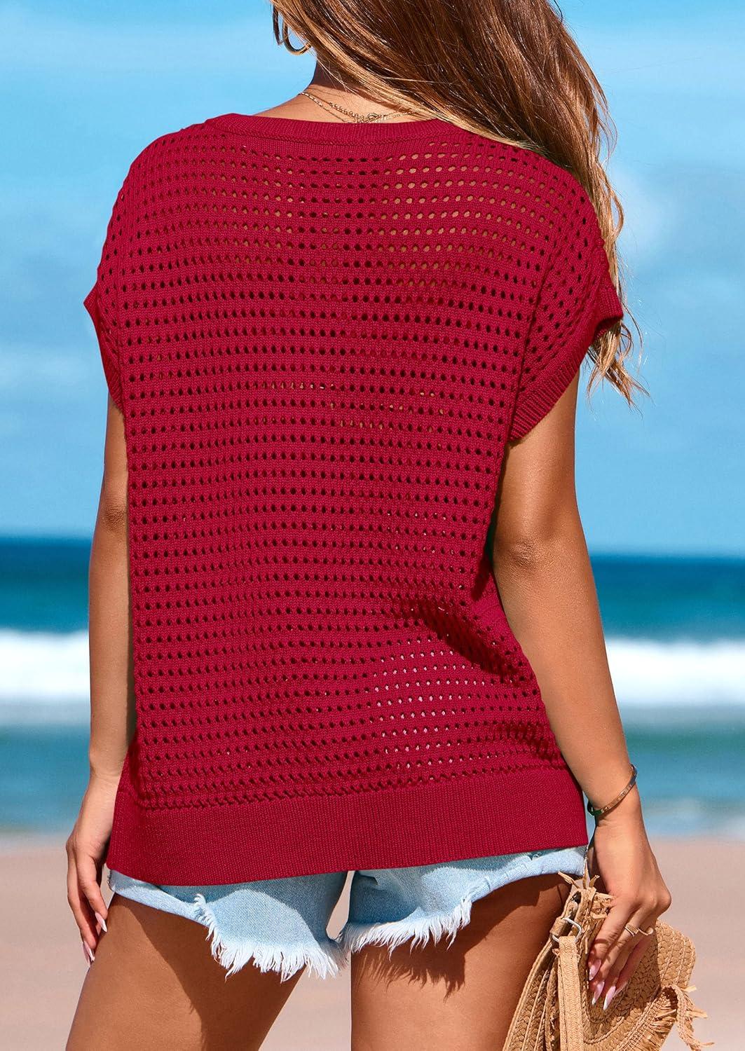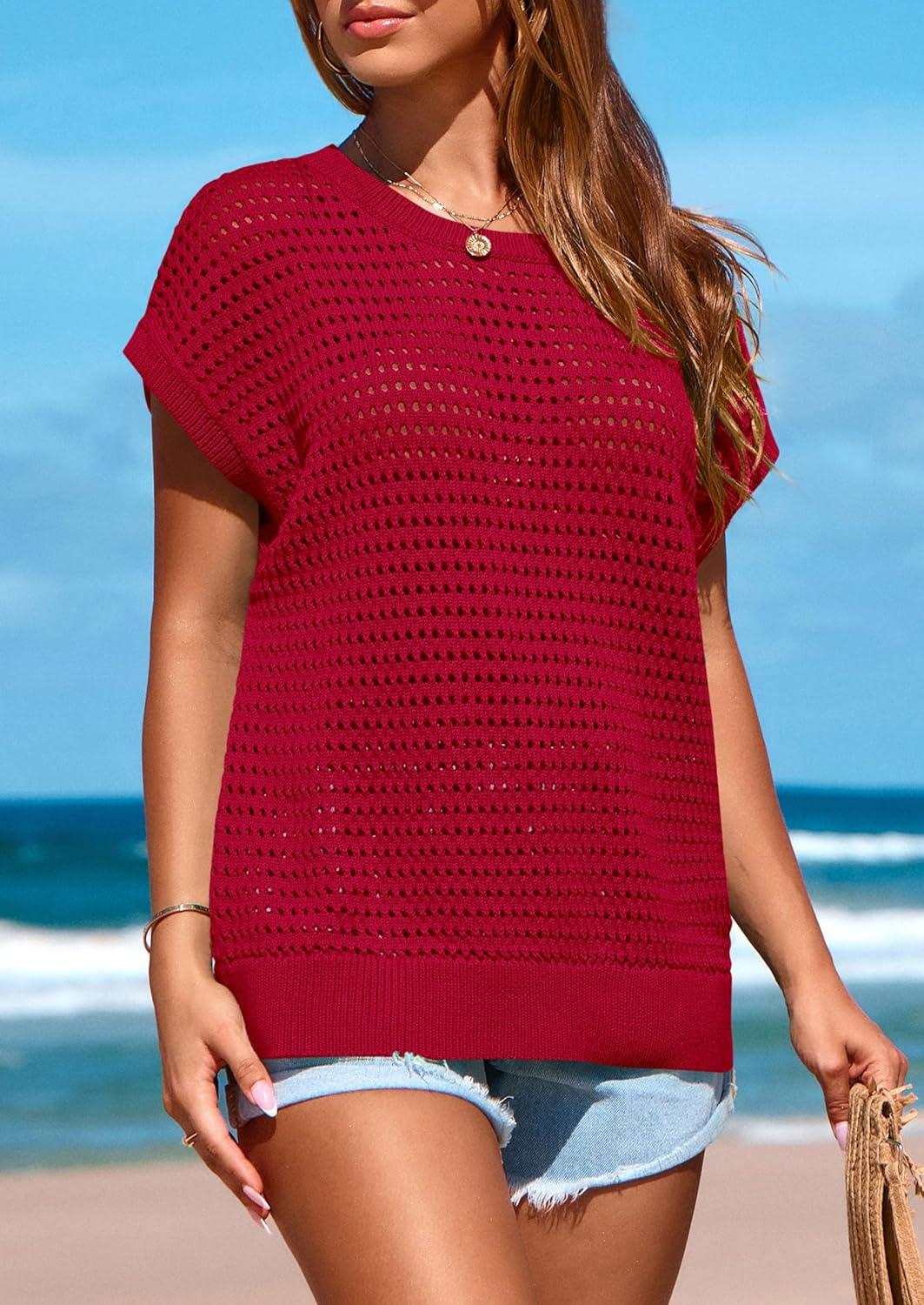 PRETTYGARDEN Womens Spring Tops 2025 Summer Shirts Crochet Cap Sleeve Sweater Pullover Cute Beach Vacation Clothes(Red)