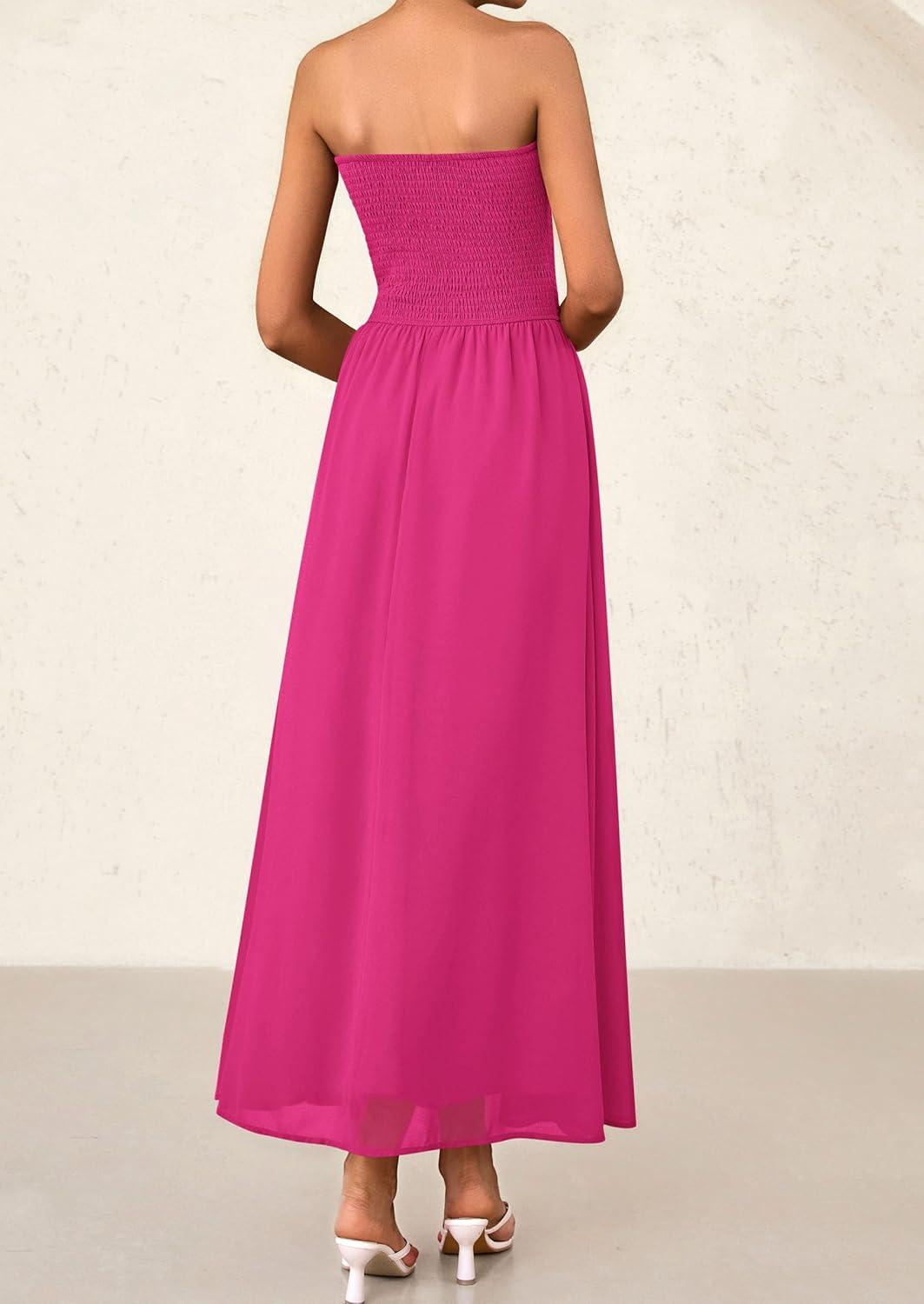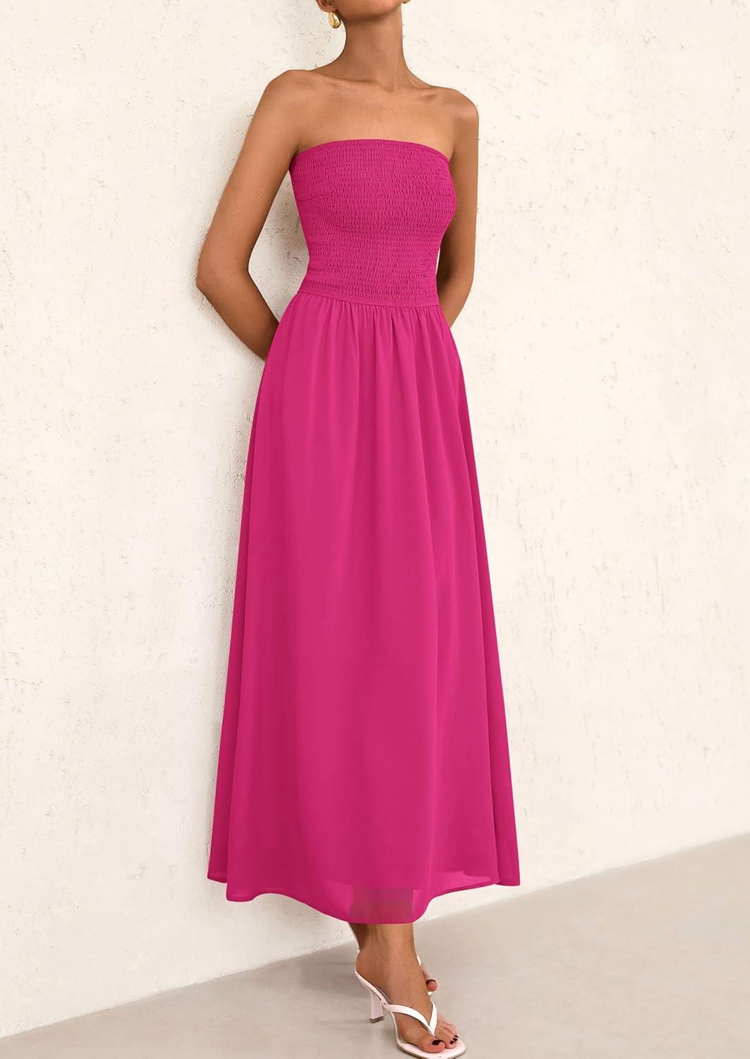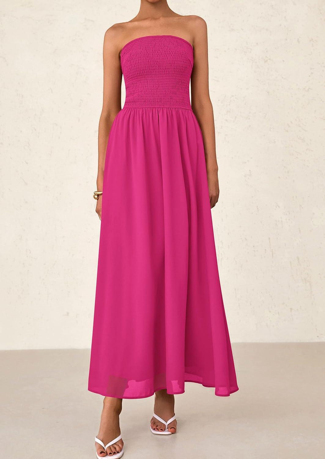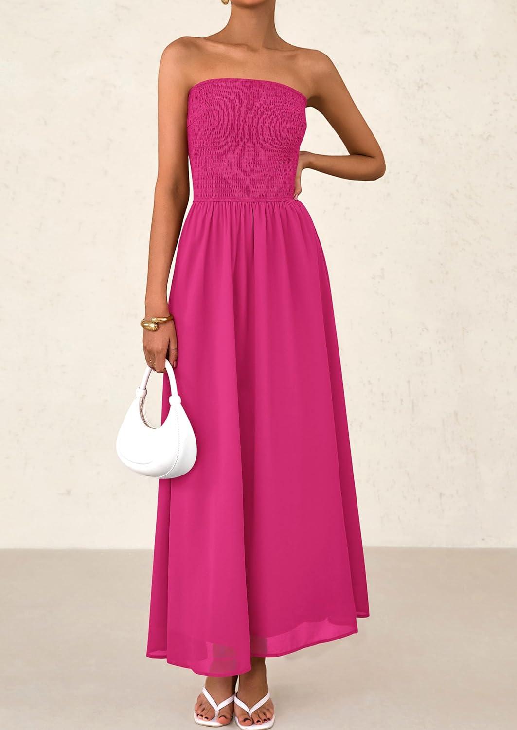 PRETTYGARDEN Women’s Strapless Wedding Guest Maxi Dresses 2025 Summer Trendy Elegant Classy Smocked Tube Long Flowy Sundress(Pink)