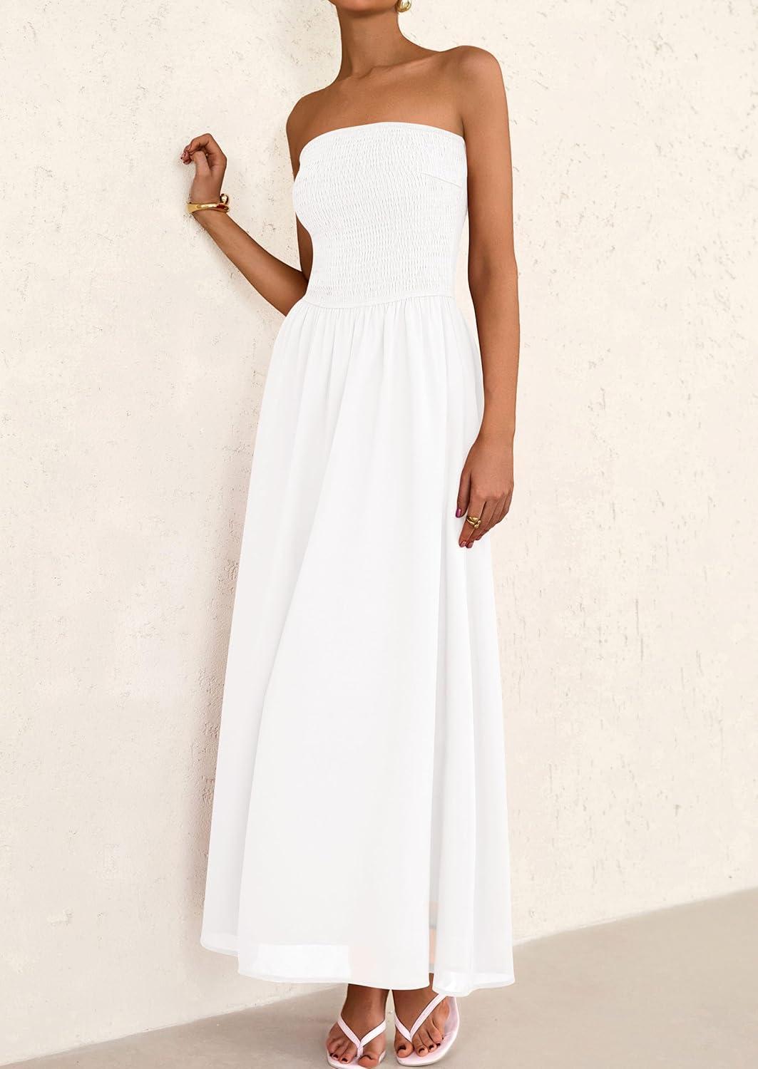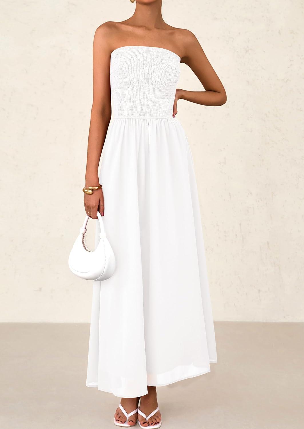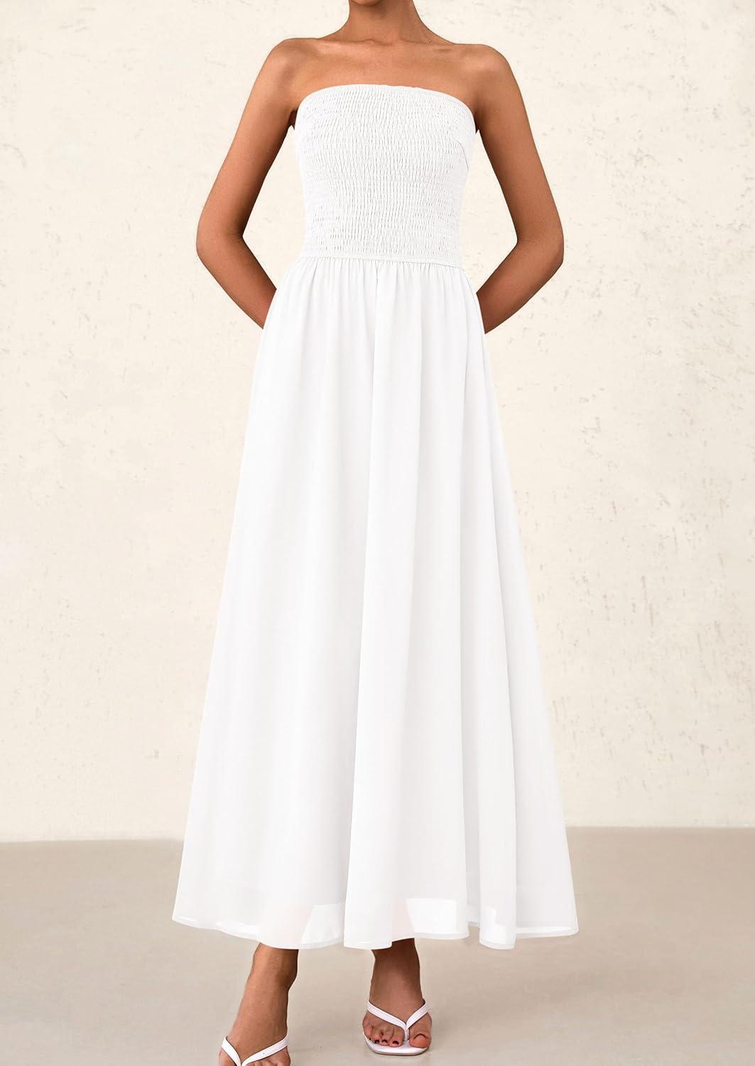 PRETTYGARDEN Women's Strapless Wedding Guest Maxi Dresses 2025 Summer Trendy Elegant Classy Smocked Tube Long Flowy Sundress(White)
