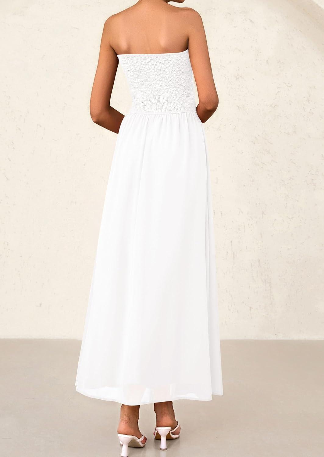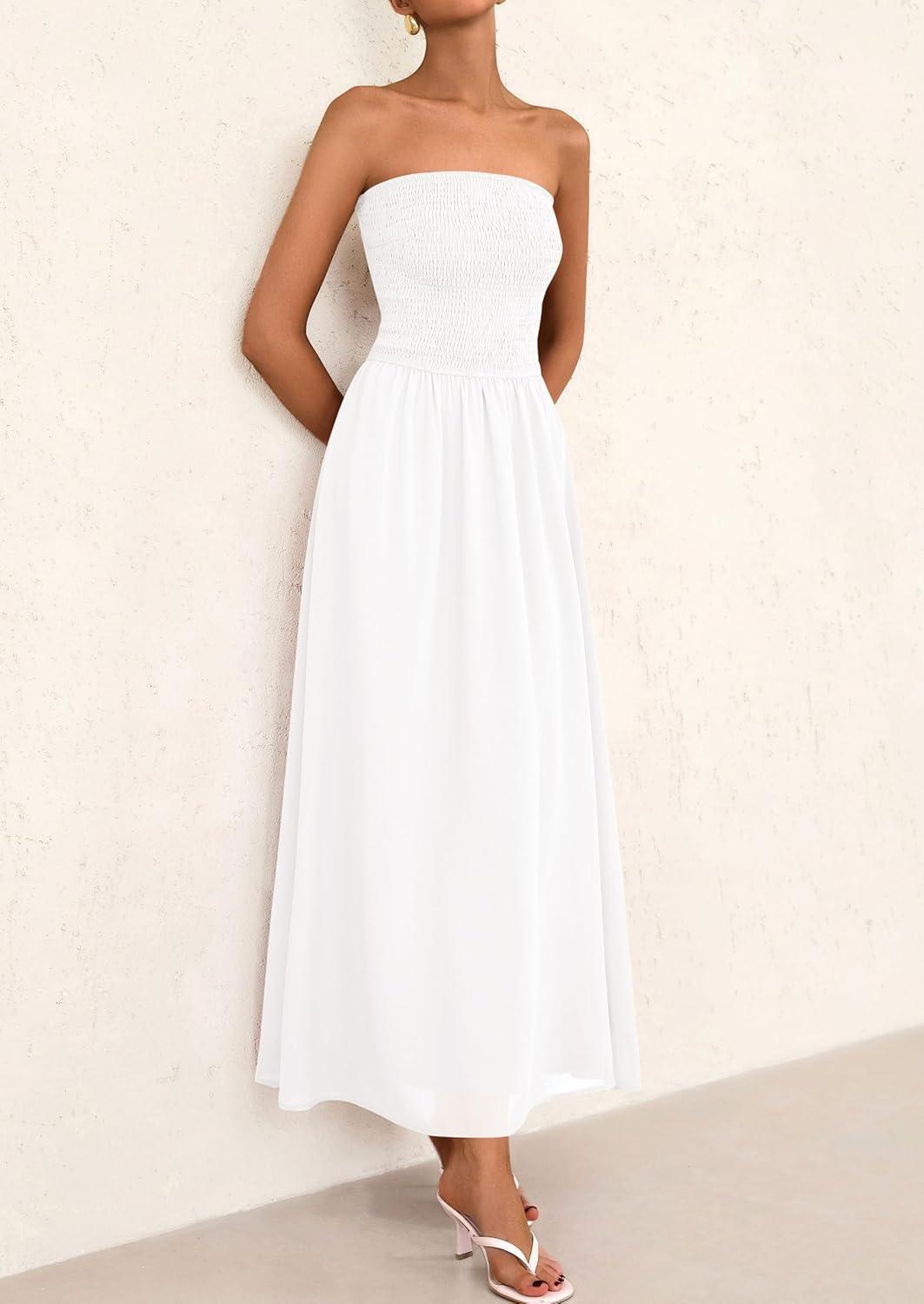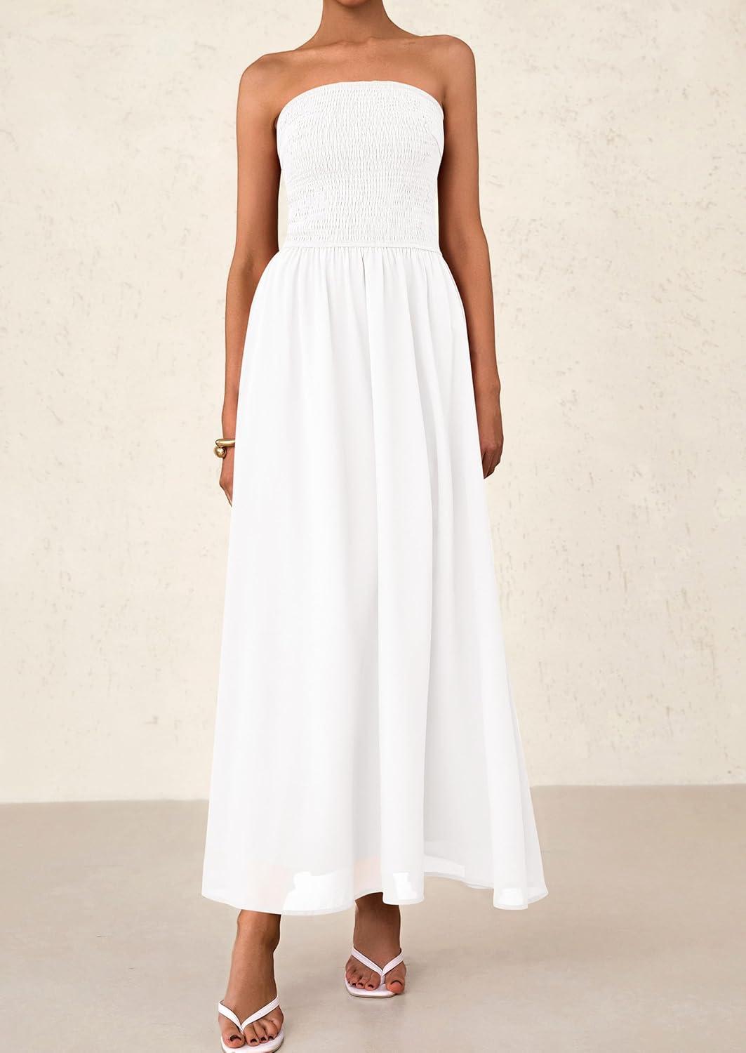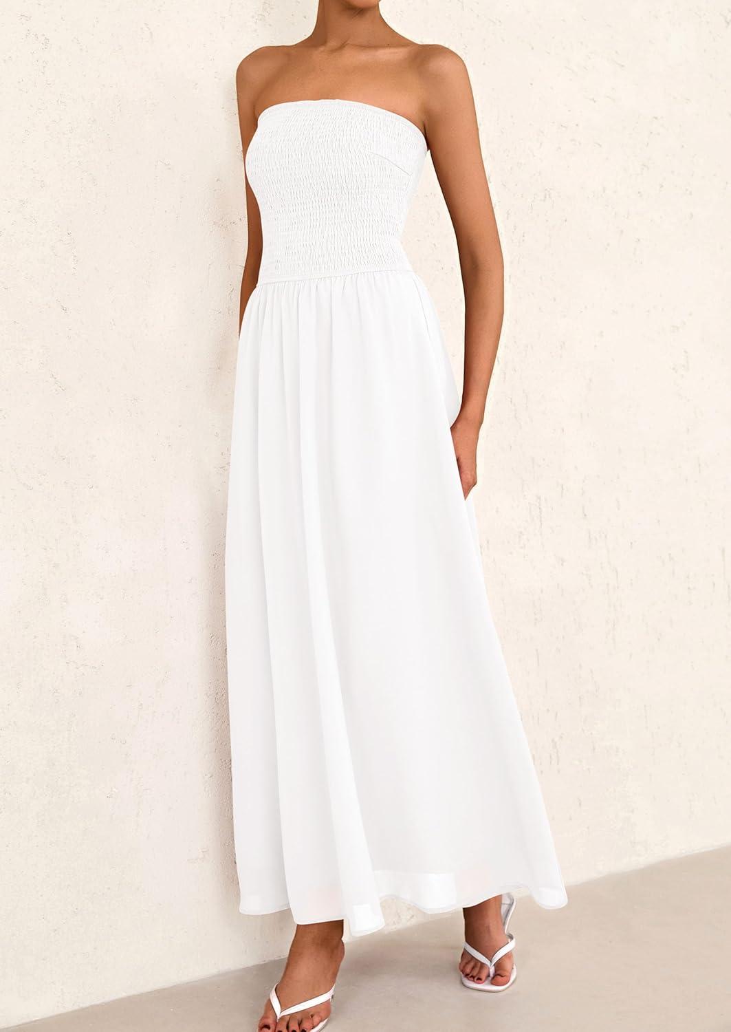 PRETTYGARDEN Women's Strapless Wedding Guest Maxi Dresses 2025 Summer Trendy Elegant Classy Smocked Tube Long Flowy Sundress(White)