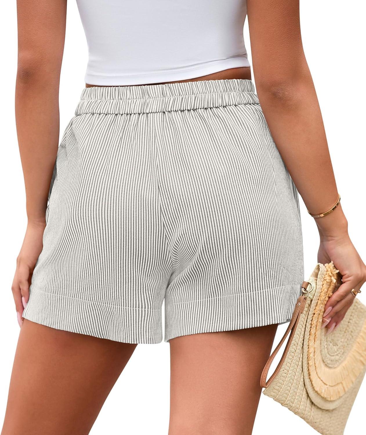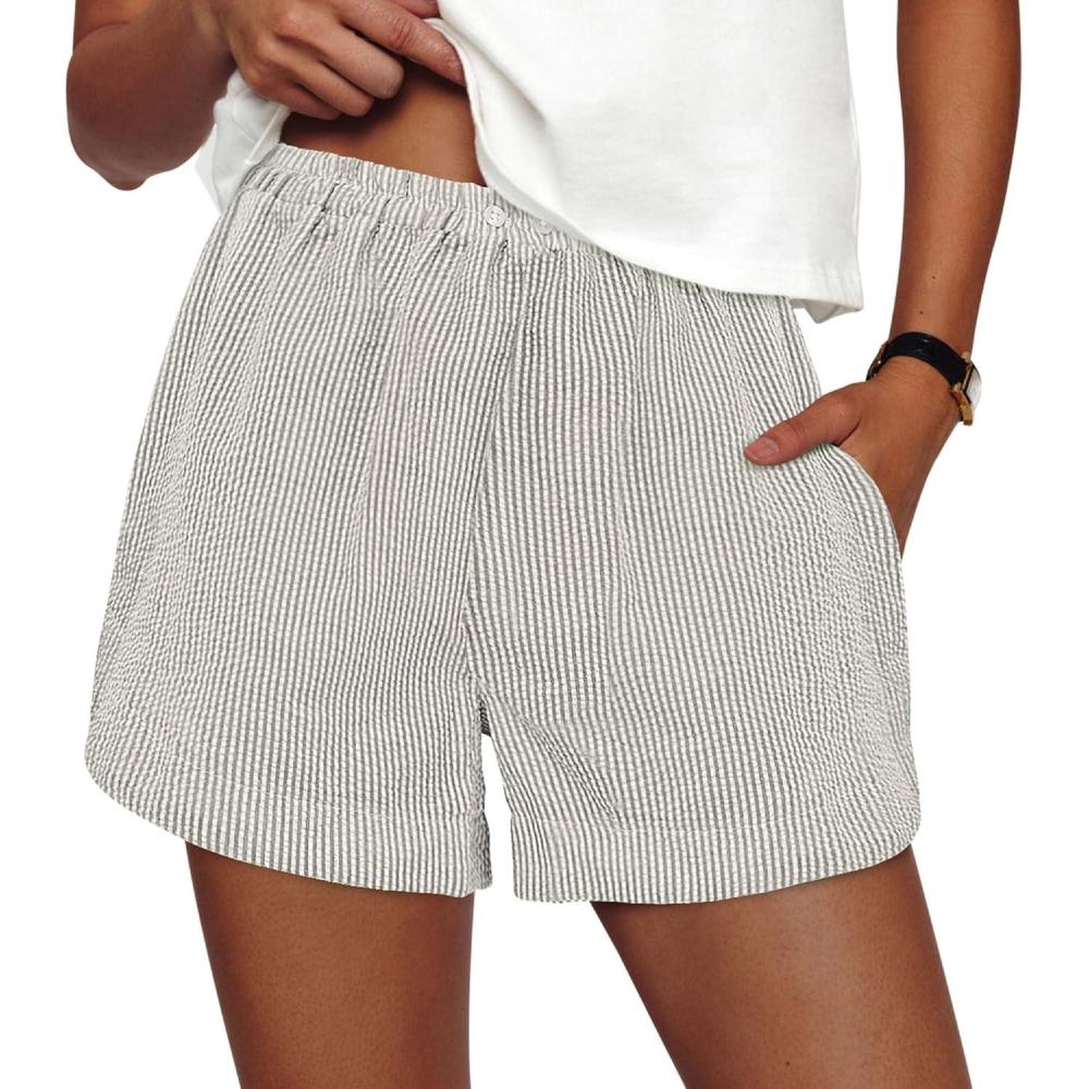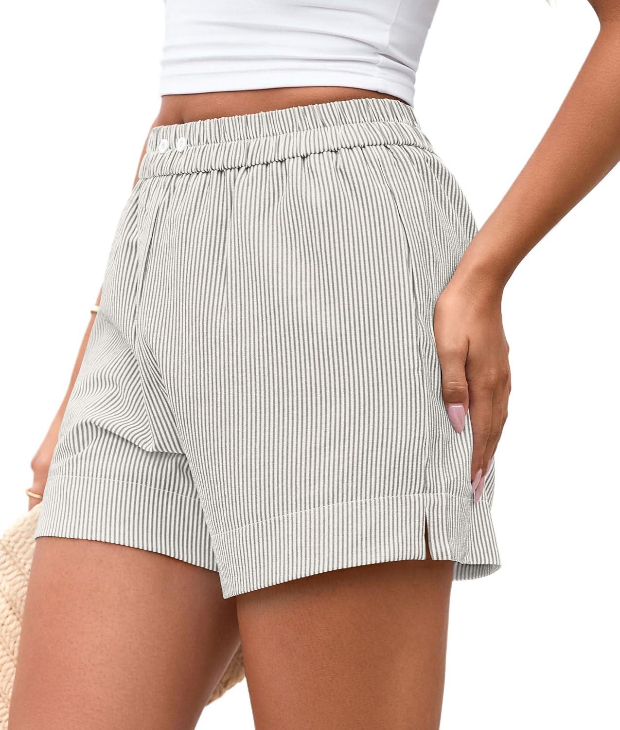 imagePRETTYGARDEN Womens Striped Boxer Shorts Summer 2025 Trendy Casual Elastic Waist Lounge Sleep Pajama Bottoms Beach ShortsStriped Grey Blue White