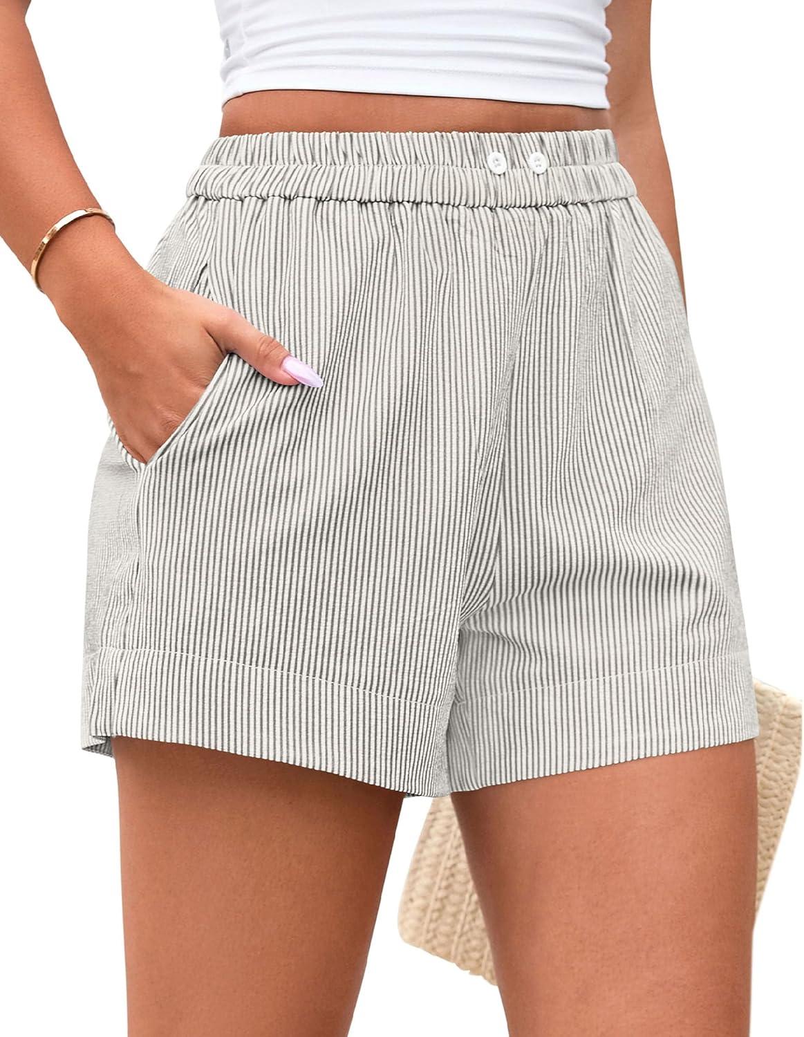 PRETTYGARDEN Women’s Striped Boxer Shorts Summer 2025 Trendy Casual Elastic Waist Lounge Sleep Pajama Bottoms Beach Shorts(Striped Khaki White)