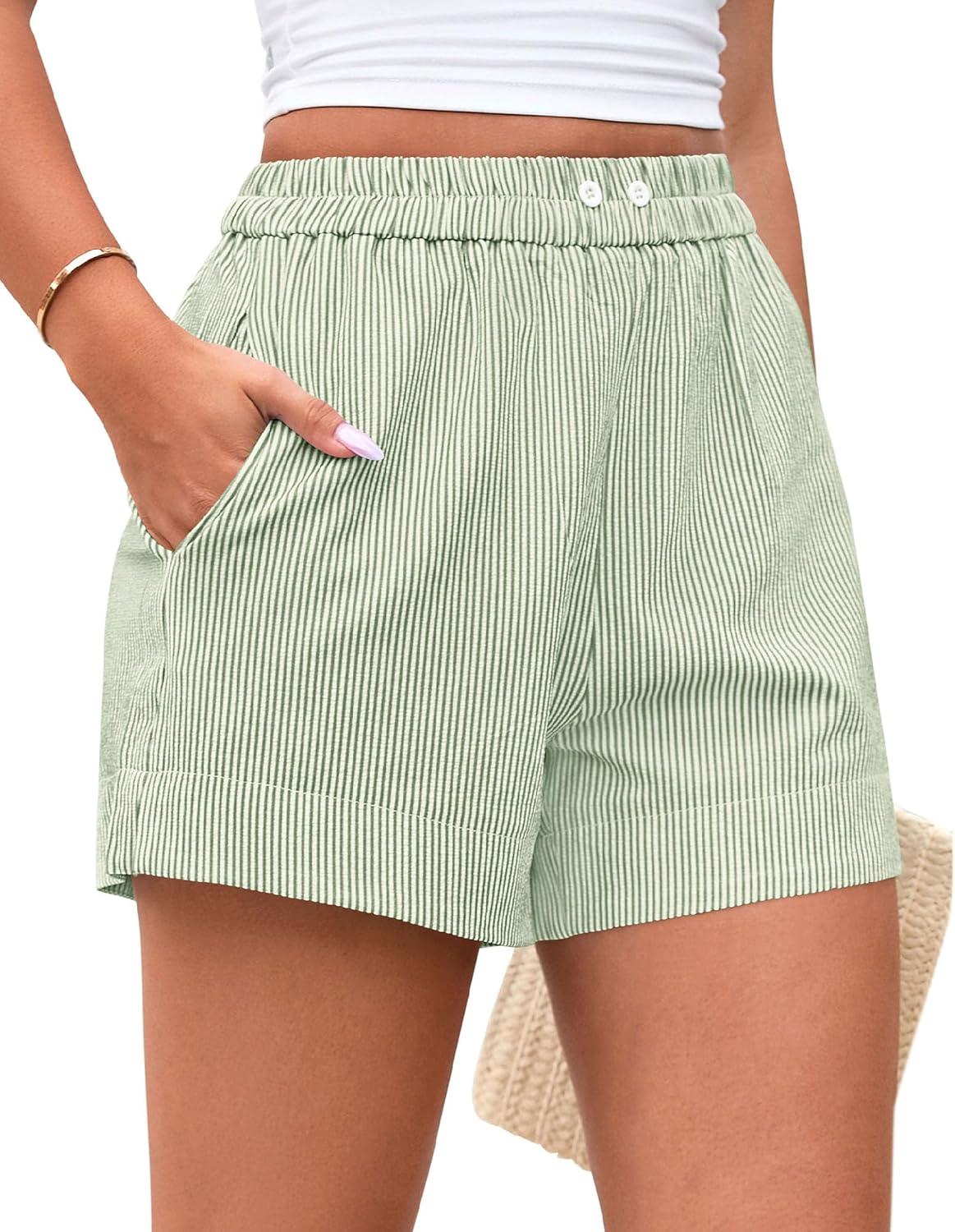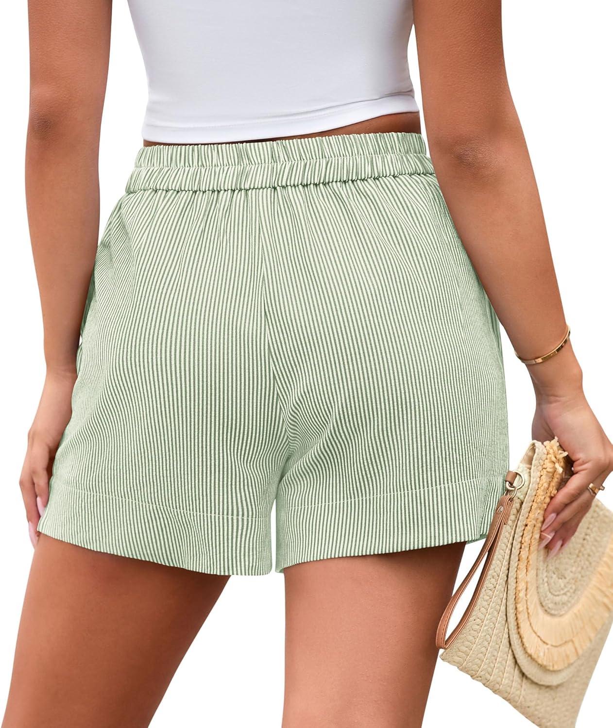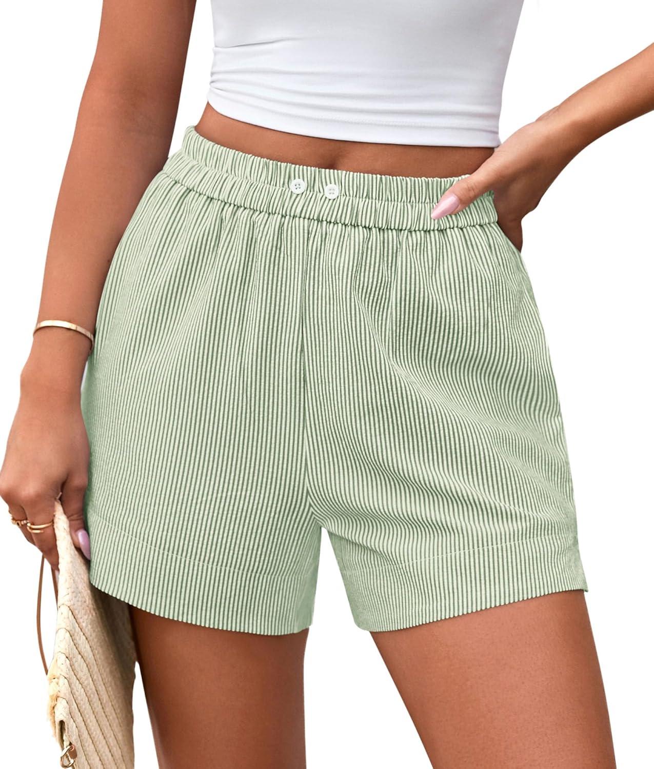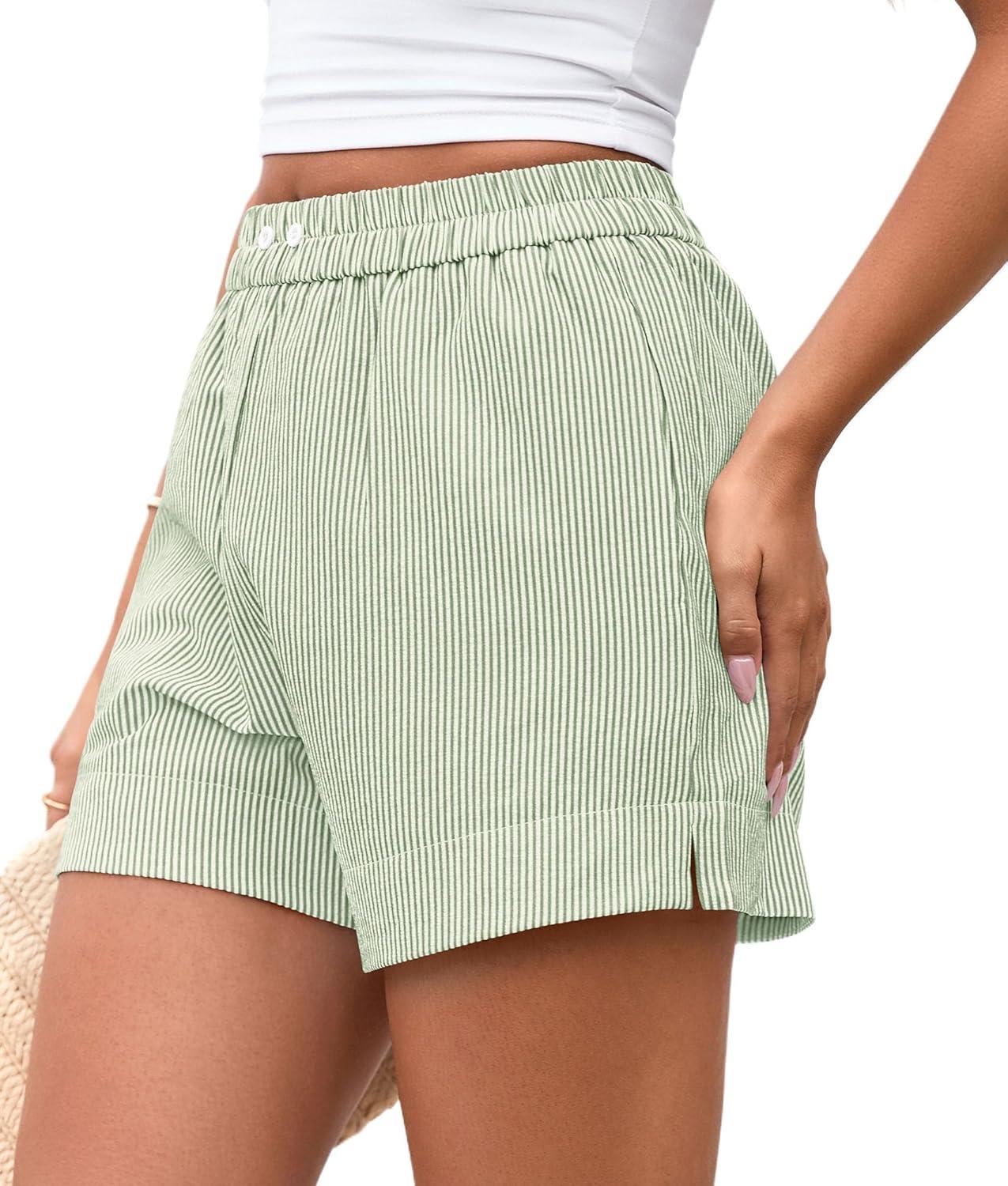 PRETTYGARDEN Women’s Striped Boxer Shorts Summer 2025 Trendy Casual Elastic Waist Lounge Sleep Pajama Bottoms Beach Shorts(Striped Light Green White)