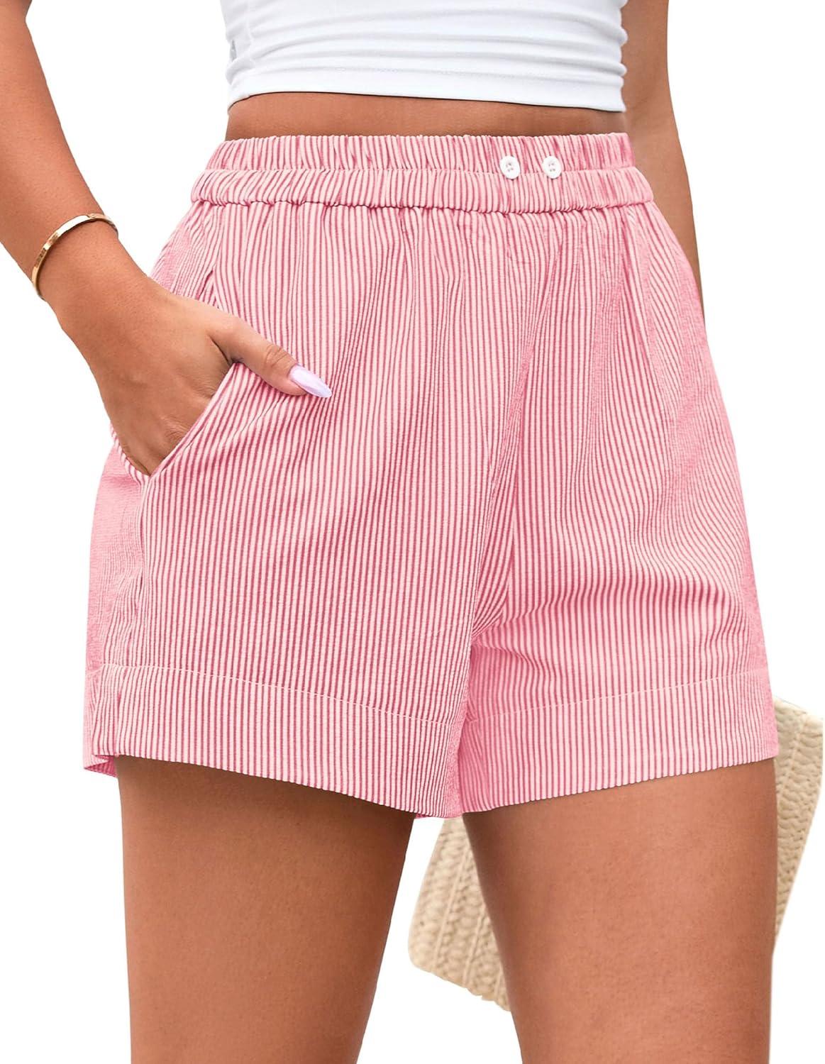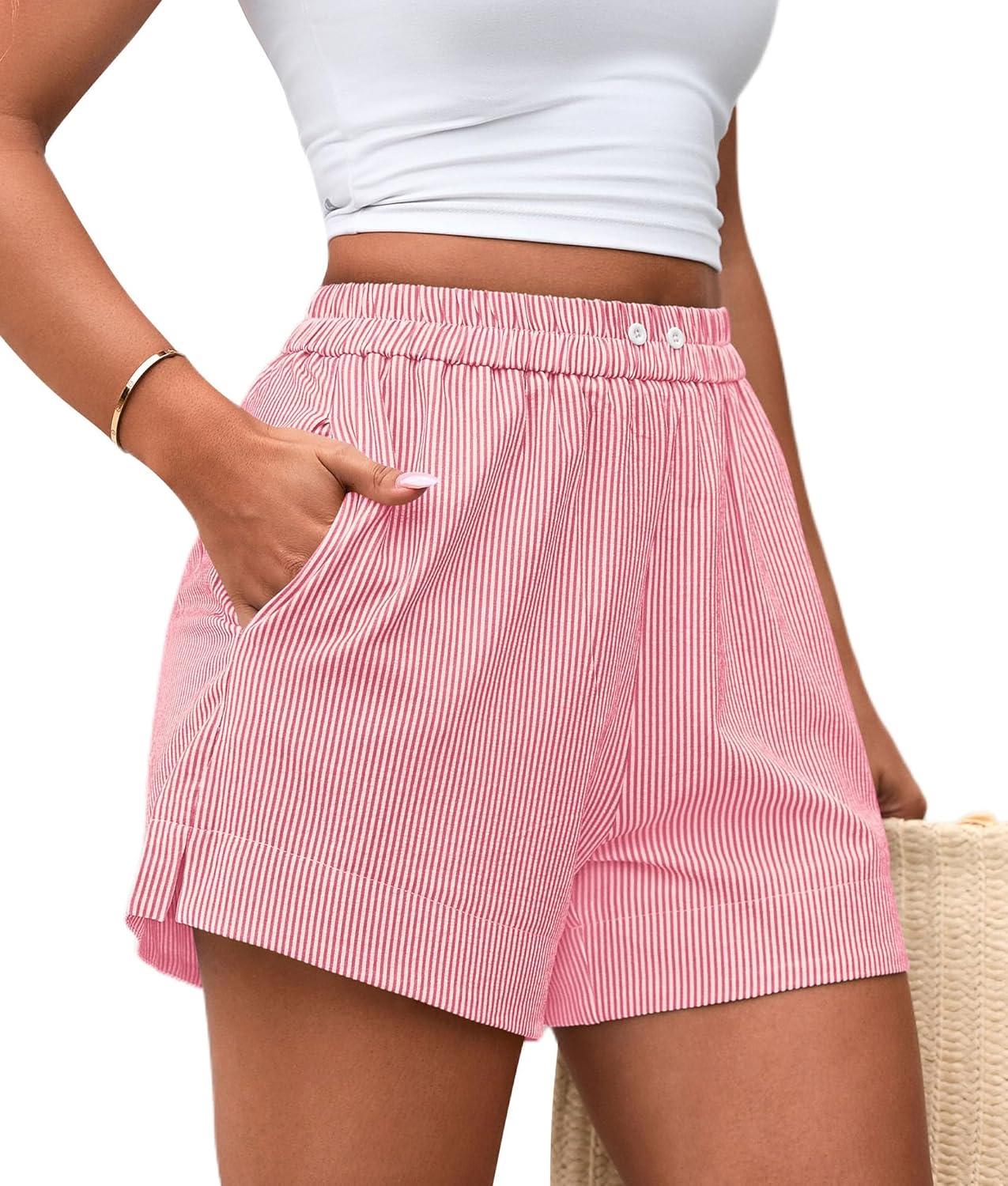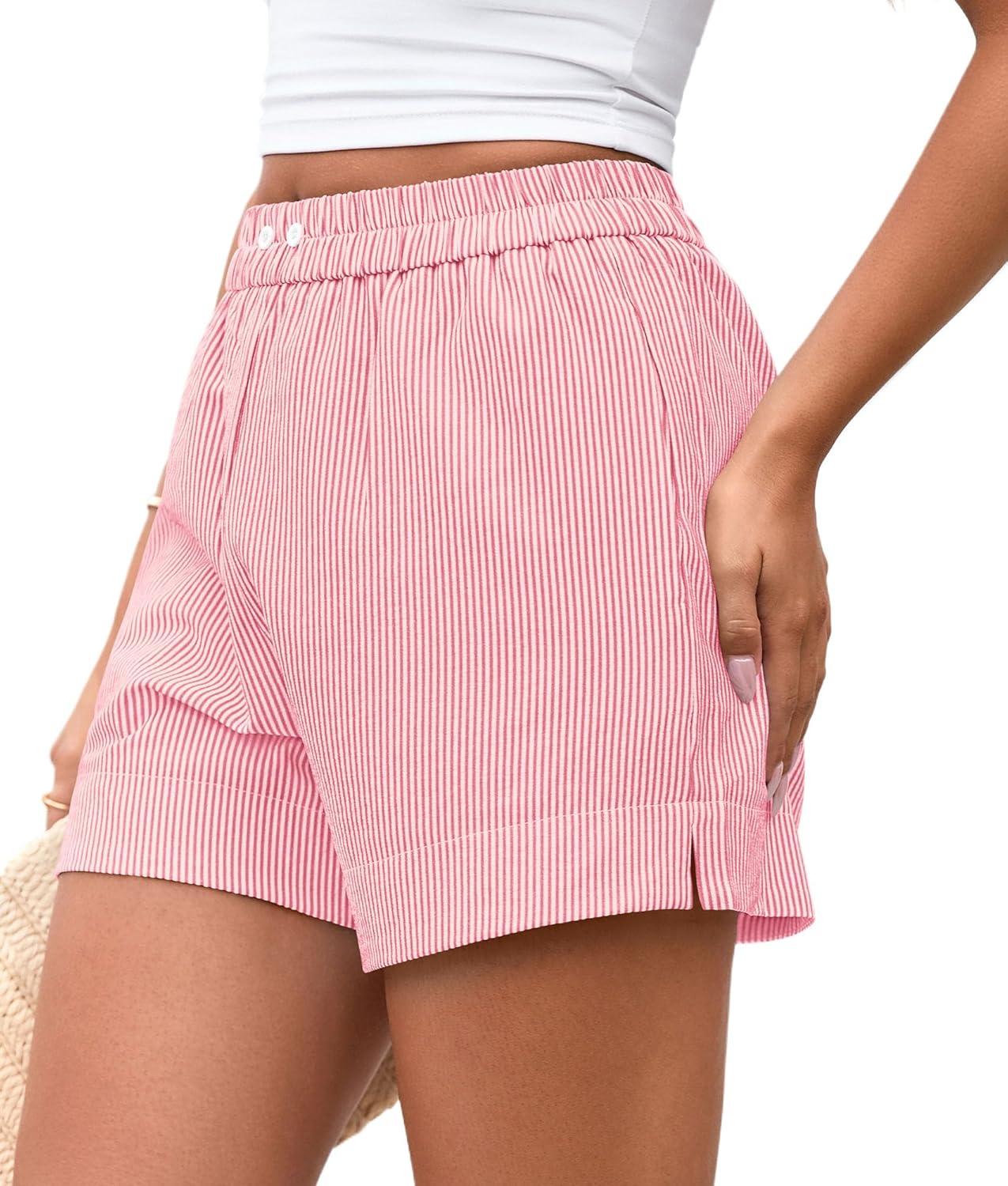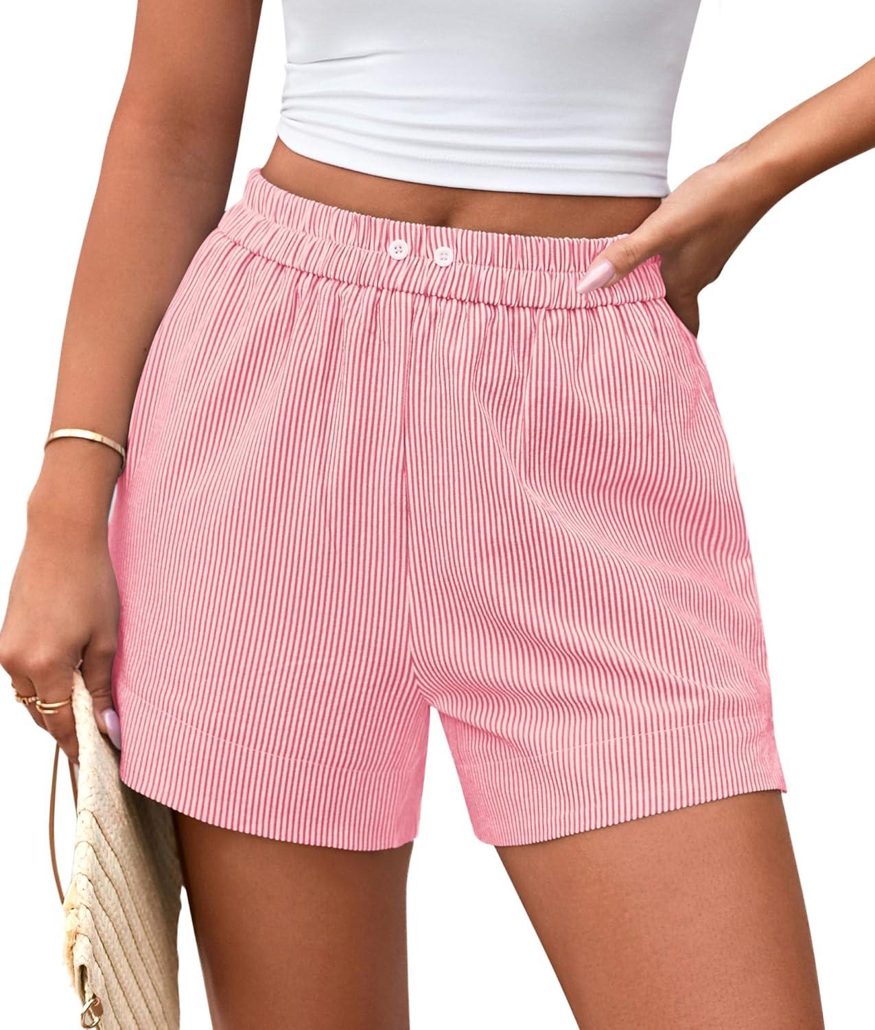 PRETTYGARDEN Women's Striped Boxer Shorts Summer 2025 Trendy Casual Elastic Waist Lounge Sleep Pajama Bottoms Beach Shorts(Striped Pink White)