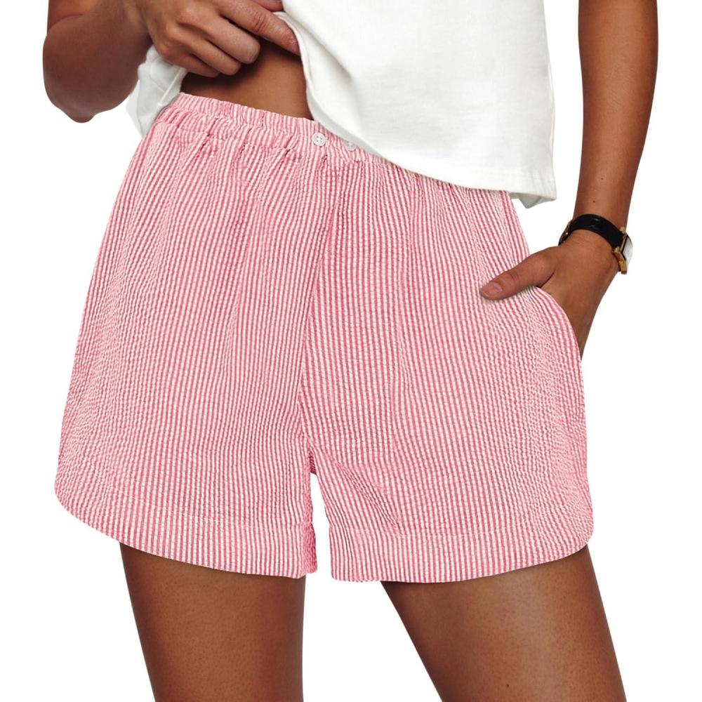 imagePRETTYGARDEN Womens Striped Boxer Shorts Summer 2025 Trendy Casual Elastic Waist Lounge Sleep Pajama Bottoms Beach ShortsStriped Light Pink White