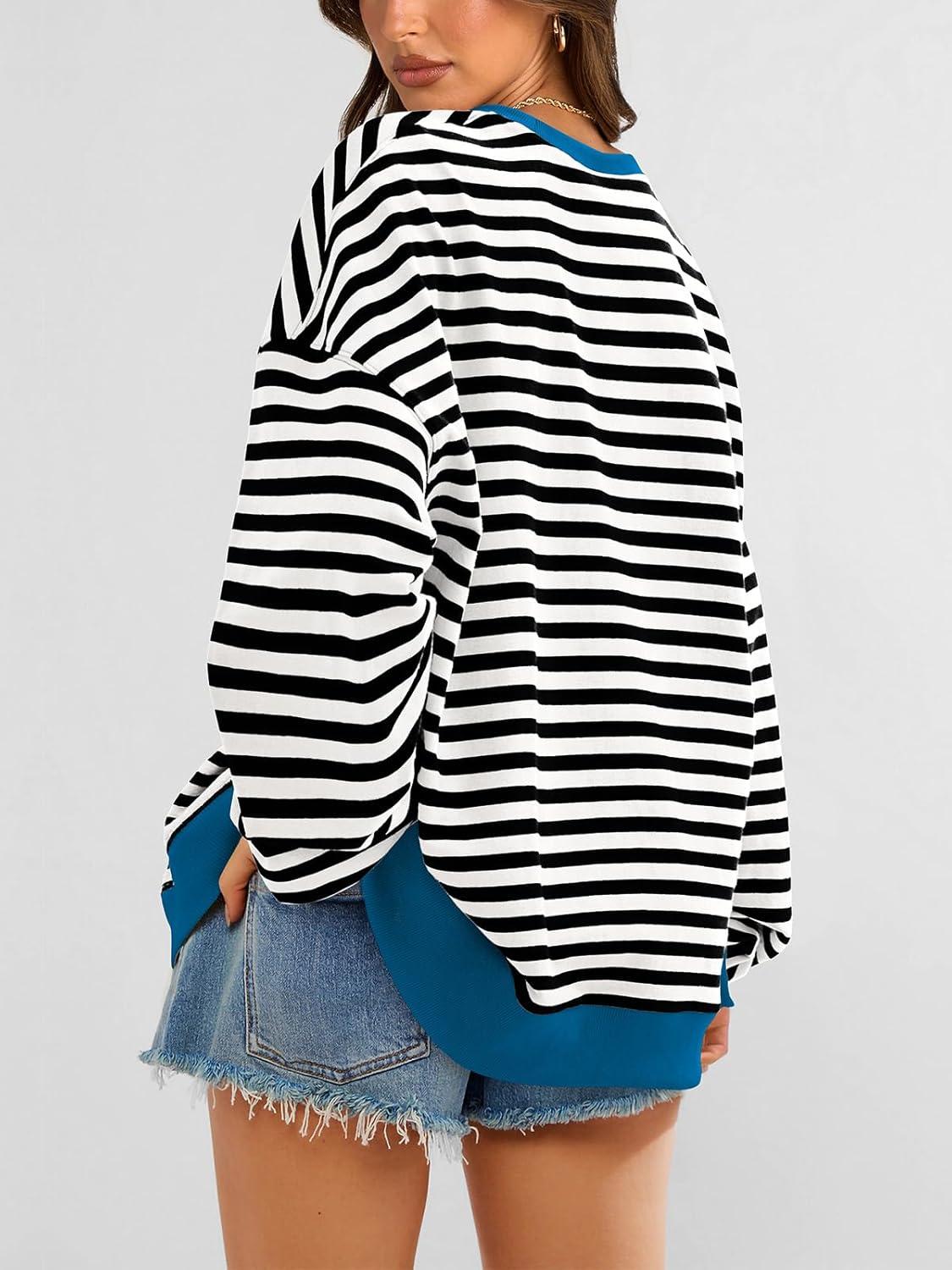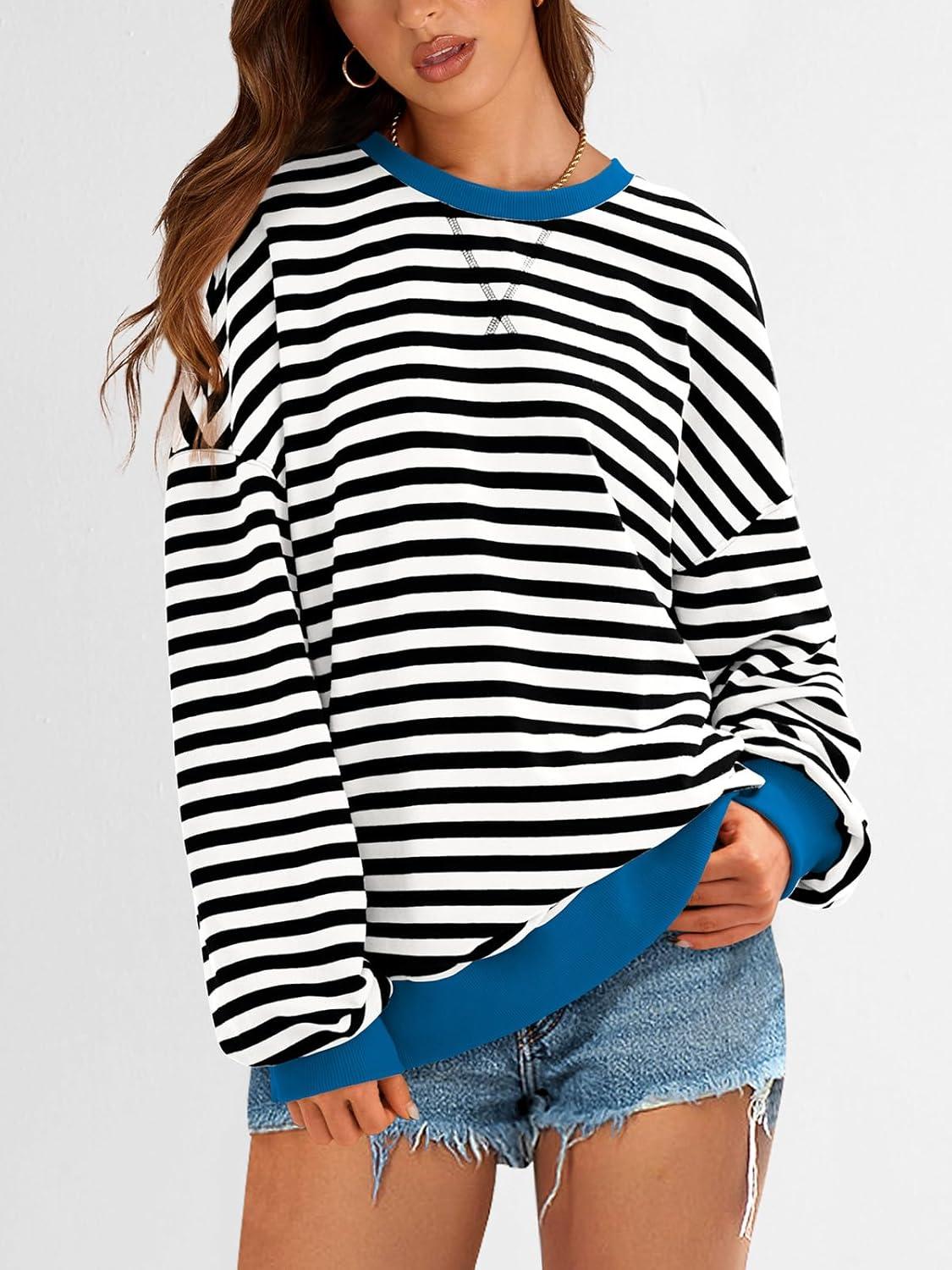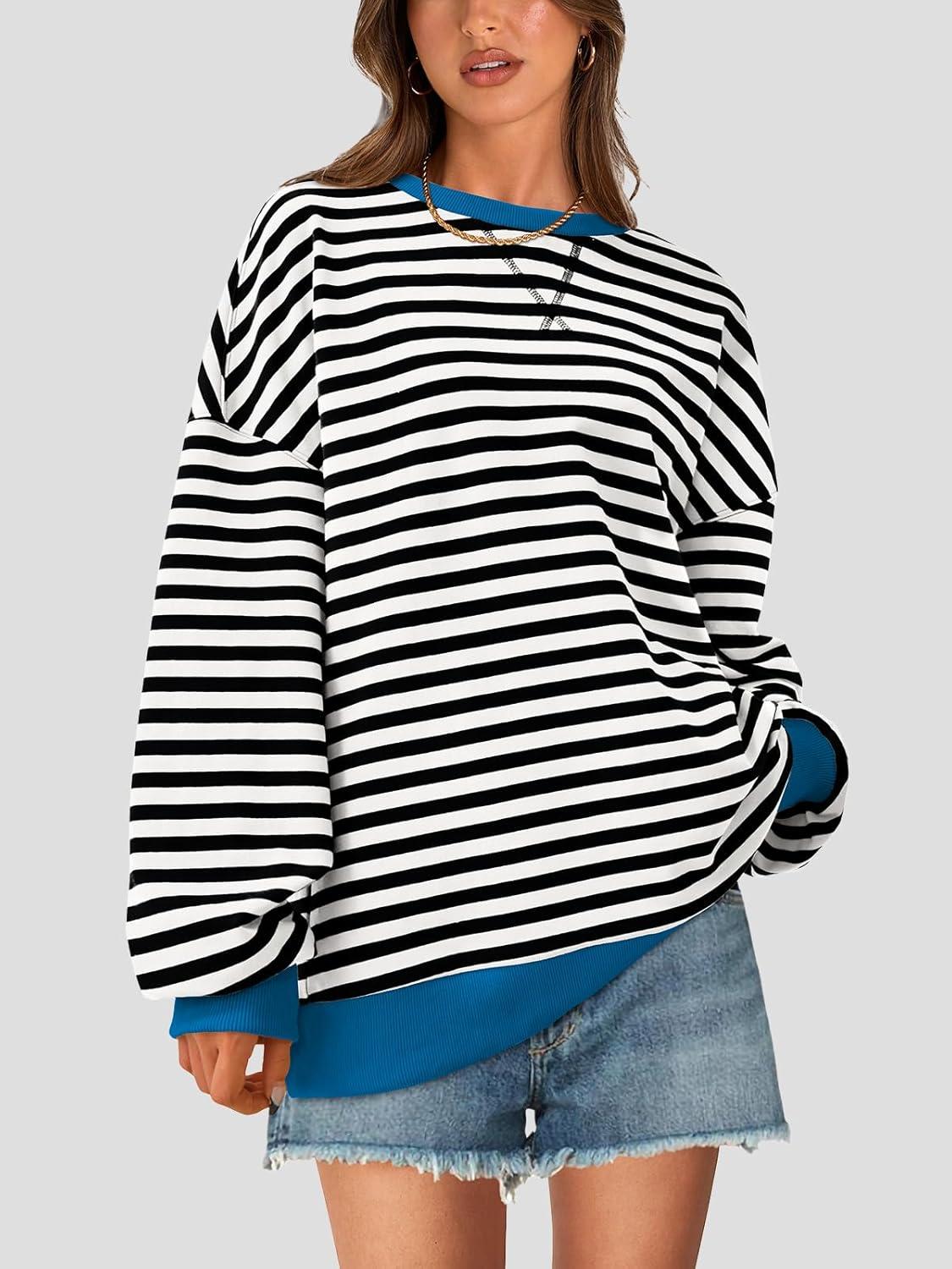 PRETTYGARDEN Womens Striped Oversized Sweatshirt Color Block Crew Neck Long Sleeve Casual Loose Pullover Top Y2K Clothes(Black White)