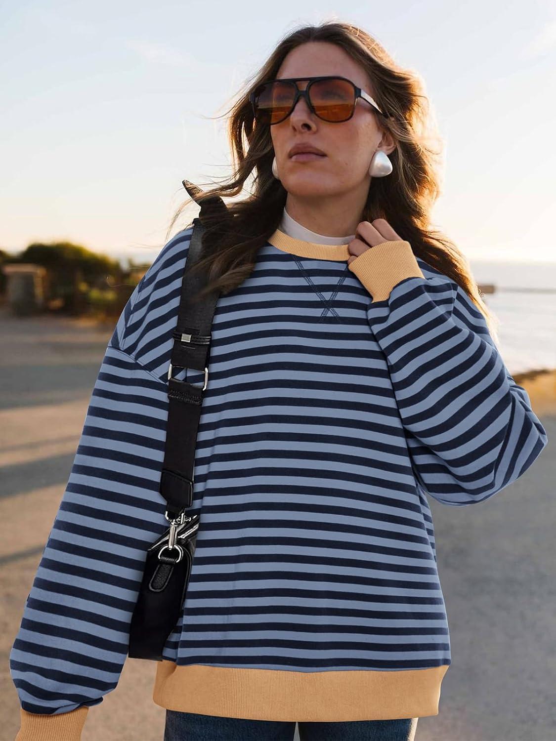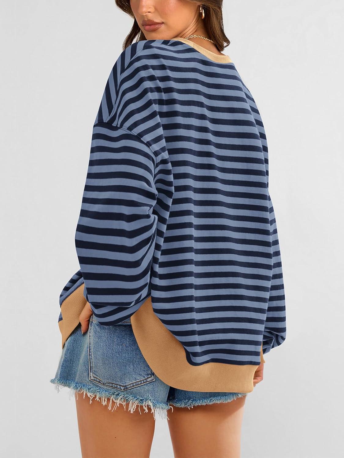 PRETTYGARDEN Womens Striped Oversized Sweatshirt Color Block Crew Neck Long Sleeve Casual Loose Pullover Top Y2K Clothes(Blue Navy)