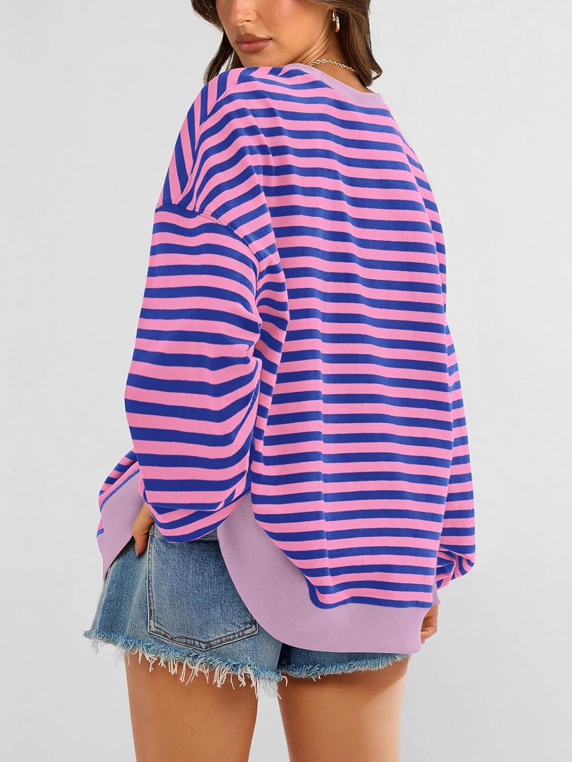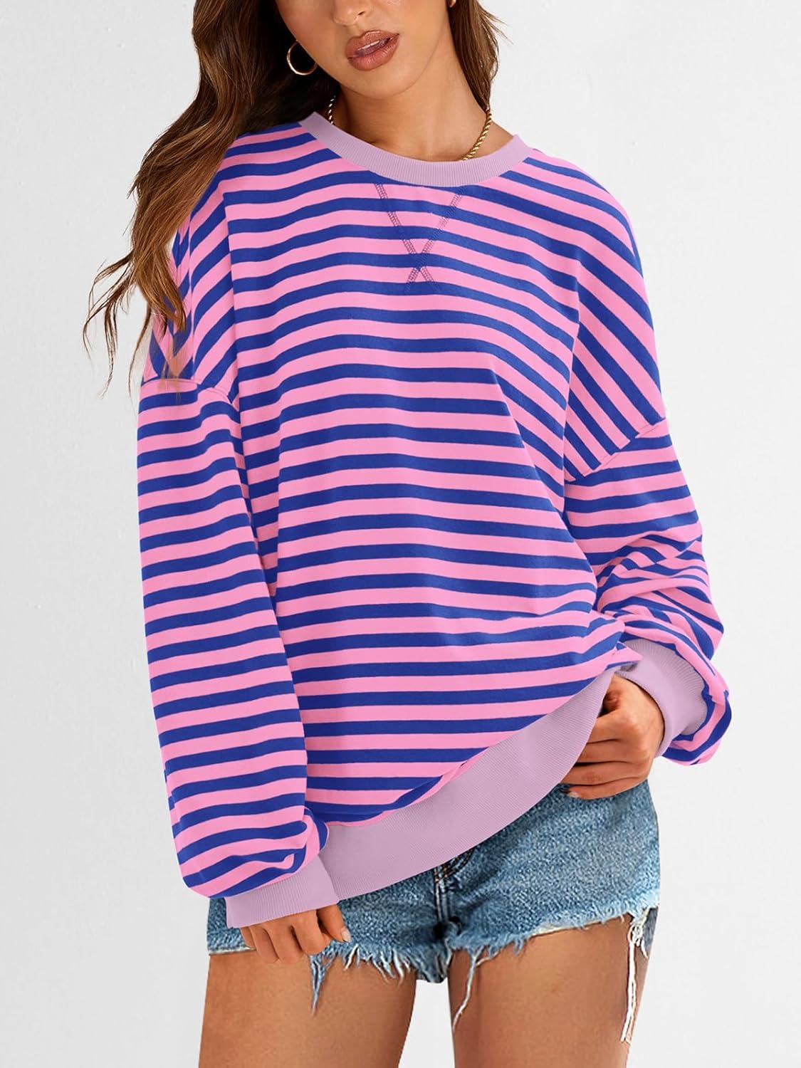 PRETTYGARDEN Womens Striped Oversized Sweatshirt Color Block Crew Neck Long Sleeve Casual Loose Pullover Top Y2K Clothes(Blue Pink)