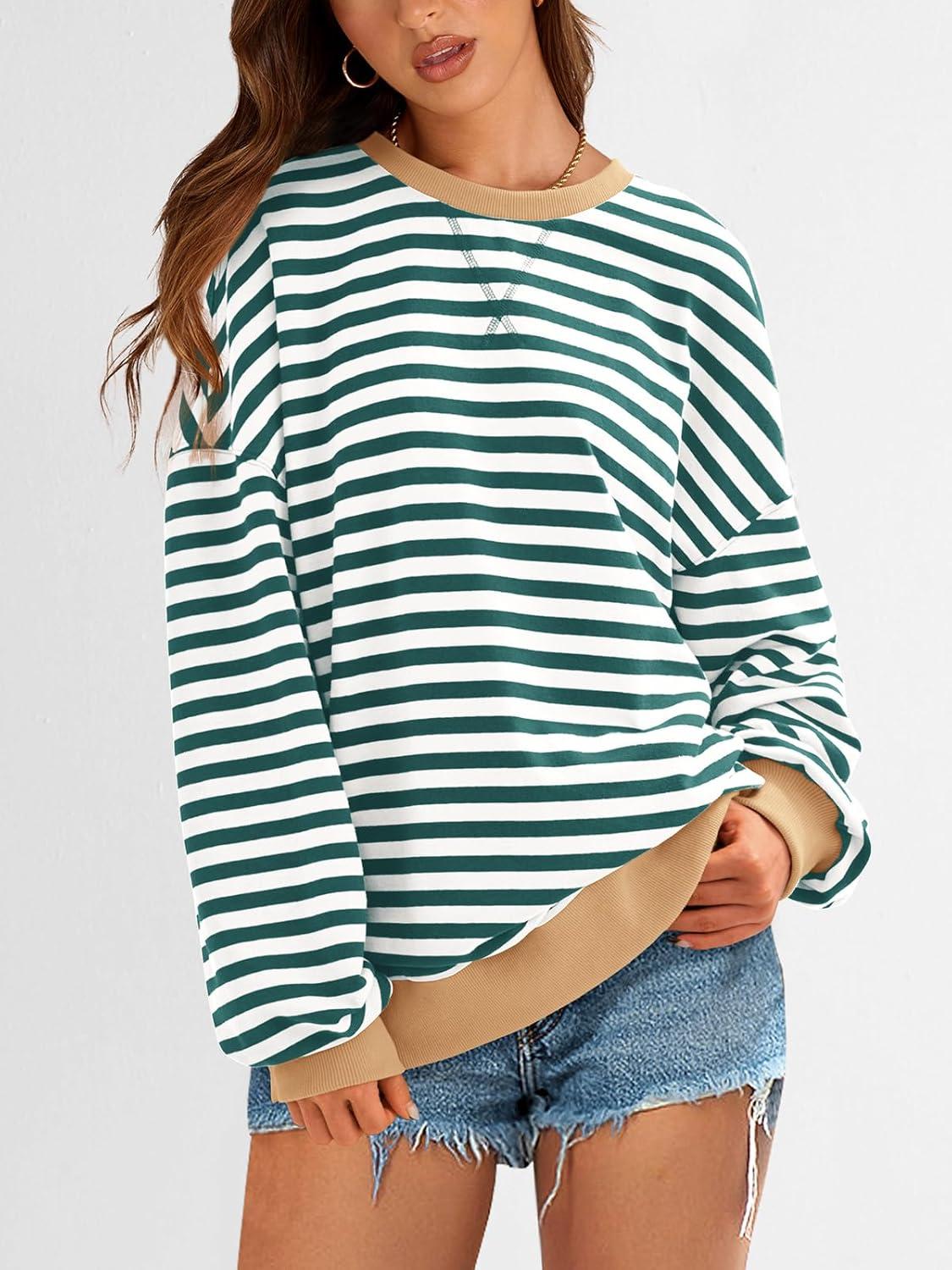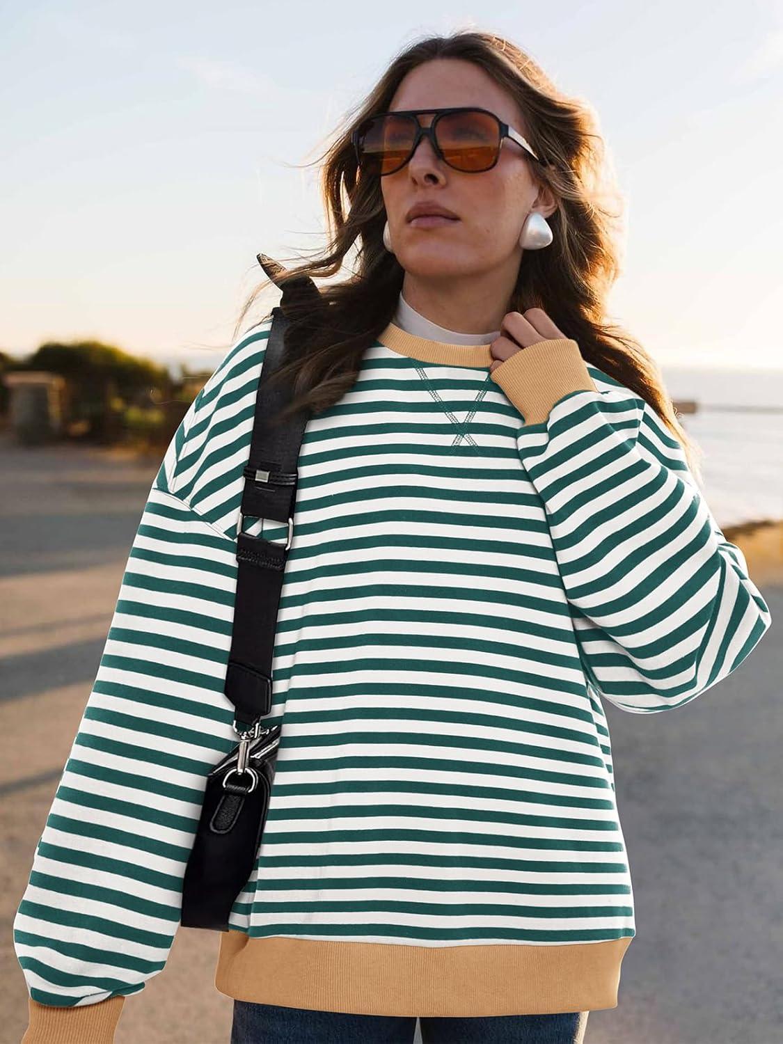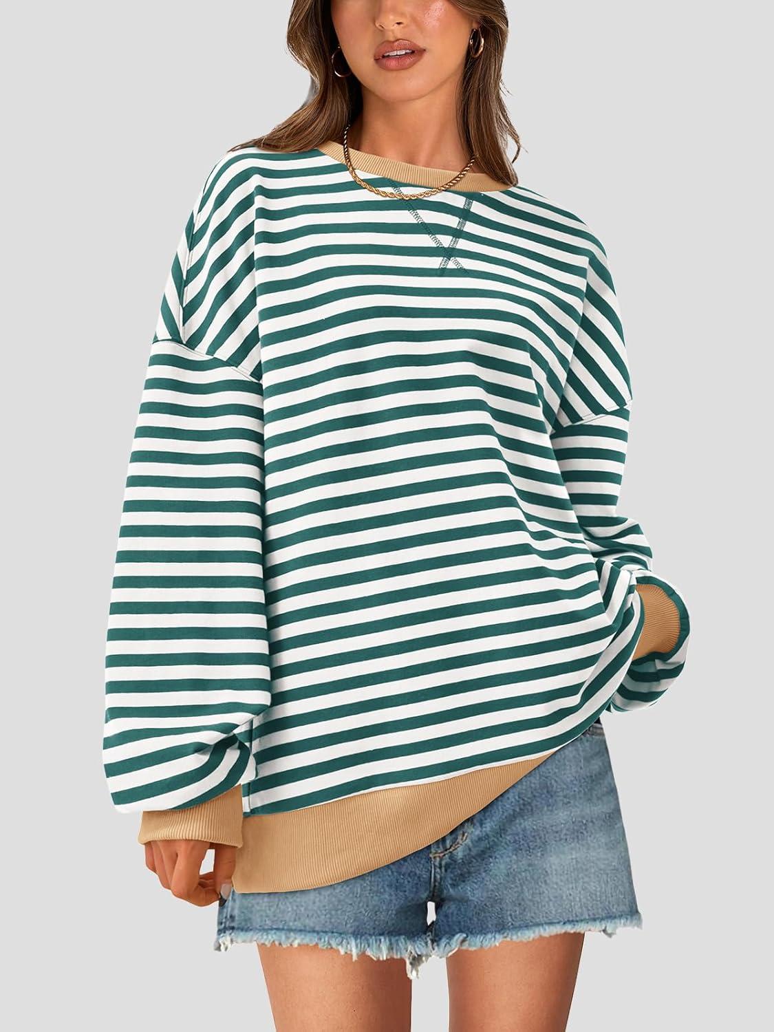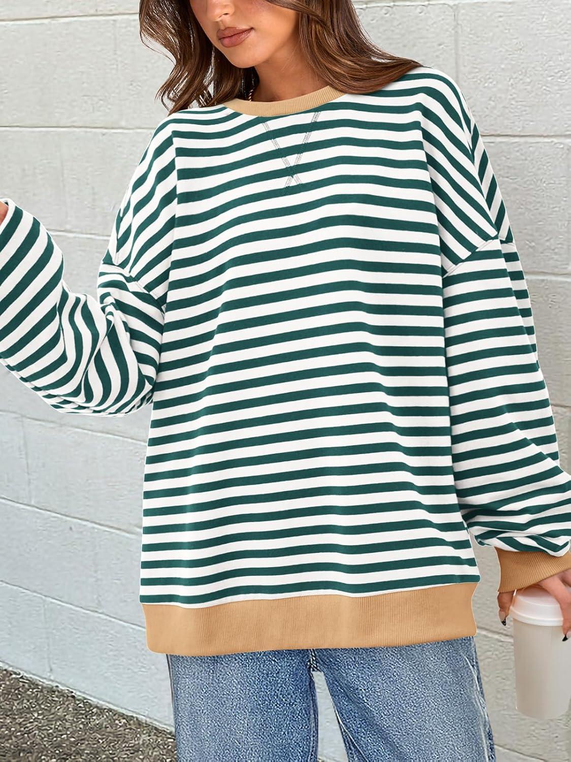 PRETTYGARDEN Womens Striped Oversized Sweatshirt Color Block Crew Neck Long Sleeve Casual Loose Pullover Top Y2K Clothes(Green White)