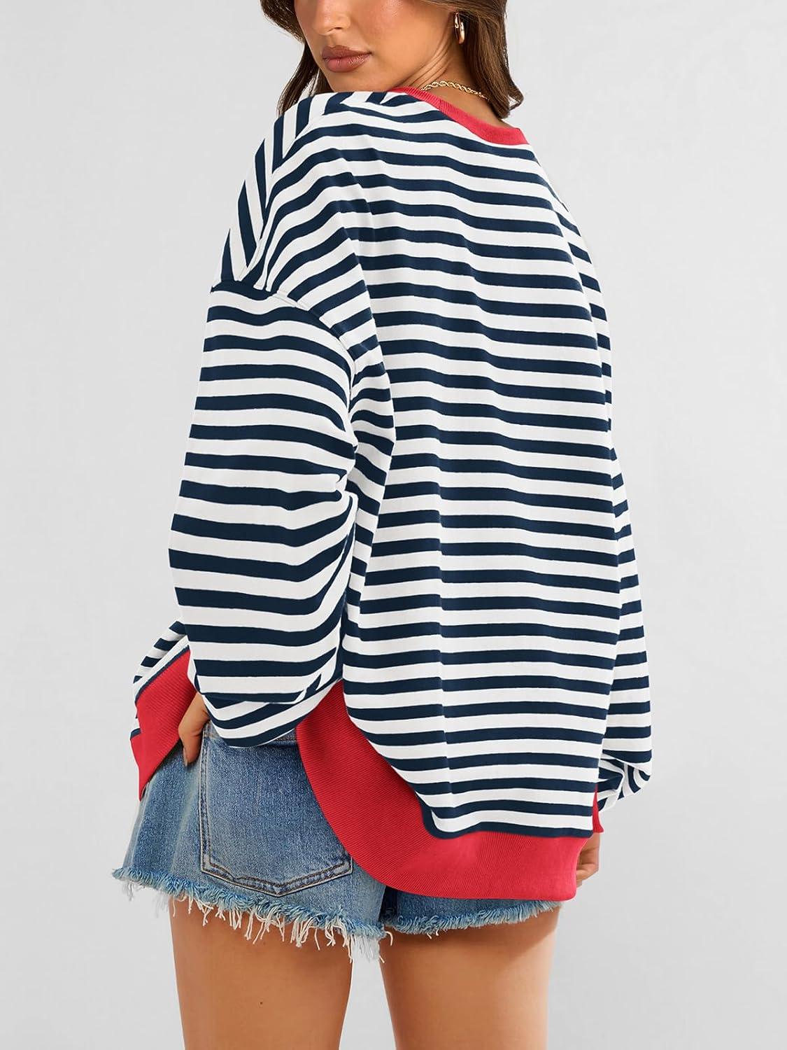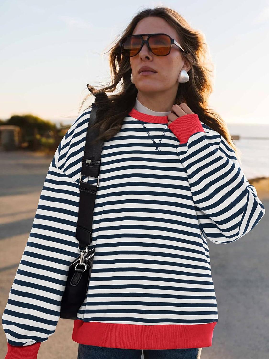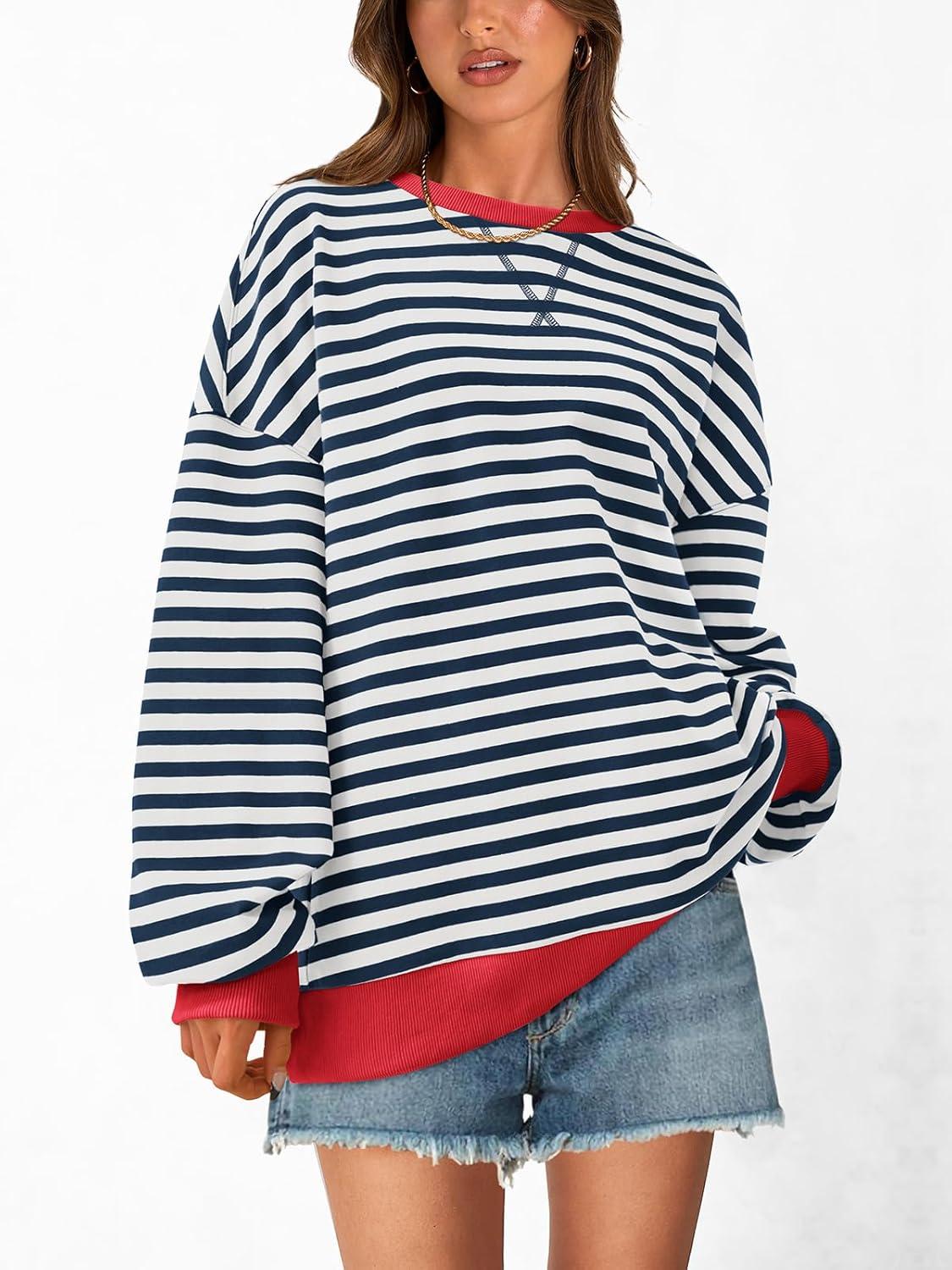 PRETTYGARDEN Womens Striped Oversized Sweatshirt Color Block Crew Neck Long Sleeve Casual Loose Pullover Top Y2K Clothes(Navy White)
